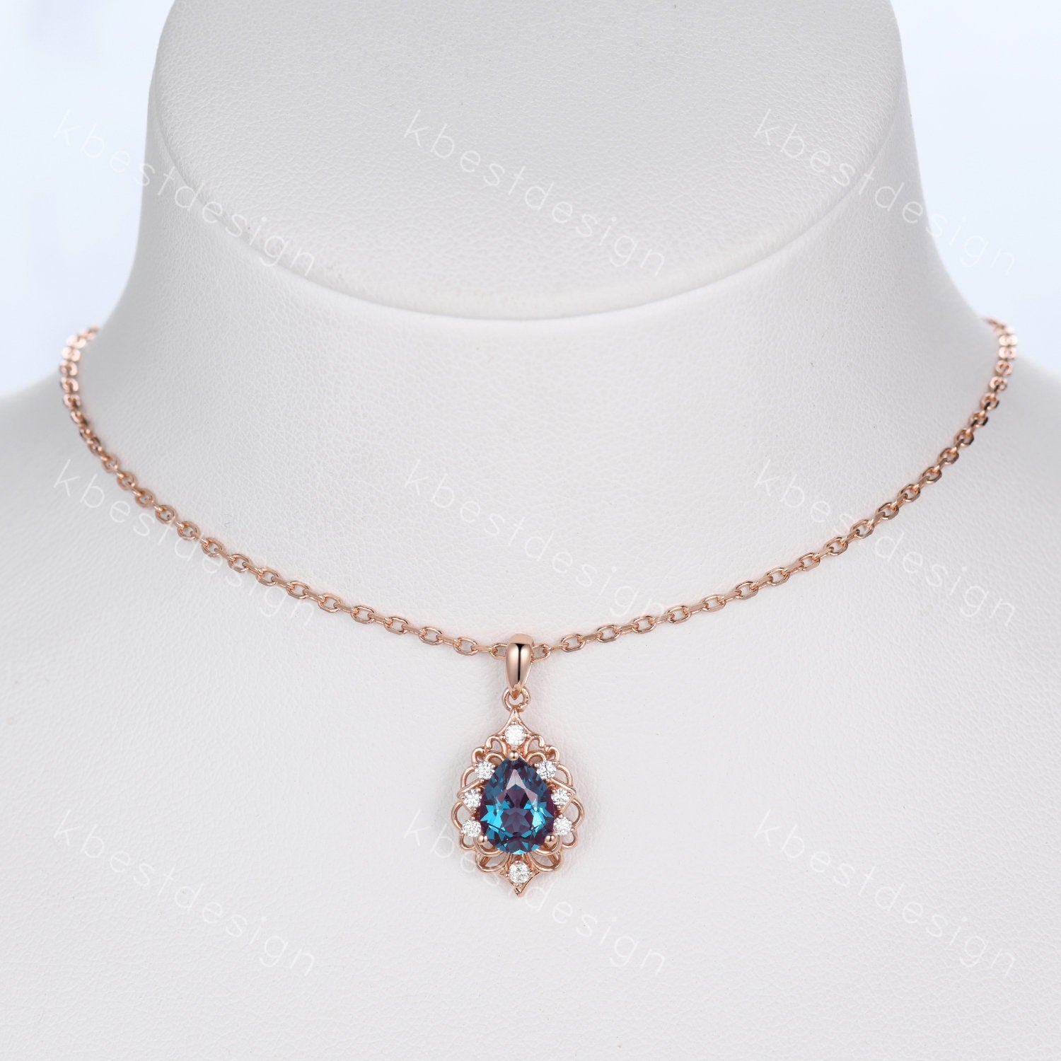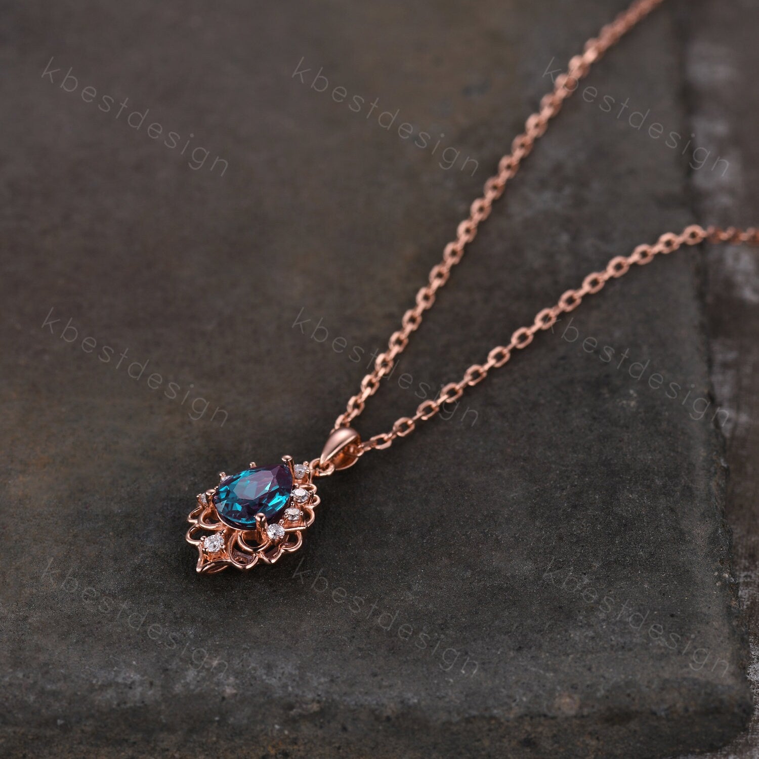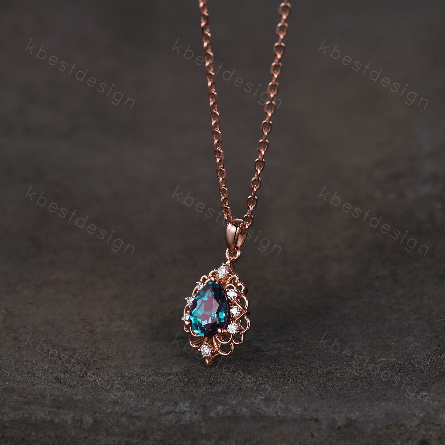 Vintage 1.5CT Alexandrite Necklace, Rose Gold Pear cut Alexandrite Pendant, June Birthstone Jewelry, Unique Art Deco Bridal Promise Gift