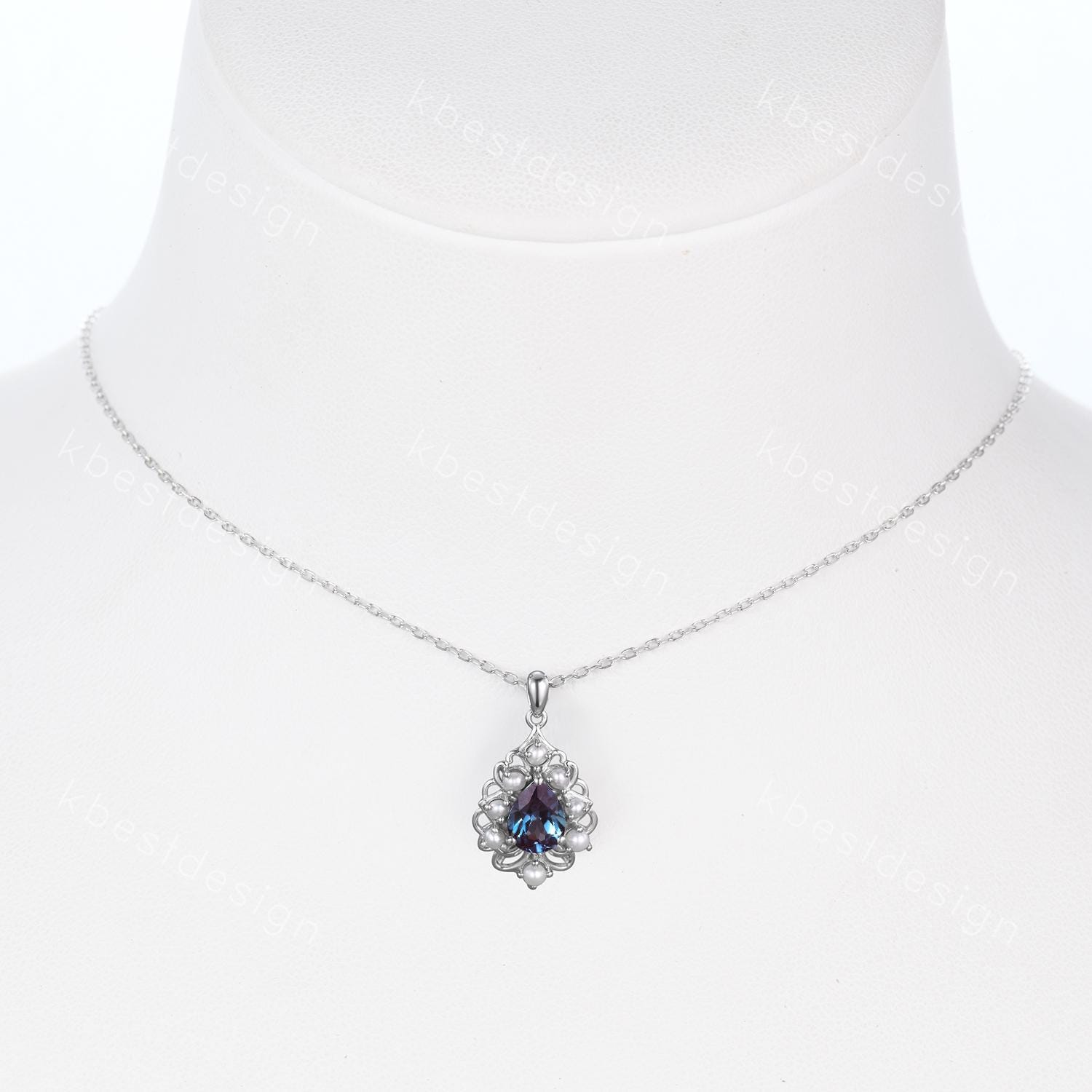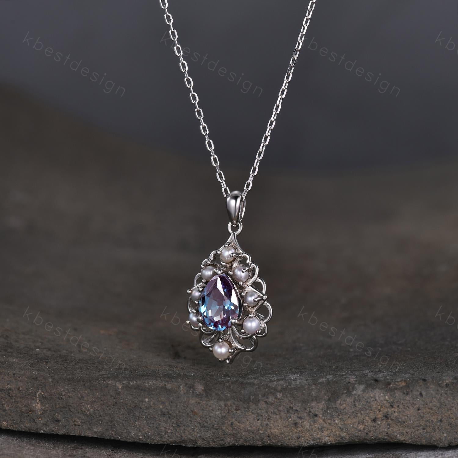This is a Vintage 1.5CT Alexandrite Necklace Sterling Silver Pearl Halo Pendant June Birthstone Jewelry Unique Art Deco Bridal Promise Necklace Gift. For those who are looking for agate jewelry which is handcrafted in details, this unique alexandrite necklace would be a perfect choice for you. Whether it be a Birthday gift for her, an anniversary gift her, or a celebration of yourself, this alexandrite jewelry is the perfect gift from the heart.