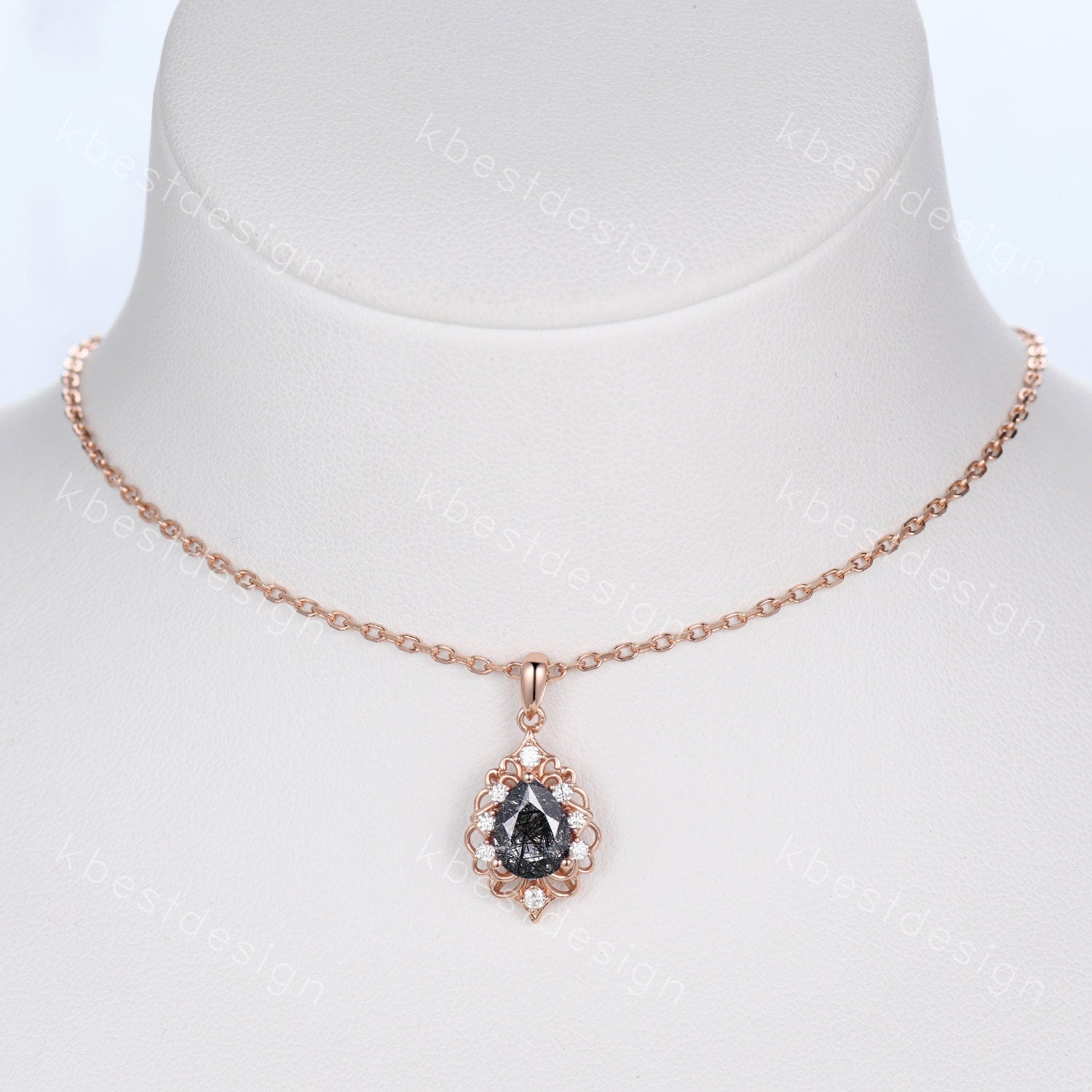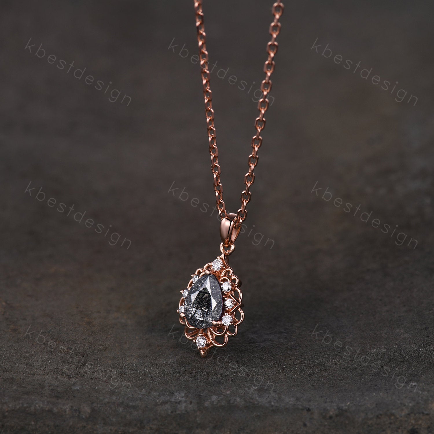 Vintage 1.5CT Black Rutilated Quartz Necklace, Rose Gold Pear cut Pendant, Black Gemstone Jewelry, Unique Art Deco Bridal Promise Gift