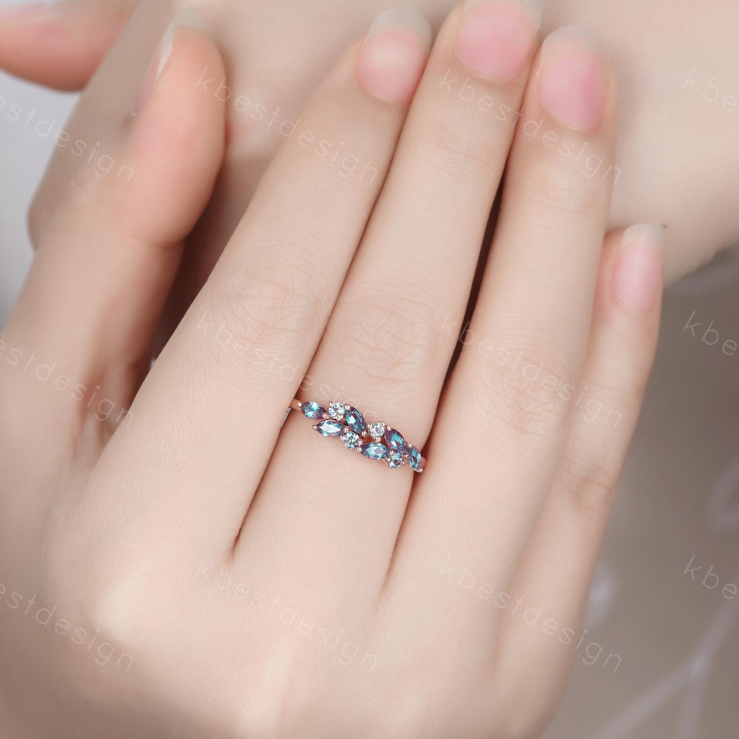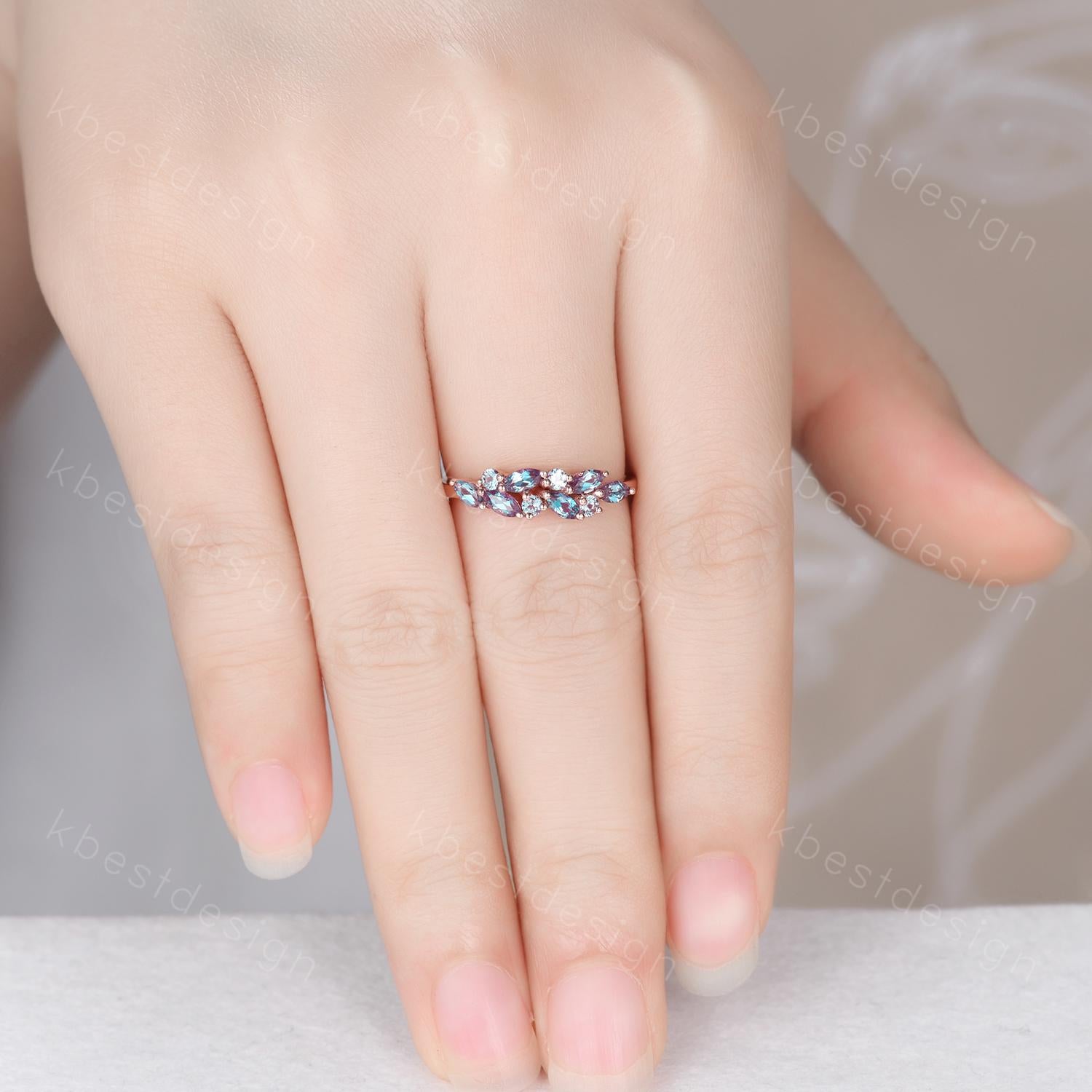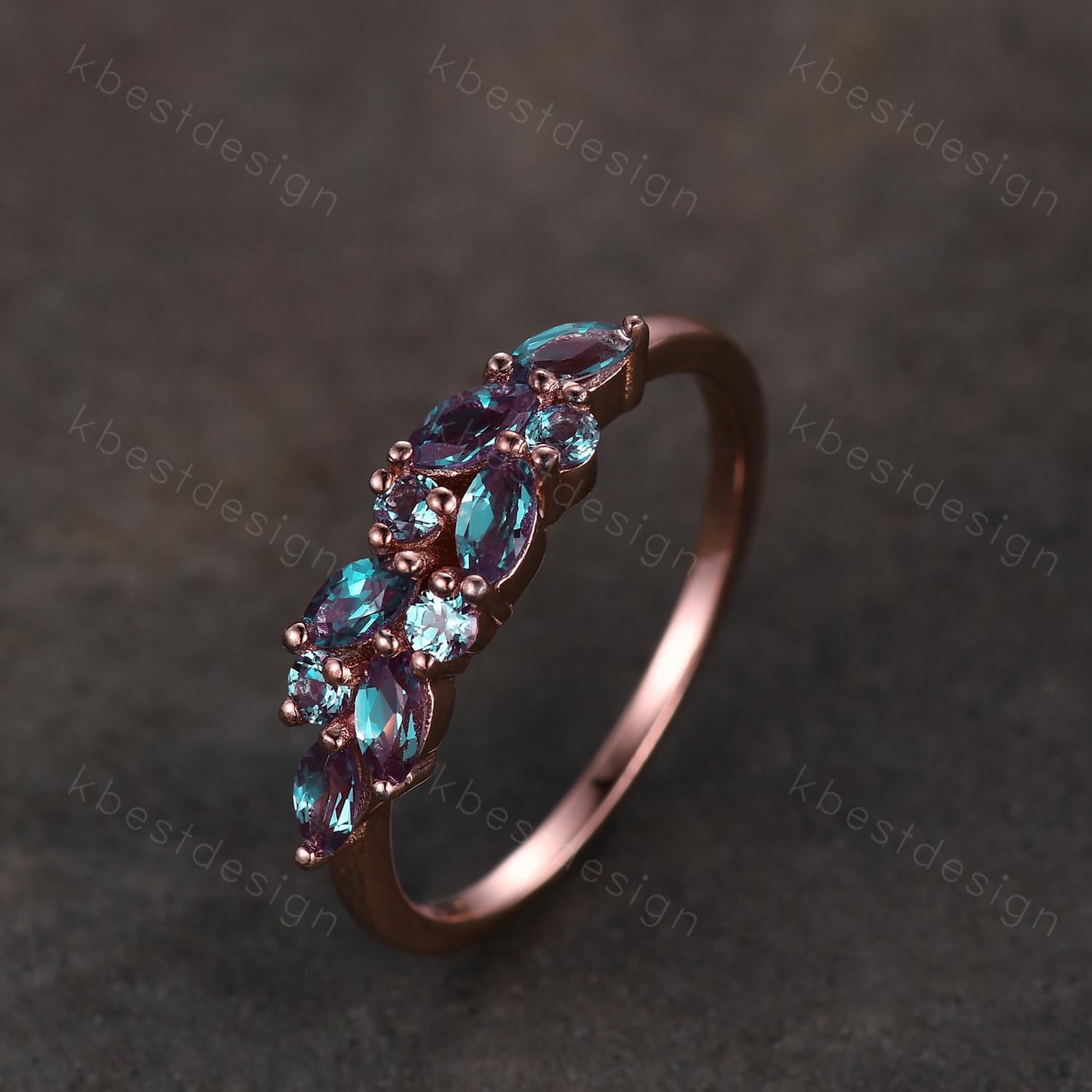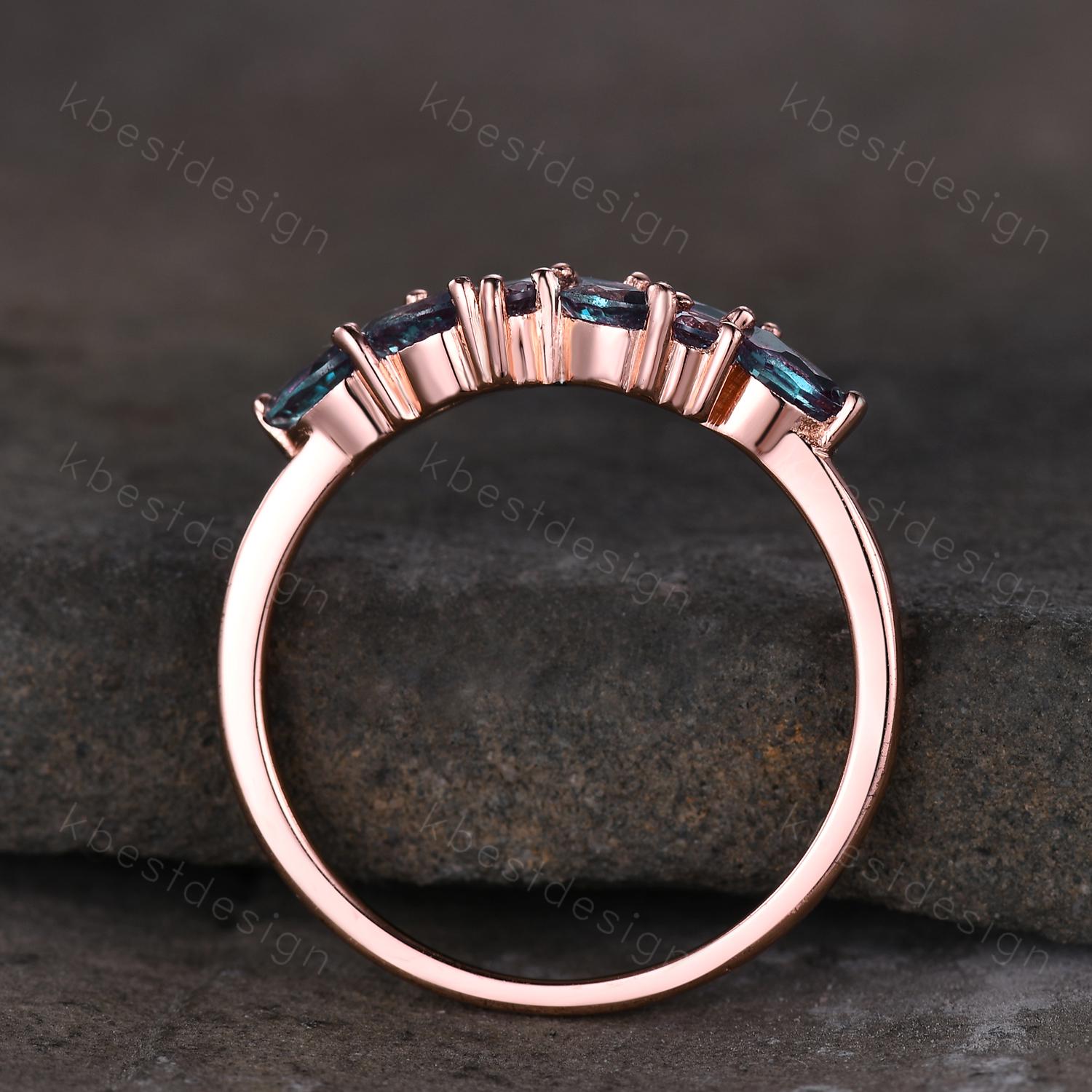 This is a vintage marquise cut alexandrite wedding ring. Vintage alexandrite cluster wedding band Unique marquise cut alexandrite wedding band Rose gold ring June birthstone Anniversary gift