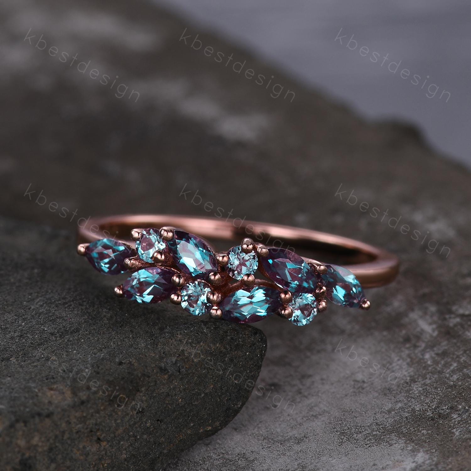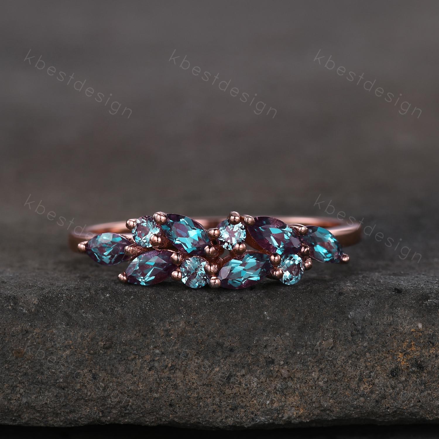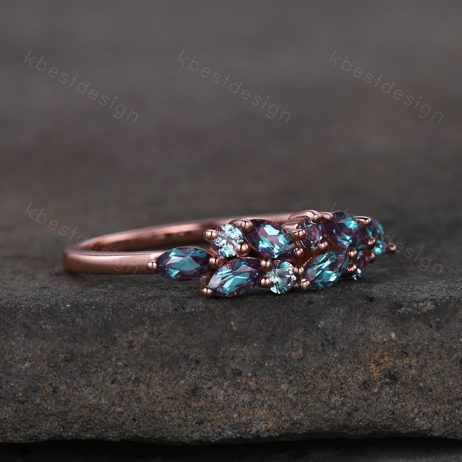 Vintage alexandrite cluster wedding band Unique marquise cut alexandrite wedding band Rose gold ring June birthstone Anniversary gift