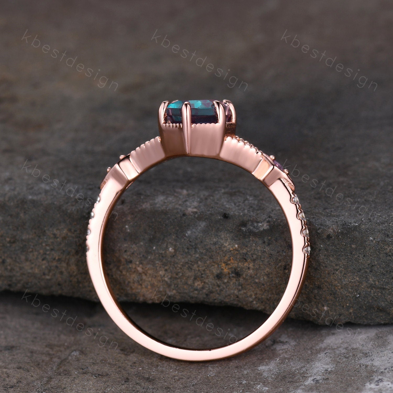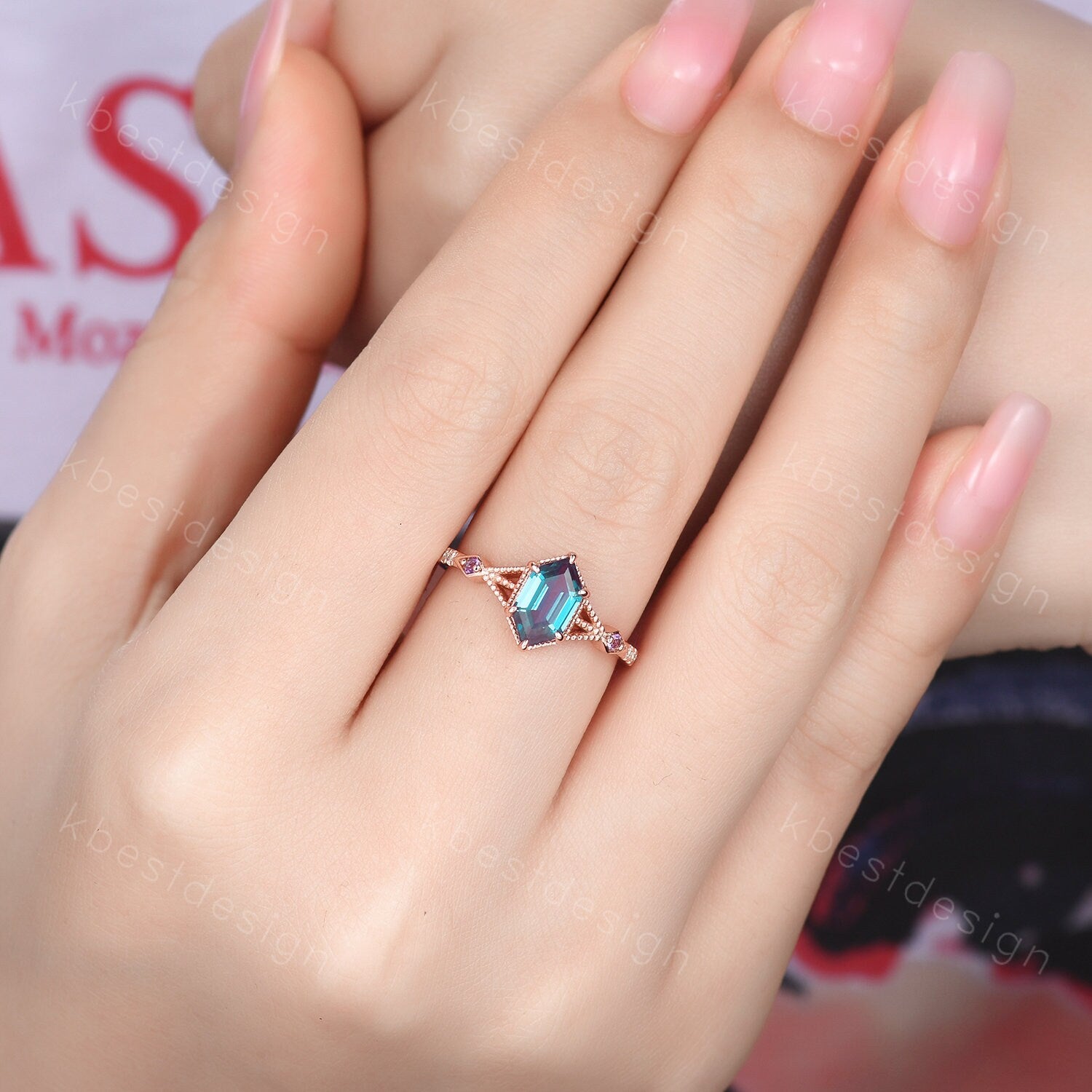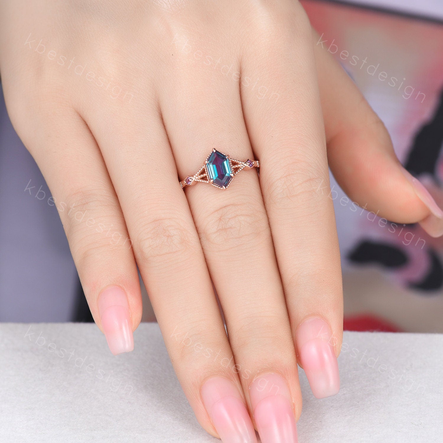 Vintage Alexandrite Engagement Ring Rose Gold ring Antique Hexagon cut Bridal ring Art deco Wedding Ring Milgrain Anniversary Promise Ring