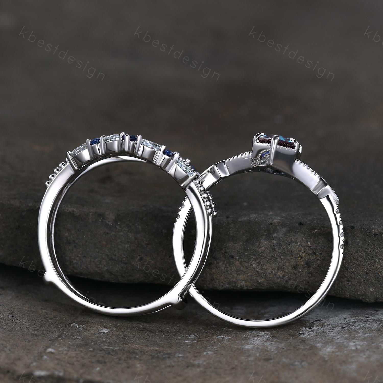 Vintage Alexandrite engagement ring Set Unique art deco milgrain bridal ring Double curved Blue Sapphire wedding band Promise Ring set