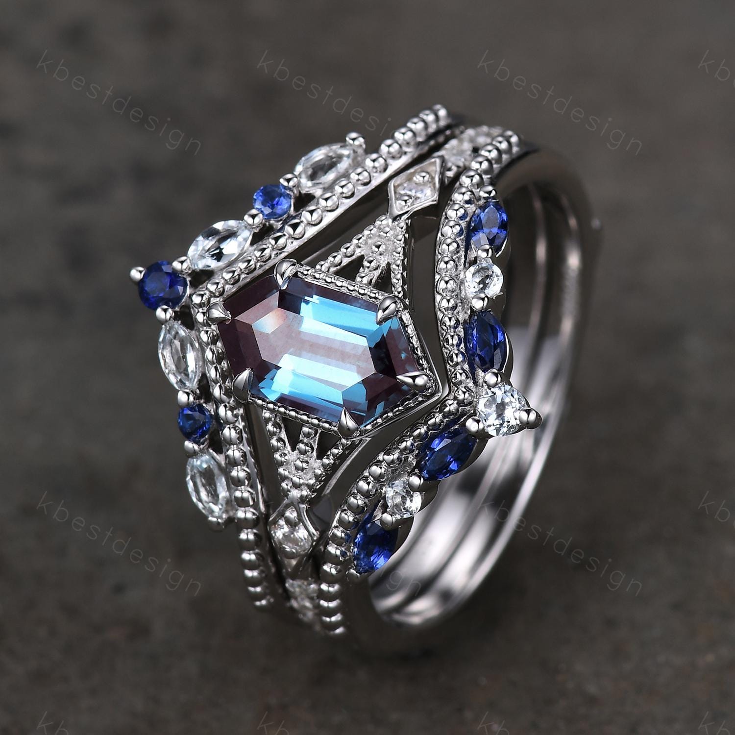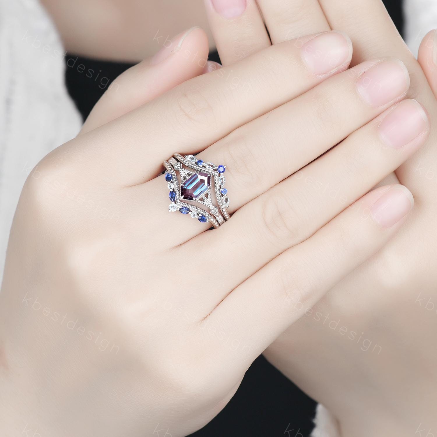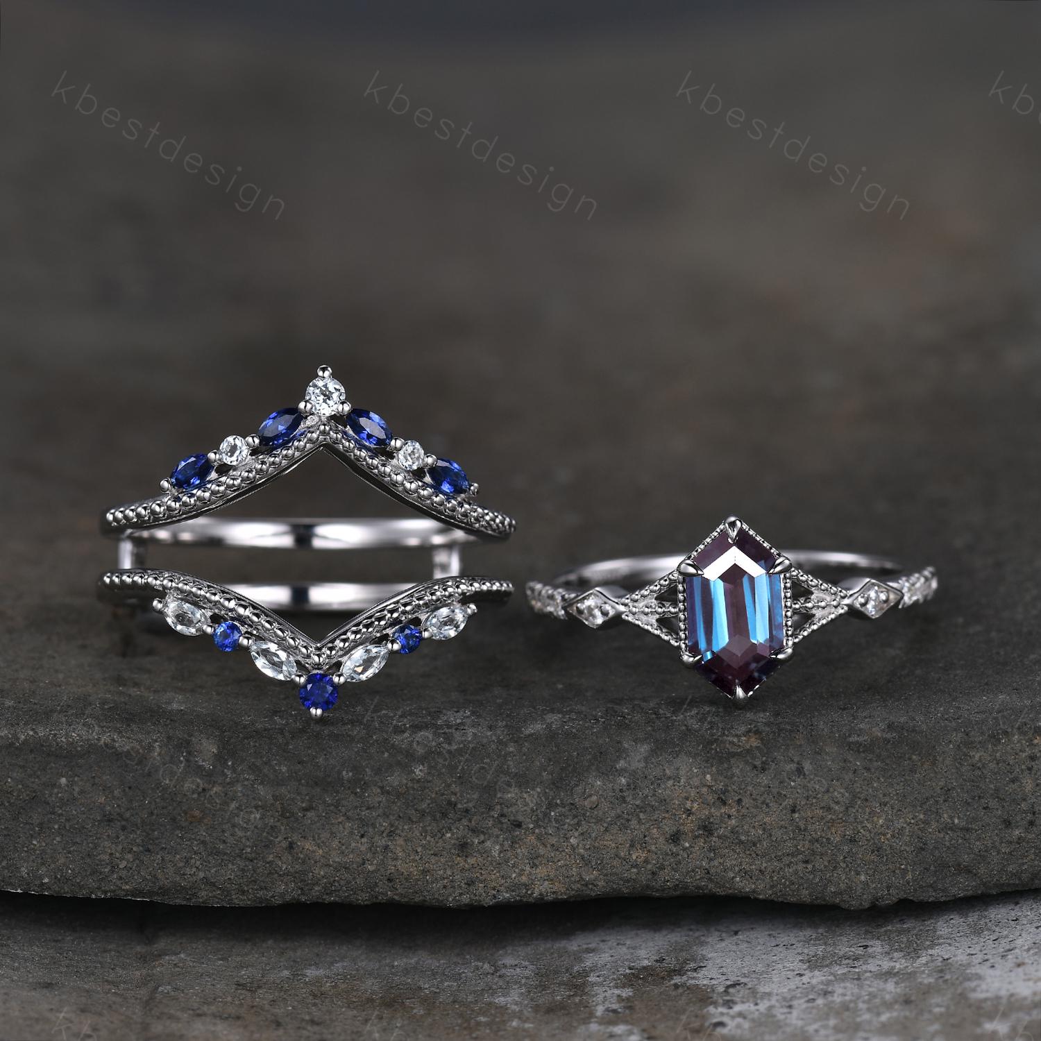 This is a Vintage Alexandrite engagement ring Set Unique art deco milgrain bridal ring Double curved Blue Sapphire wedding band Promise Ring set. A Modern Long Hexagon cut meets an intricate art deco design in this unique color changing stone engagement ring.