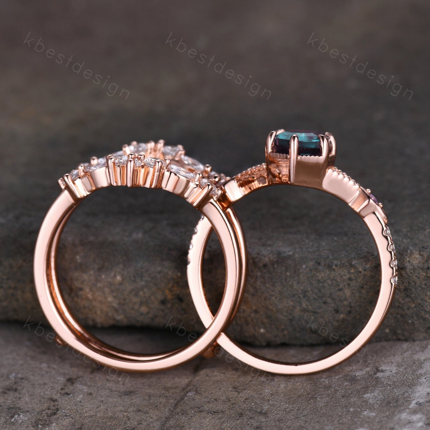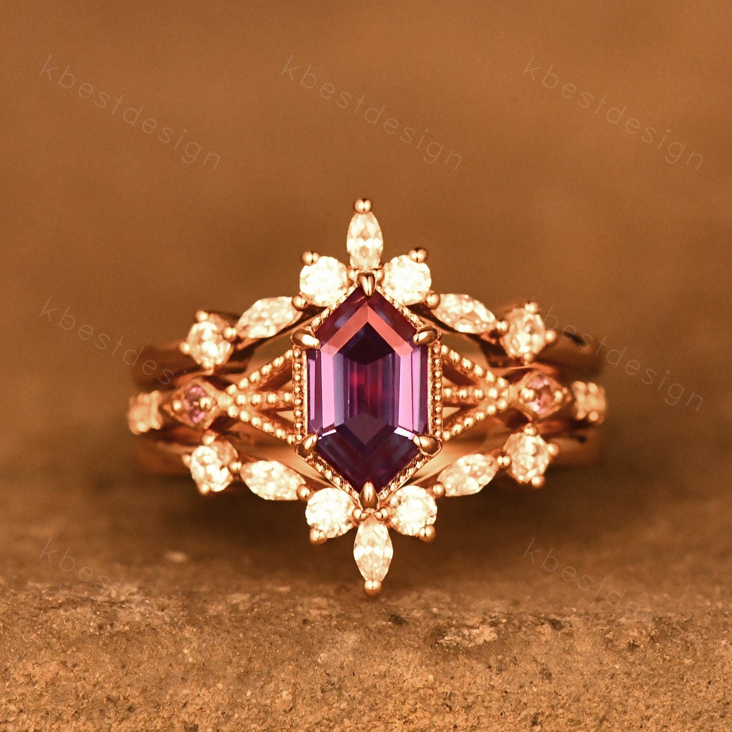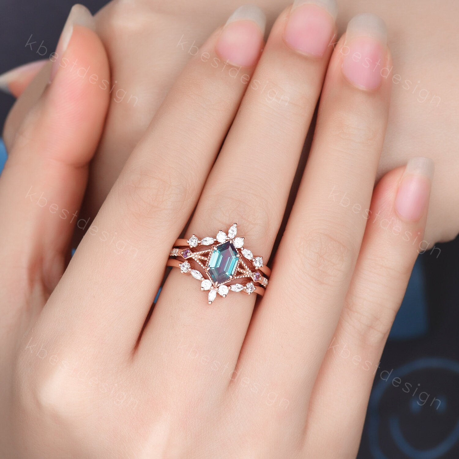 Vintage Alexandrite Engagement Ring Set Unique Rose Gold Hexagon cut ring Moissanite Wedding Band Art deco Milgrain Anniversary Promise Ring