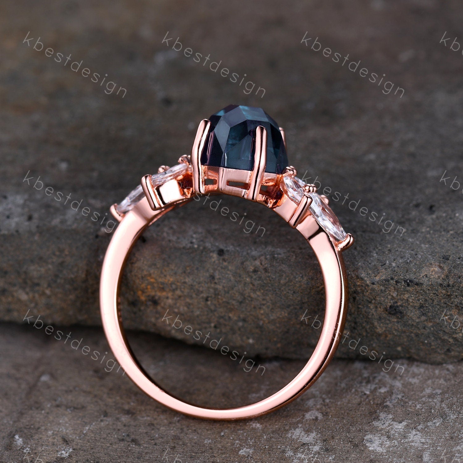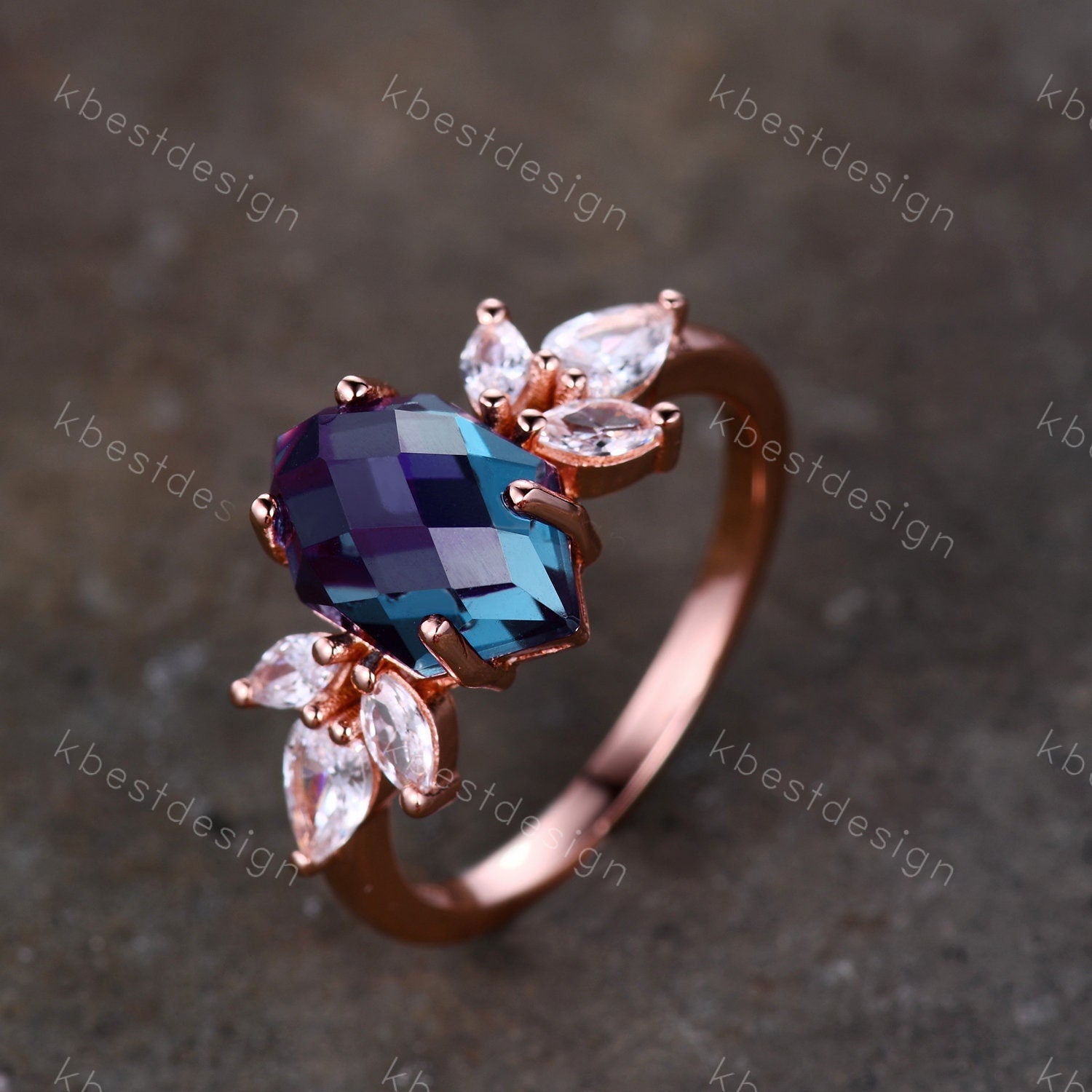 Vintage Alexandrite Ring Unique Bridal Ring Rose Gold Alexandrite Engagement Ring June Birthstone Ring Marquise Cluster Ring Promise