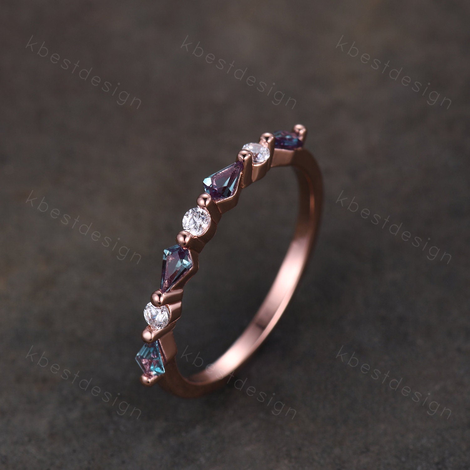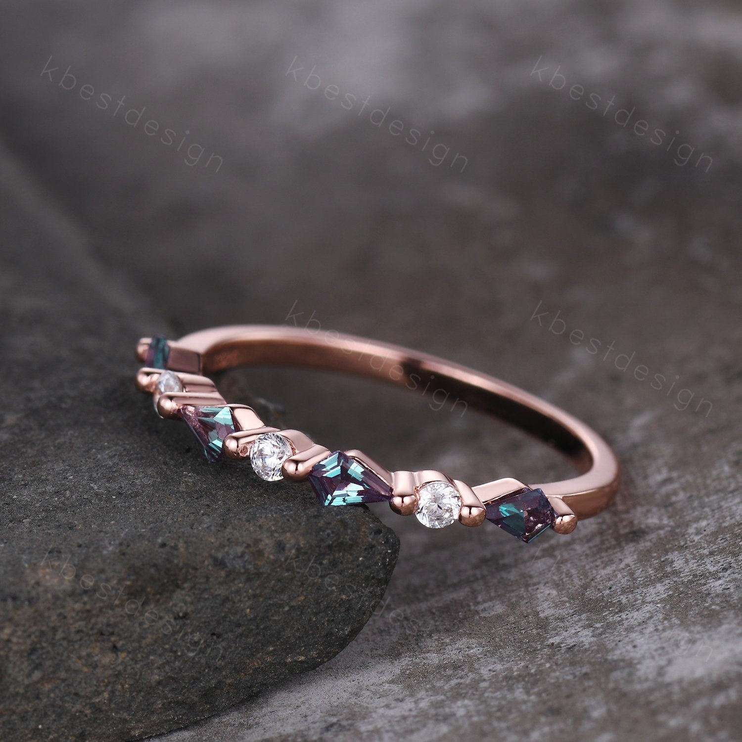 Vintage Alexandrite Wedding Band Kite cut Wedding Band Women Rose Gold Band Unique Half eternity band Delicate Stacking Band Gift for Her