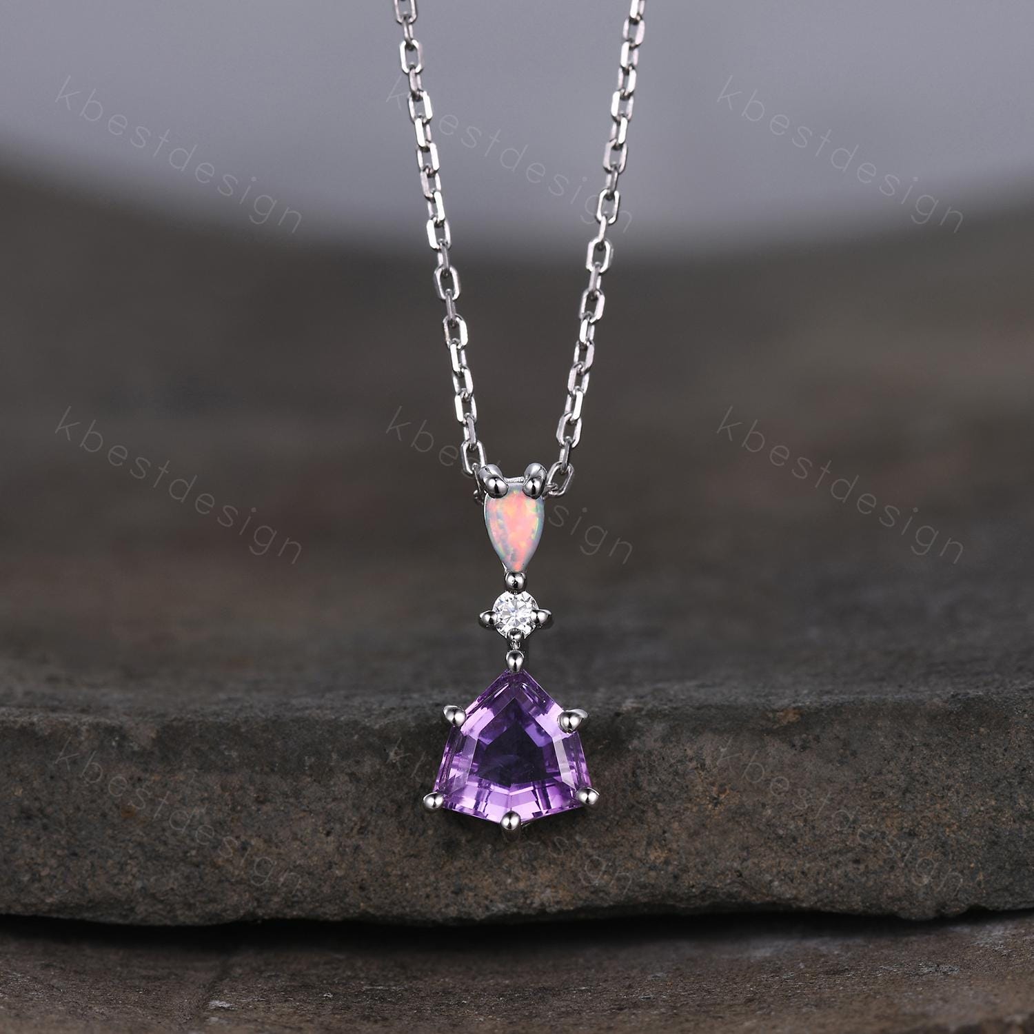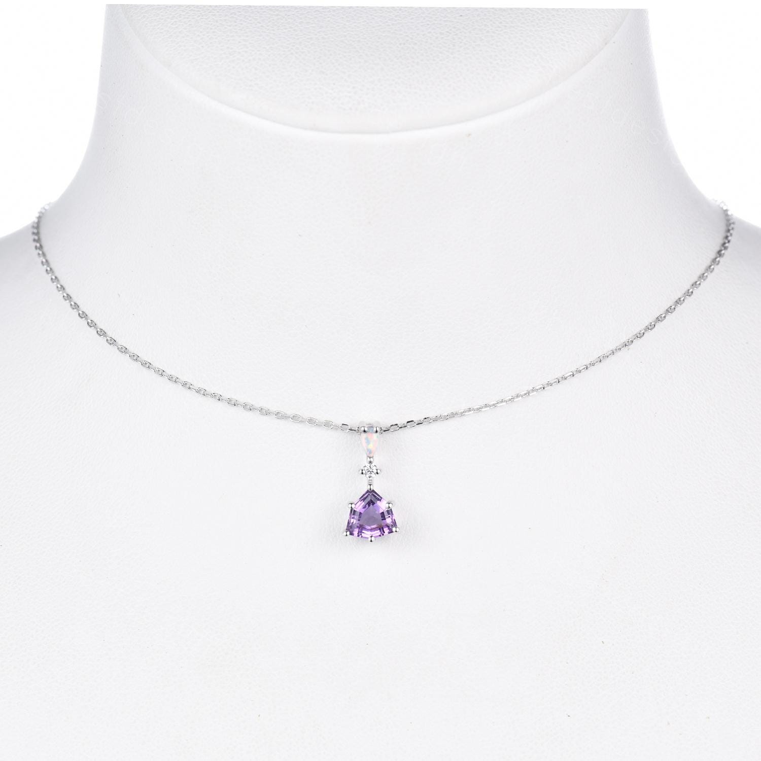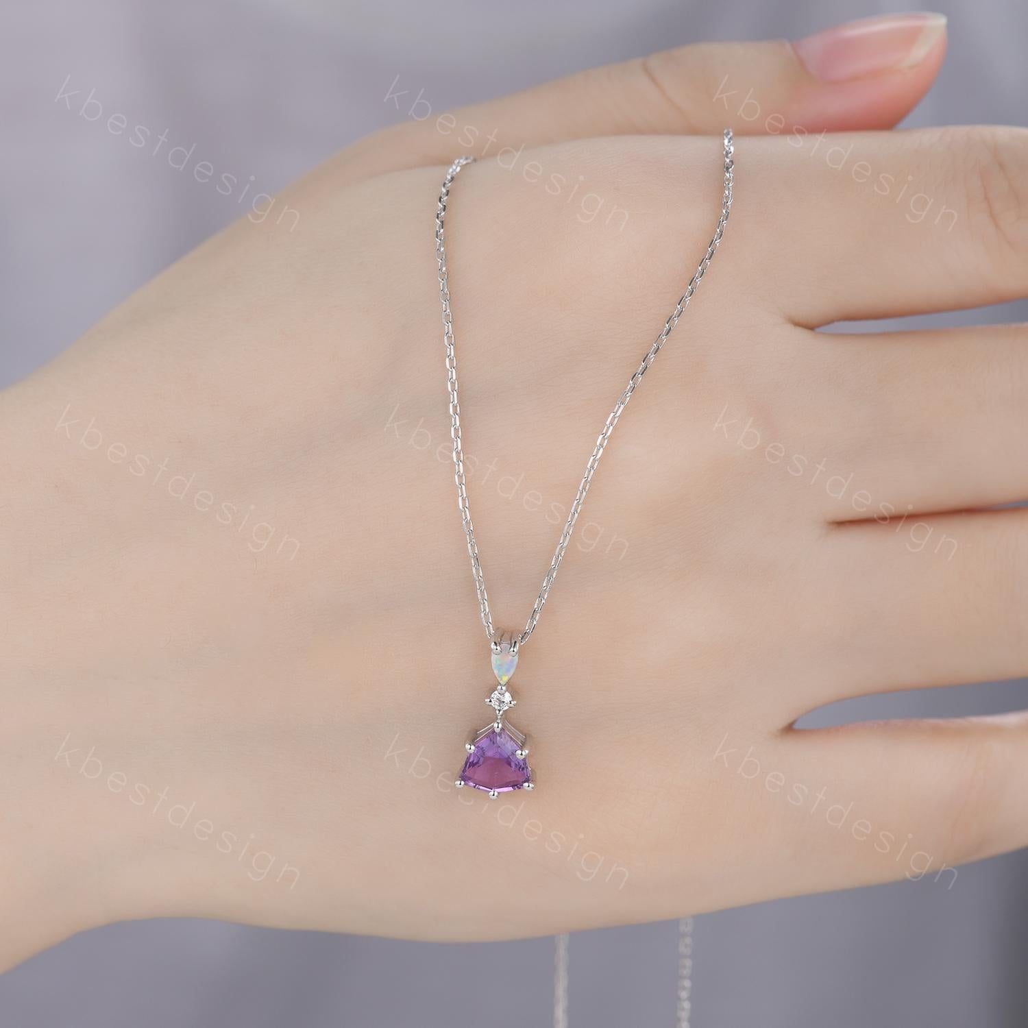 Vintage Amethyst Opal Necklace, White Gold Trillion cut Amethyst Pendant, February Birthstone Jewelry, Unique Art Deco Bridal Promise Gift