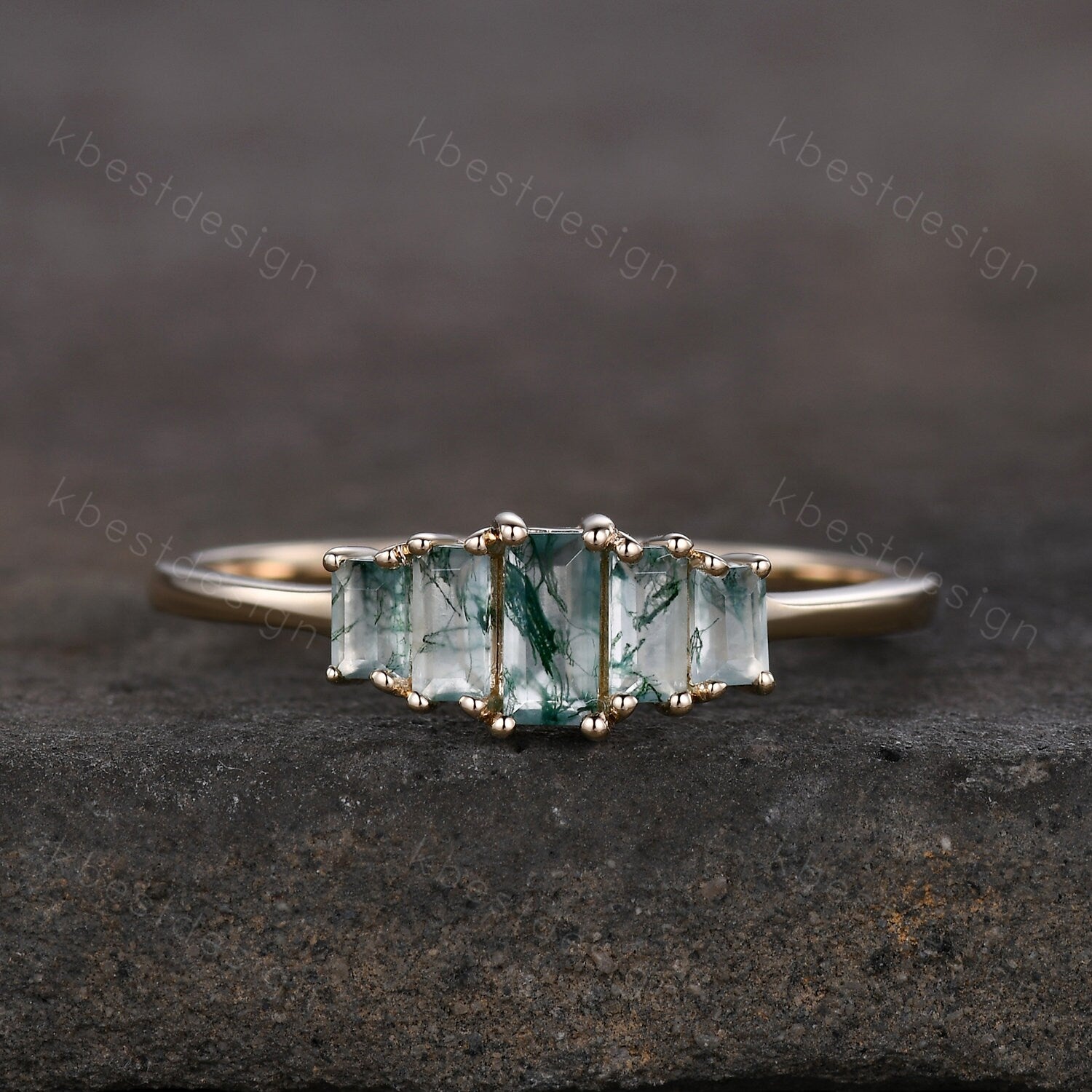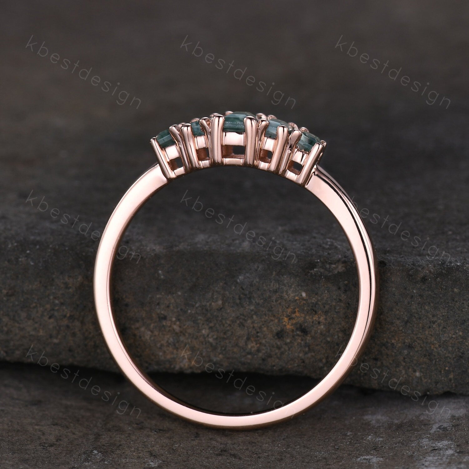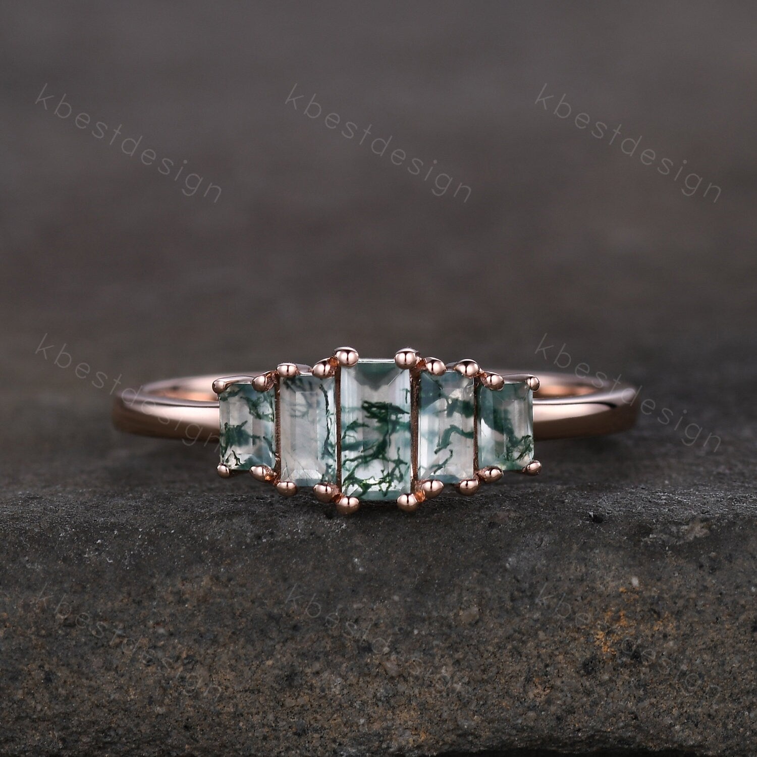 Vintage Baguette cut Moss Agate Wedding Band Unique Green Agate Cluster Ring Rose Gold Antique Five Stone Women Bridal Promise Ring