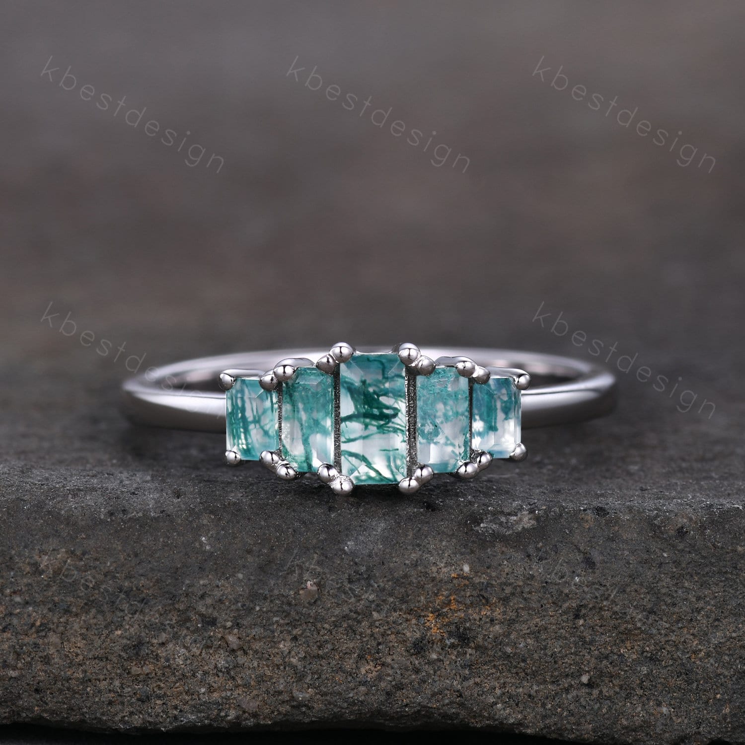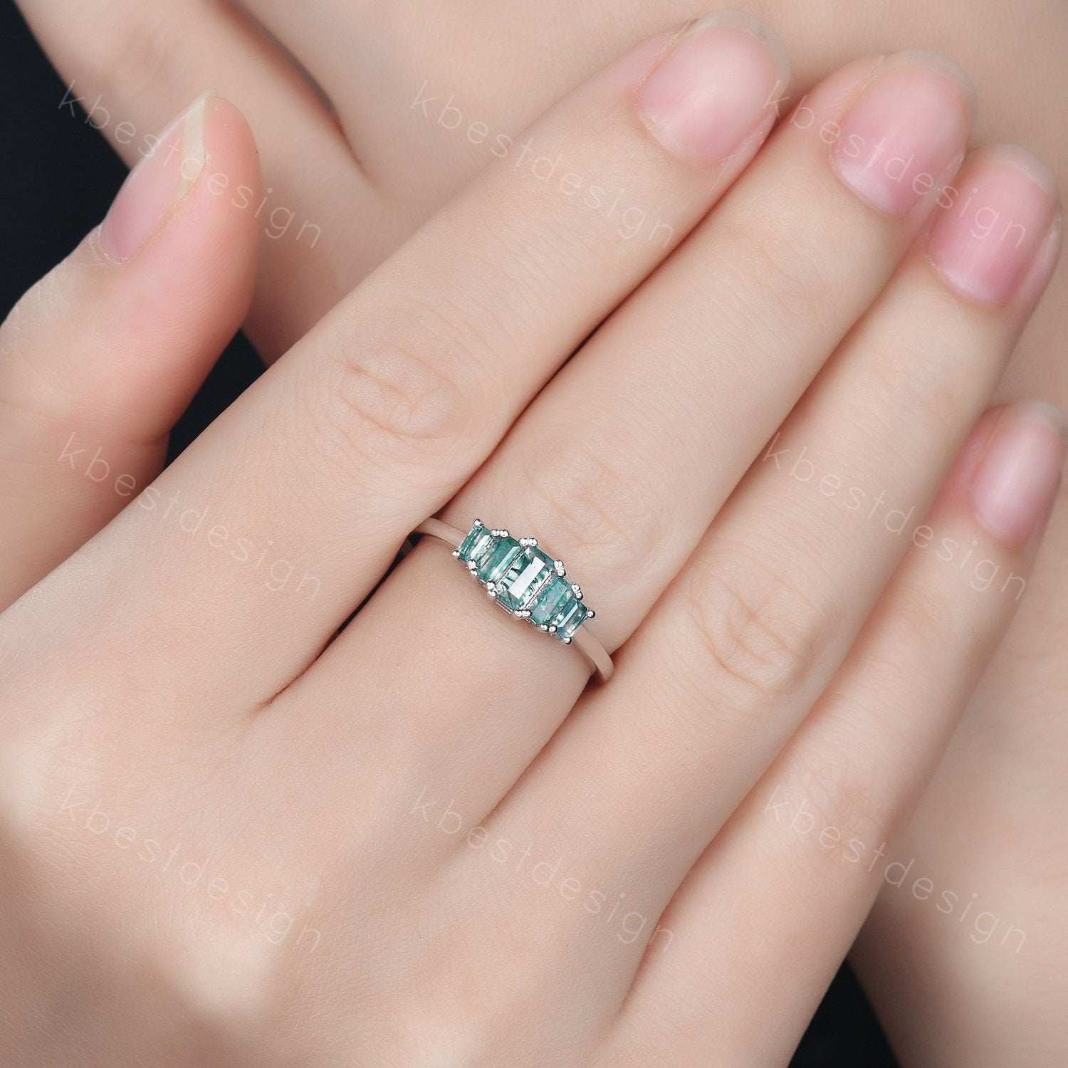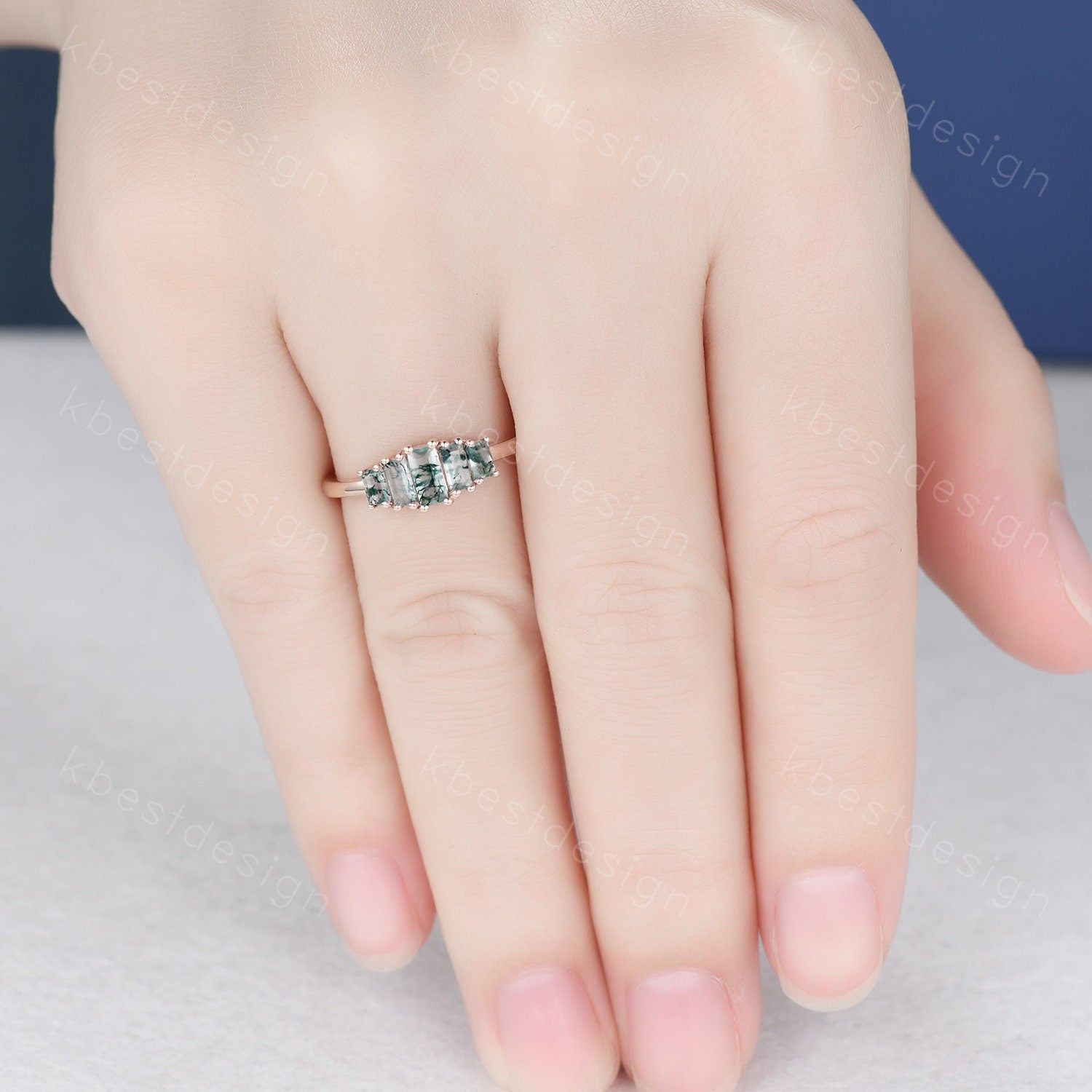 Vintage Baguette cut Moss Agate Wedding Band Unique Green Agate Cluster Ring Rose Gold Antique Five Stone Women Bridal Promise Ring