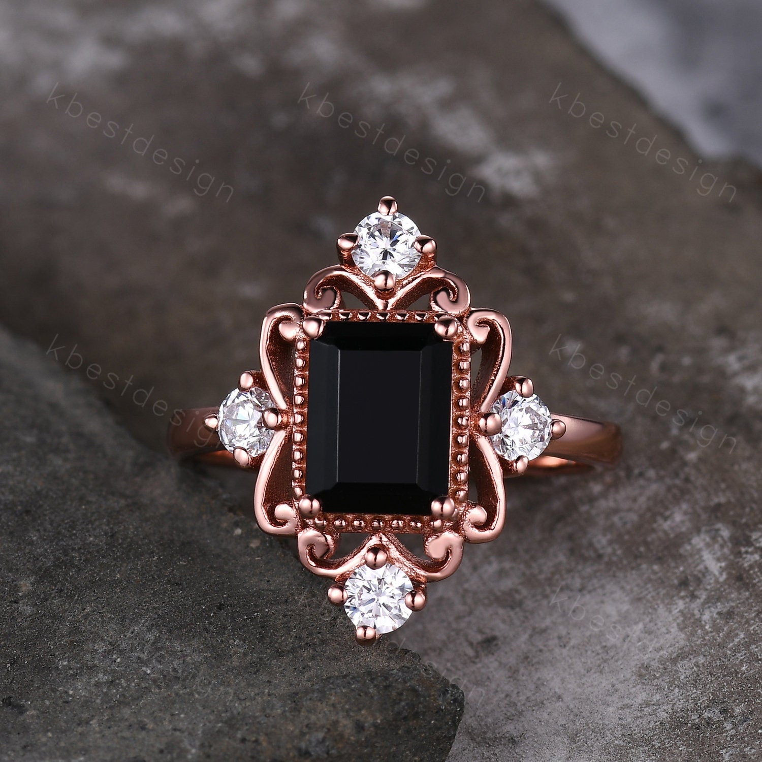 This is a Vintage black onyx engagement ring 6x8mm emerald cut black onyx ring unique antique moissanite ring black stone ring rose gold Bridal ring