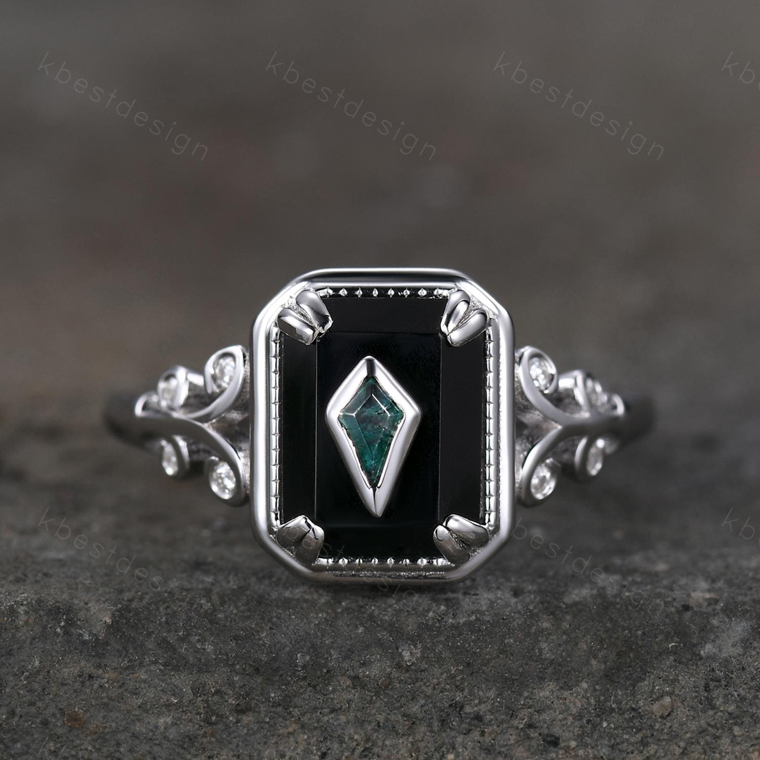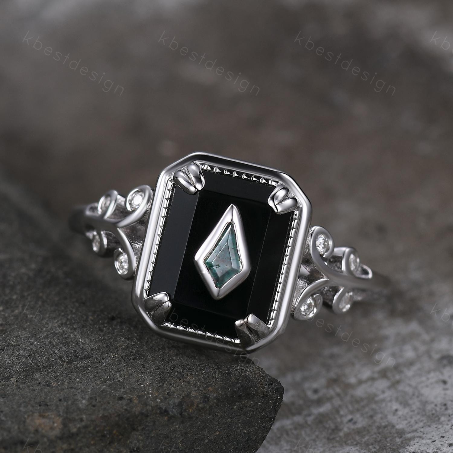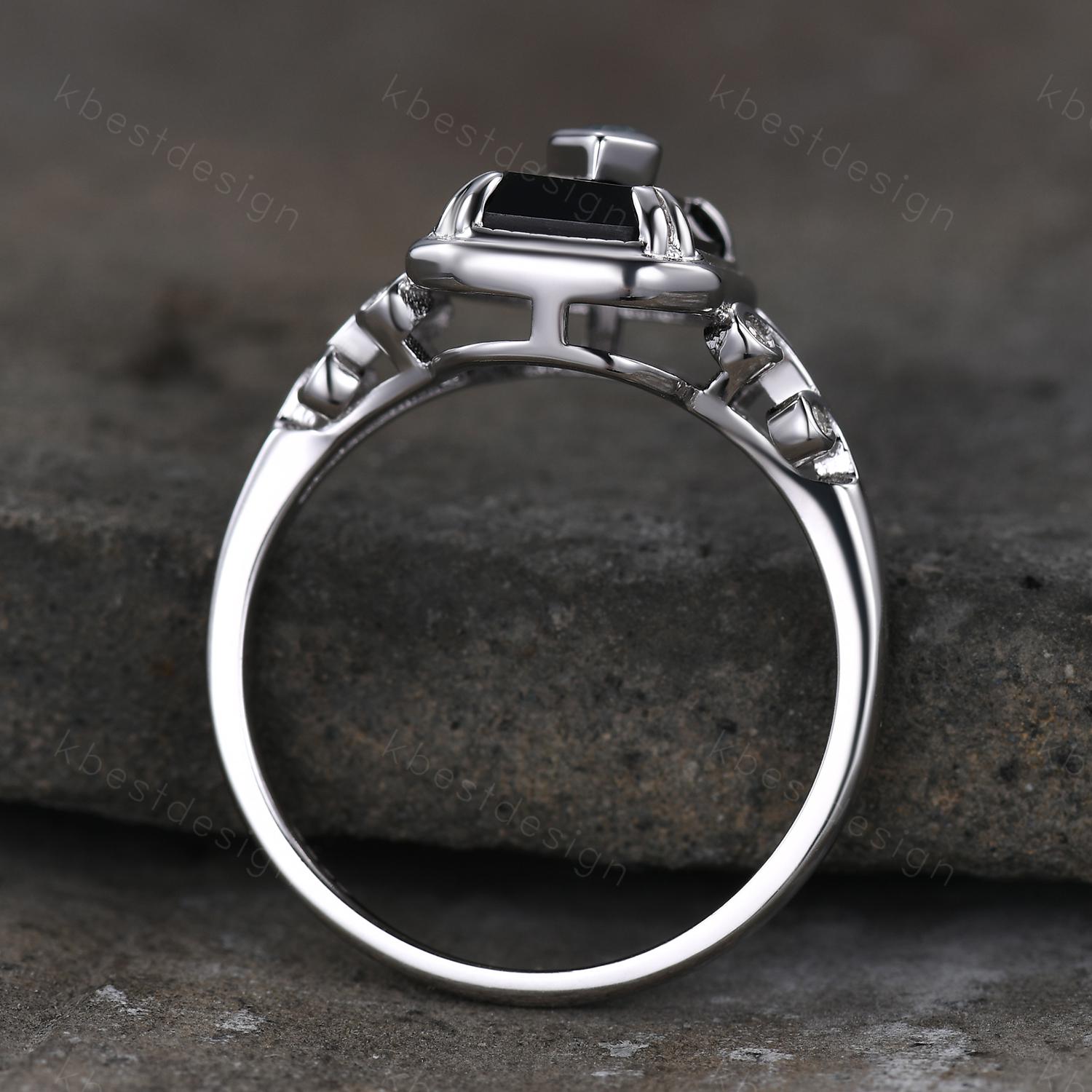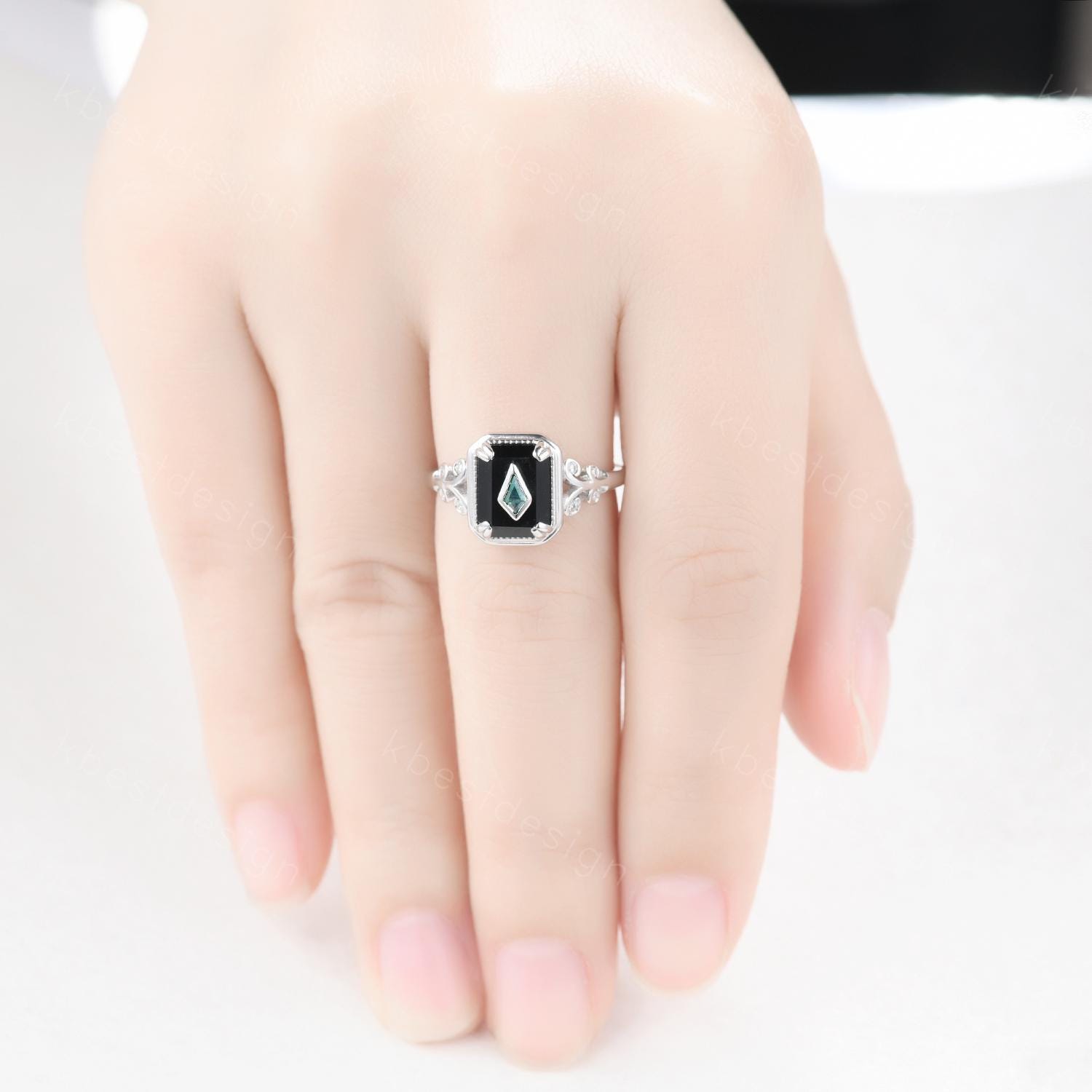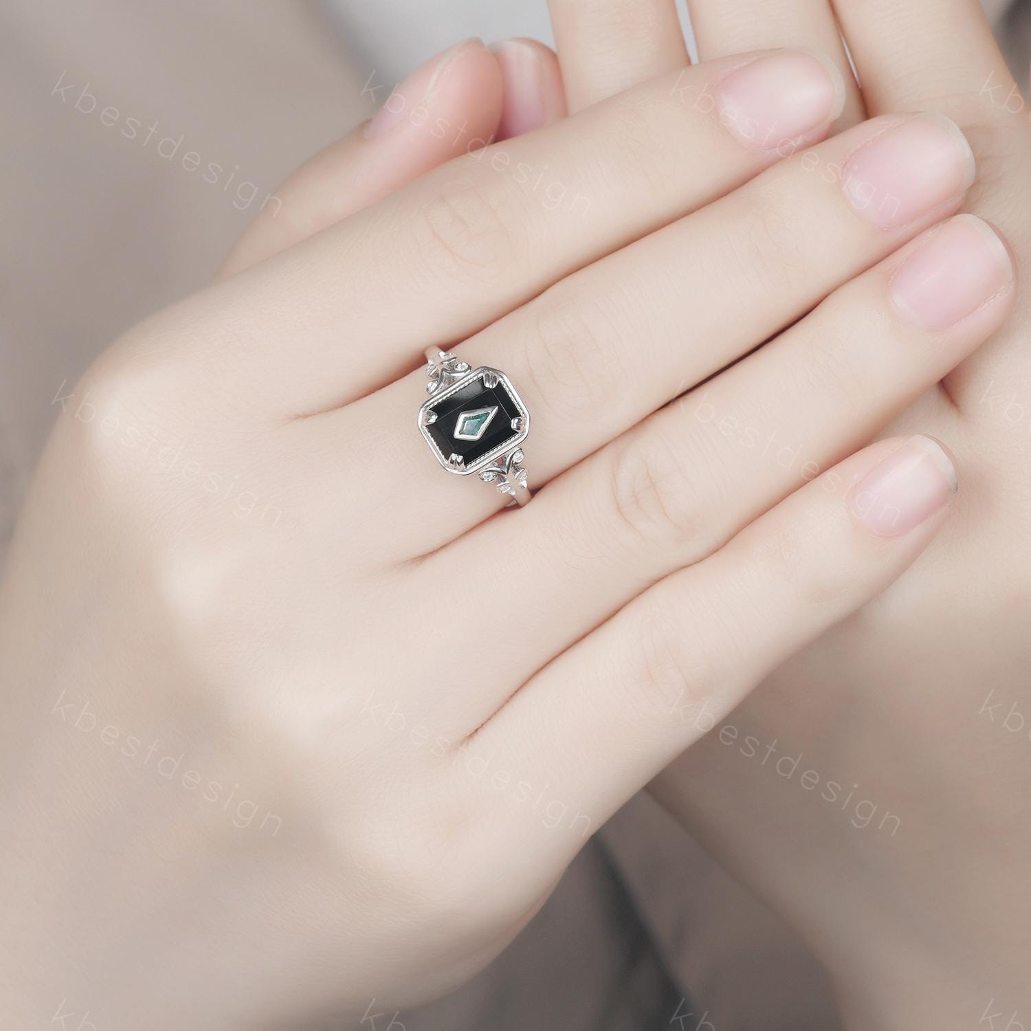 Vintage Black Onyx engagement ring antique kite cut moss agate ring Twig Emerald cut bridal promise ring Gemstone ring for women gift