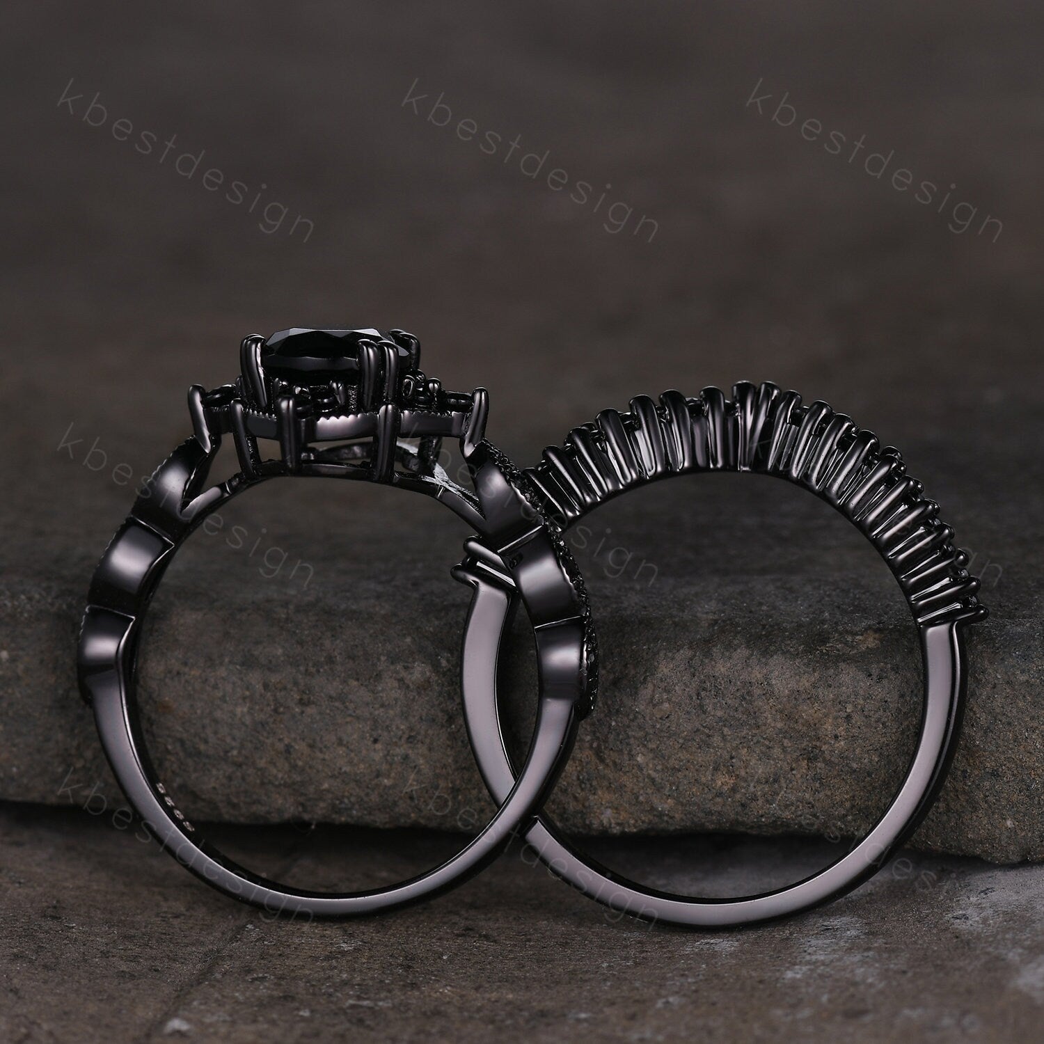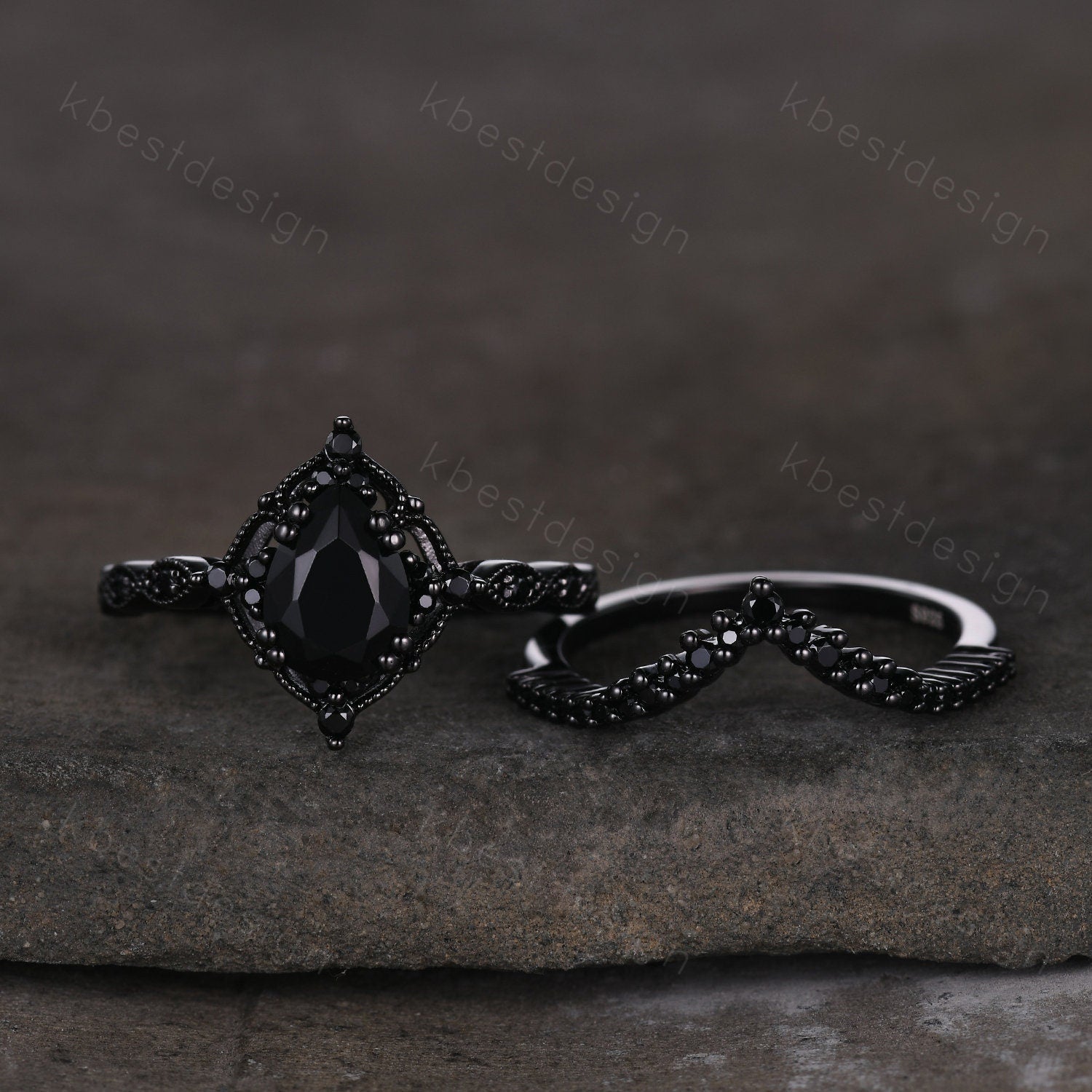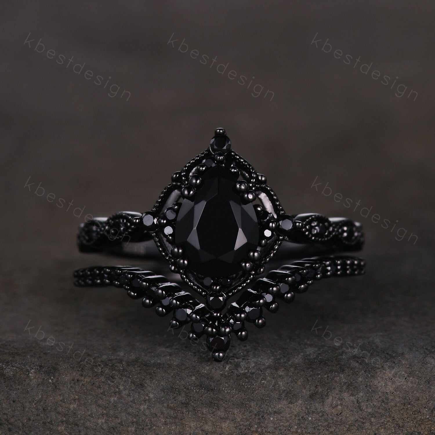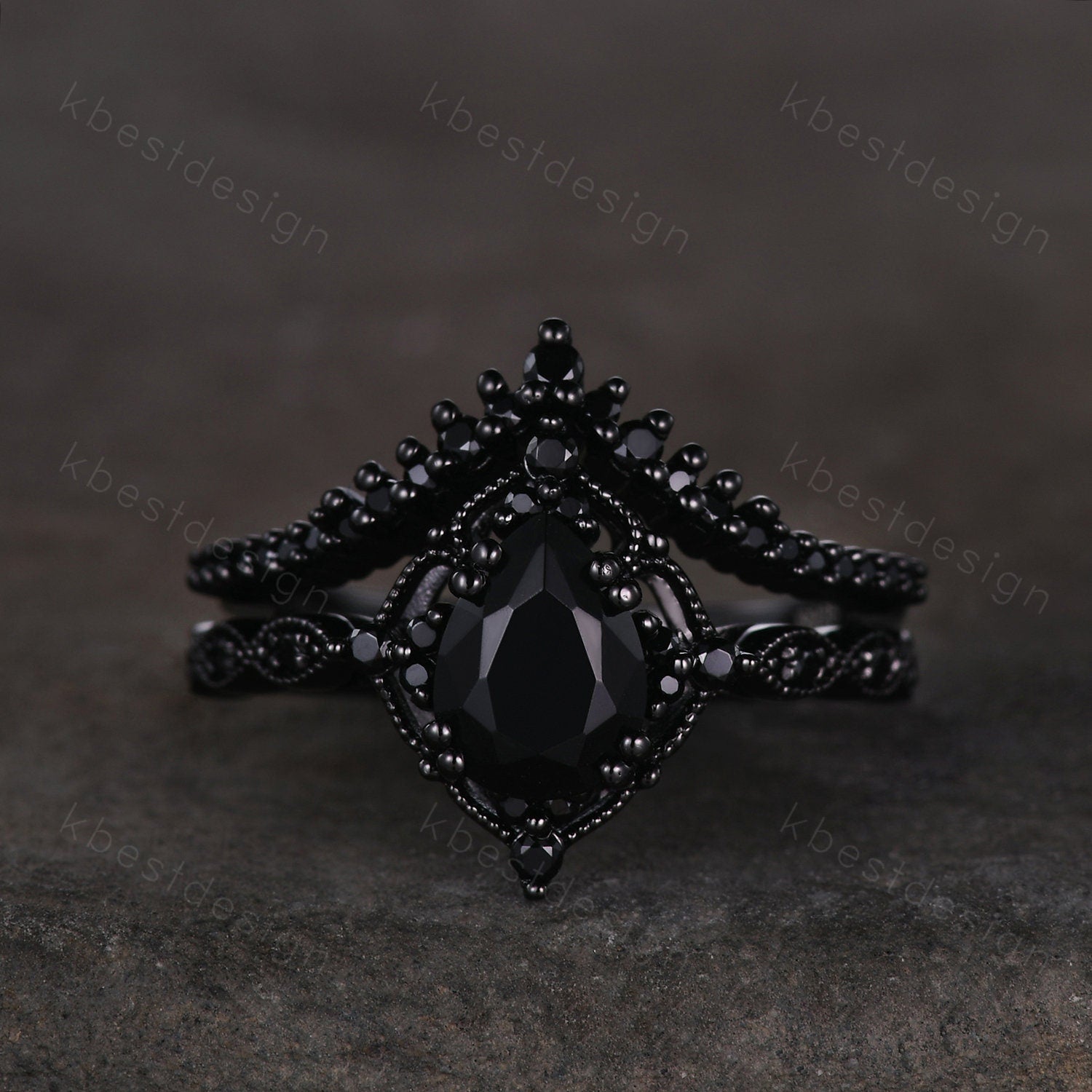 This is a beautiful pear shaped black onyx and black spinel engagement ring SET in black gold