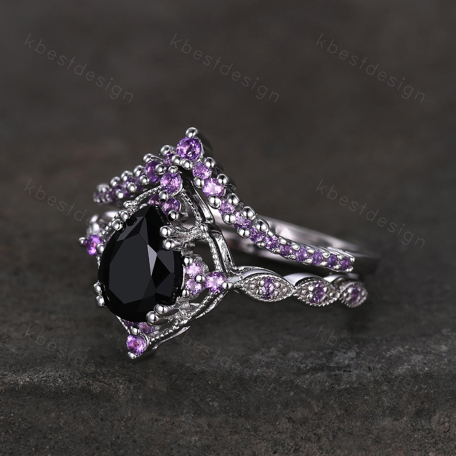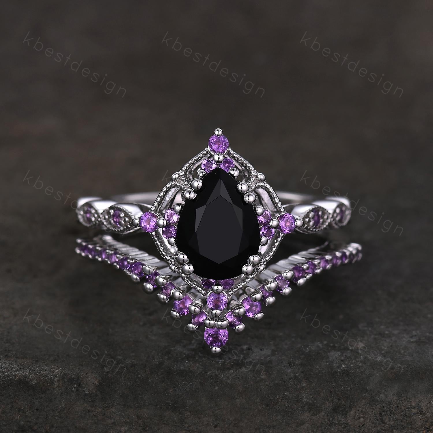 Vintage black onyx engagement ring sterling silver ring art deco curved stacking band pear shaped bridal set unique amethyst wedding set