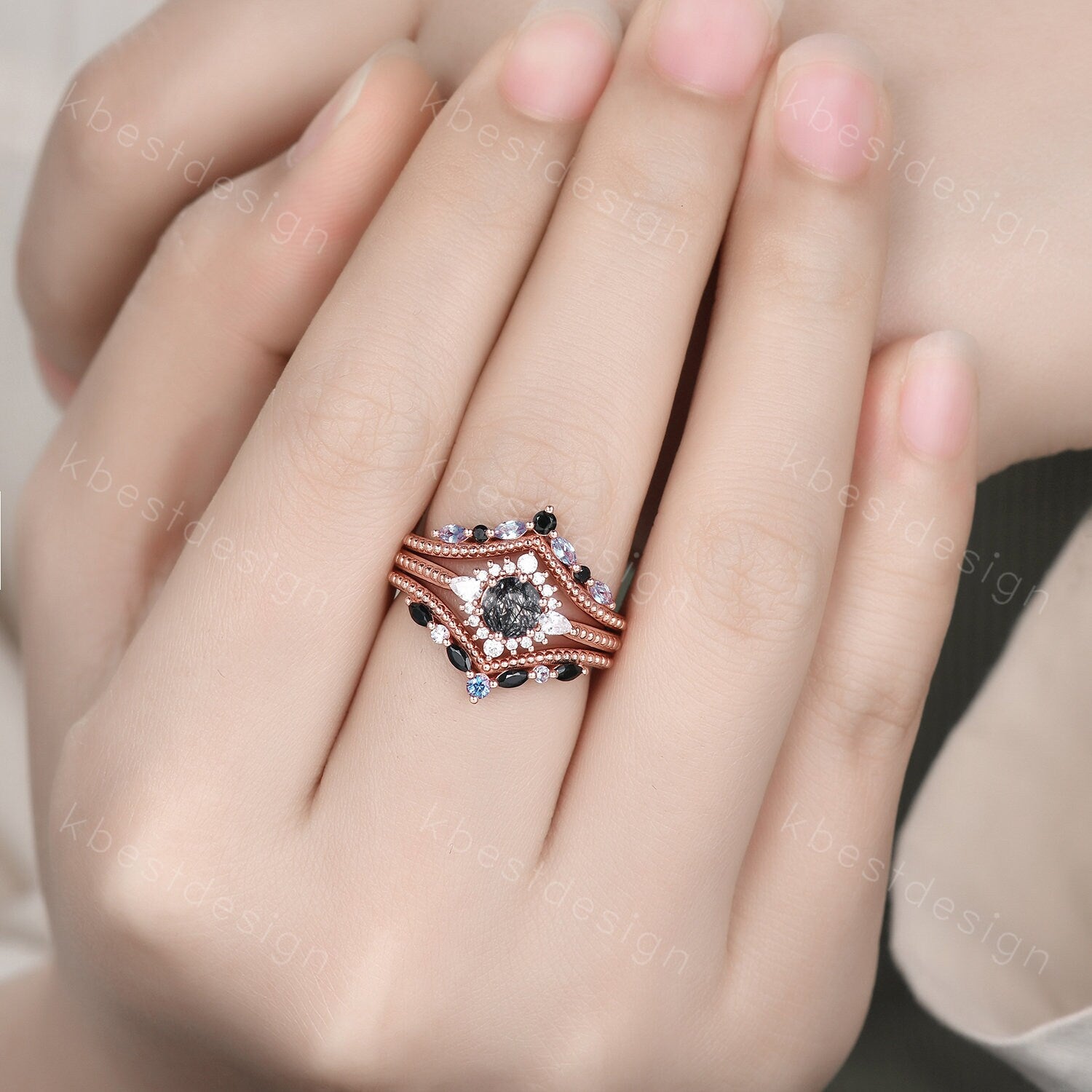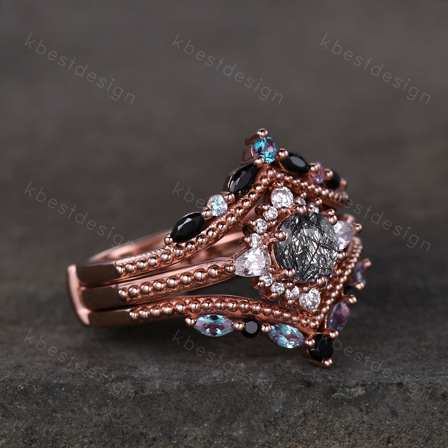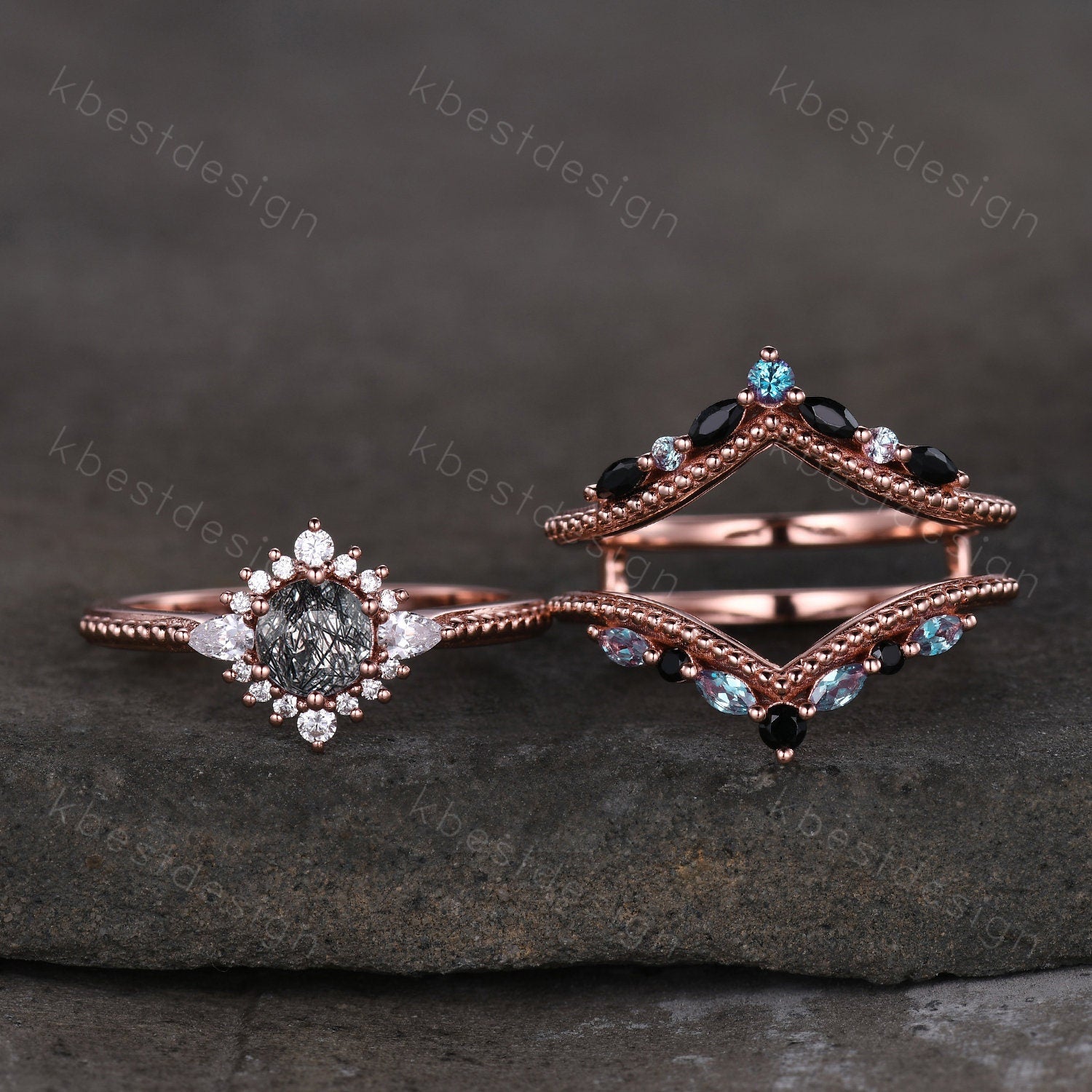 This is a Vintage black rutilated quartz engagement ring art deco curved stacking band marquise cut alexandrite ring unique bridal wedding set. A Modern cluster ring meets an intricate nature inspired design in this unique black rutilated quartz stone engagement ring.