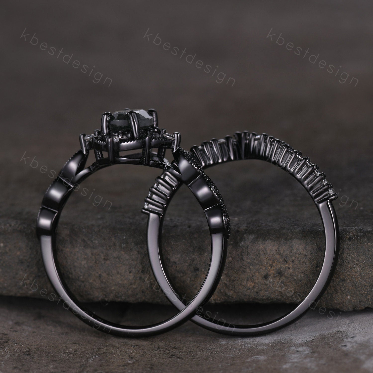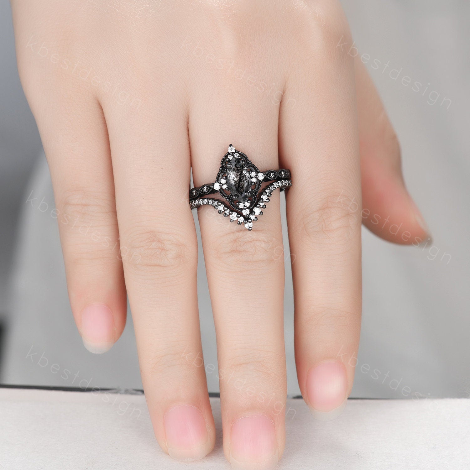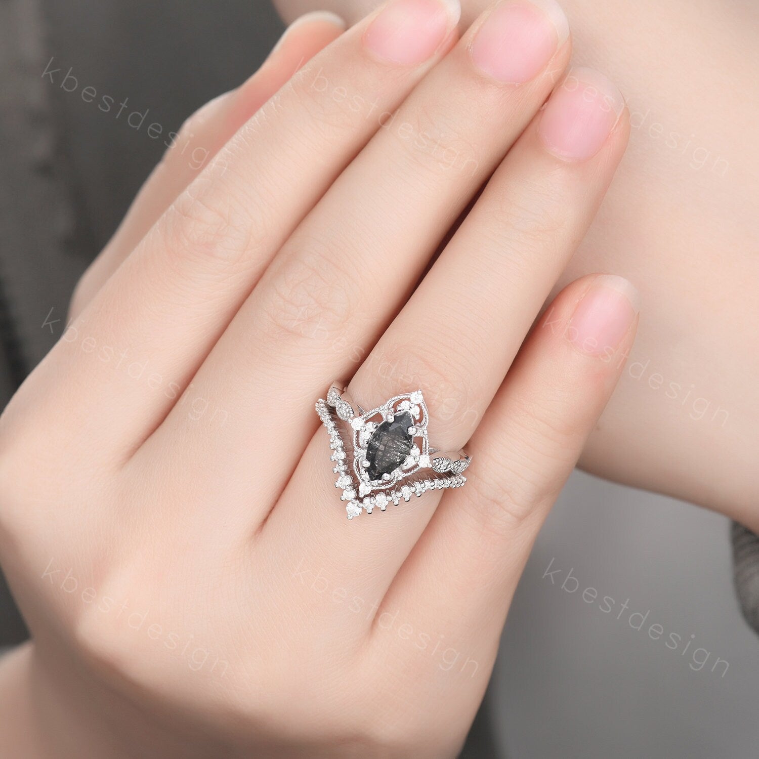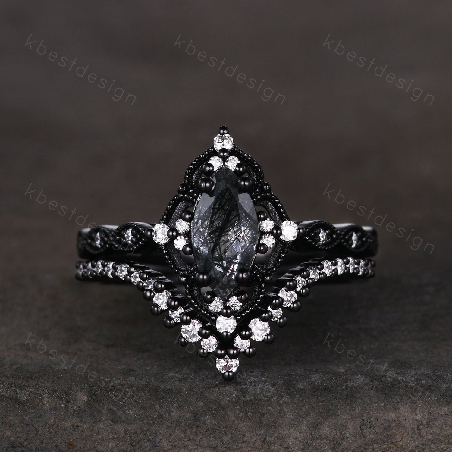 This is a Vintage black rutilated quartz engagement ring set black gold art deco moissanite wedding band marquise cut unique bridal promise ring
