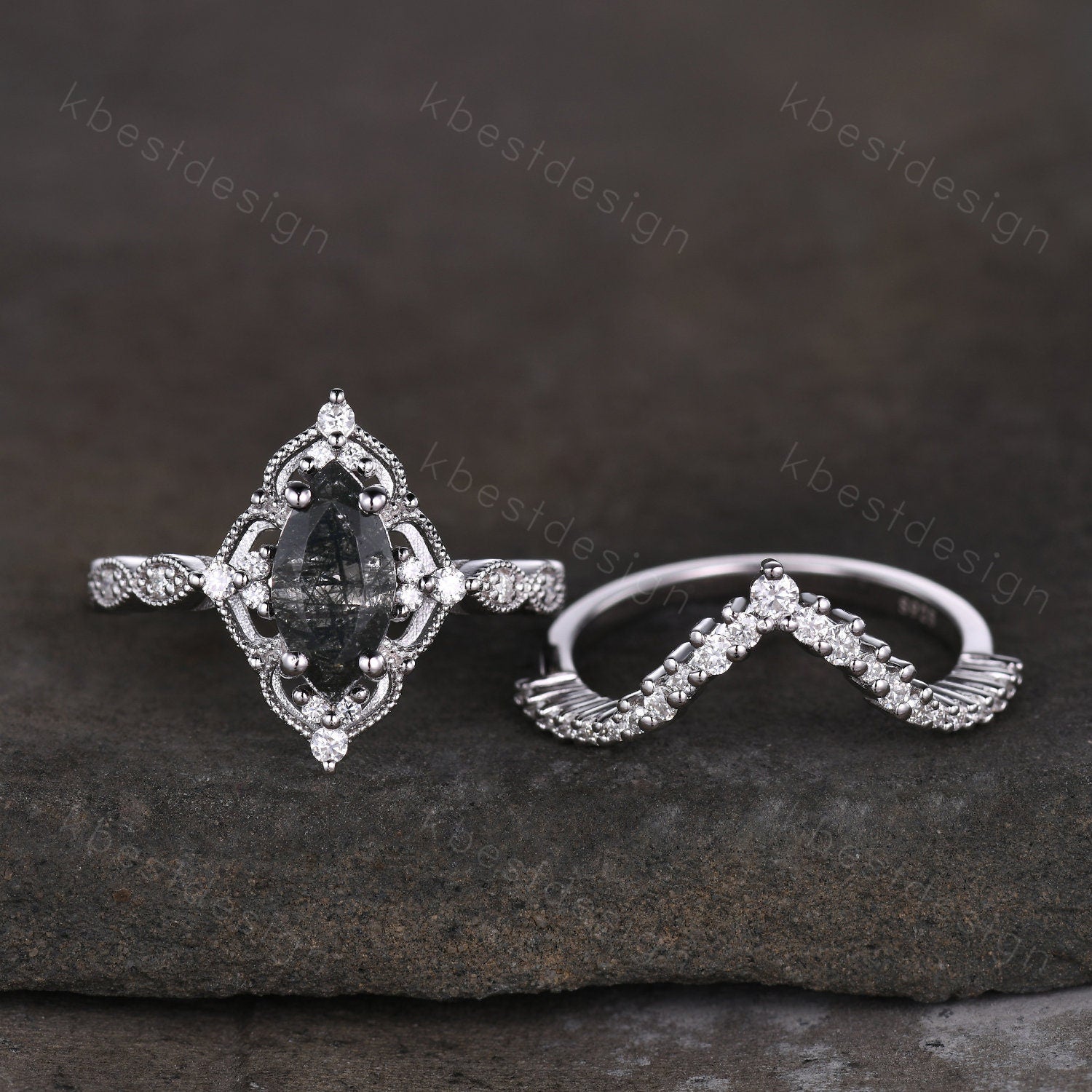 This is a beautiful Vintage black rutilated quartz engagement ring silver art deco curved stacking band marquise cut bridal set unique moissanite wedding set