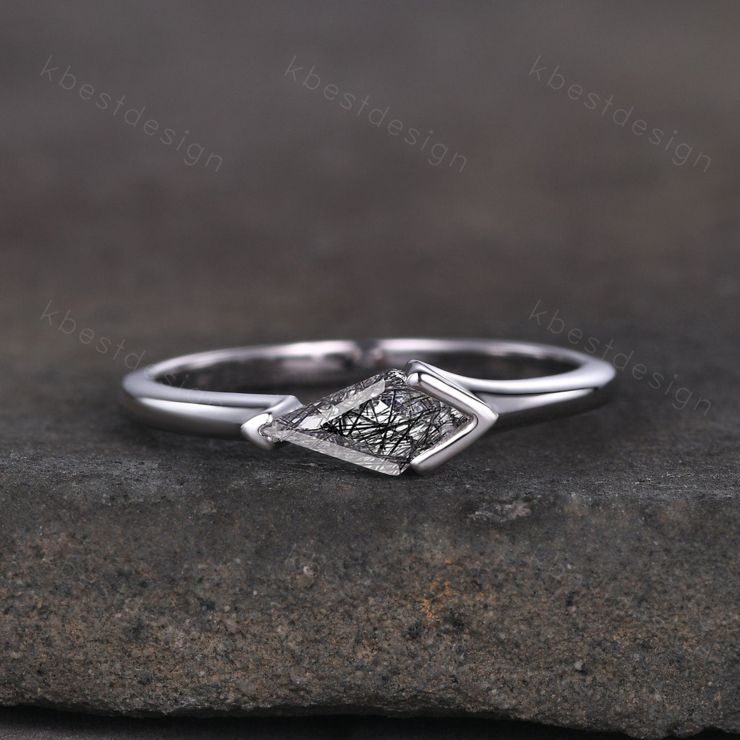 Delicate kite cut black rutilated quartz engagement ring. Perfect for birthday gift, anniversary gift, promise gift, Vintage black rutilated quartz engagement ring silver kite cut ring art deco black gemstone ring women wedding bridal ring delicate ring