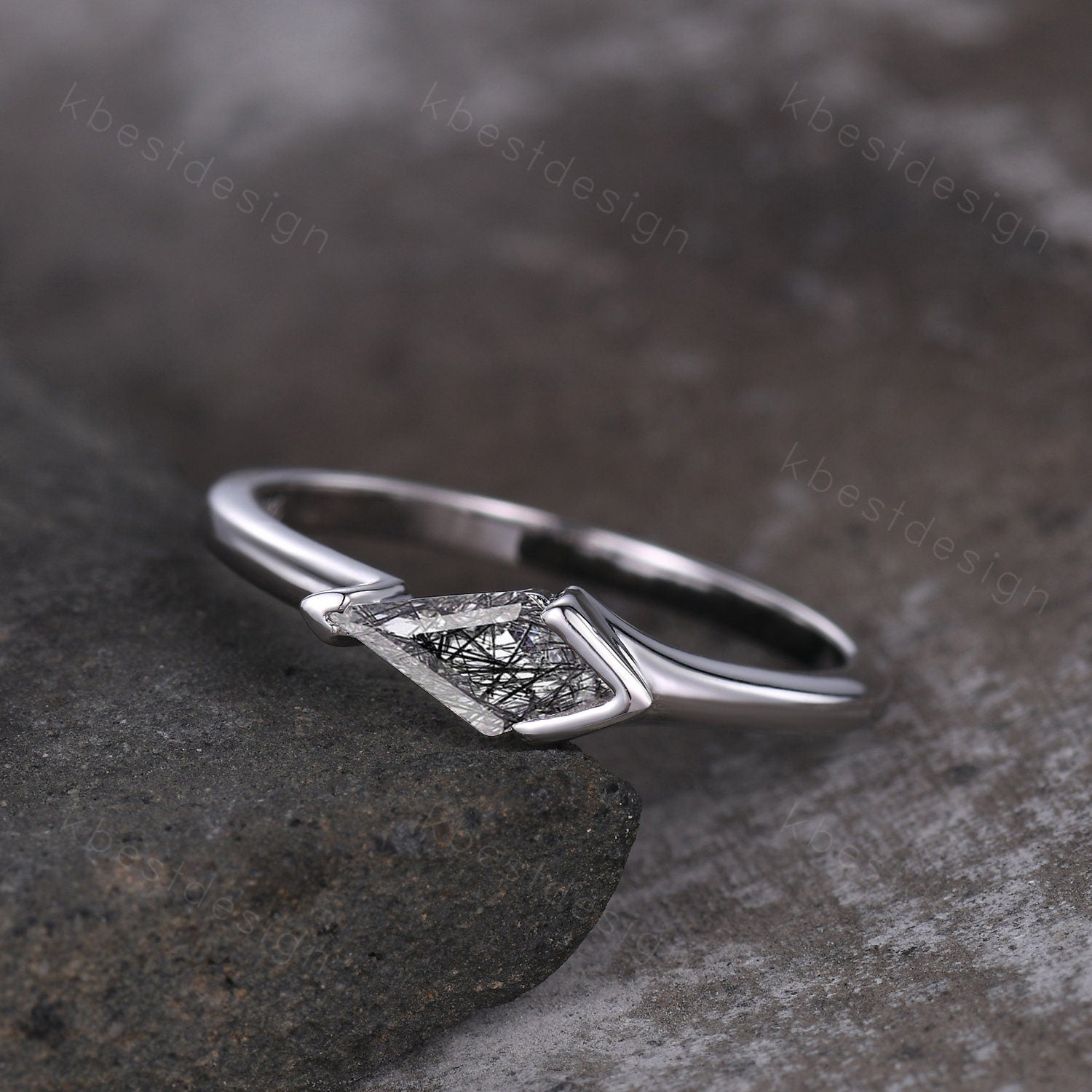 Vintage black rutilated quartz engagement ring silver kite cut ring art deco black gemstone ring women wedding bridal ring delicate ring