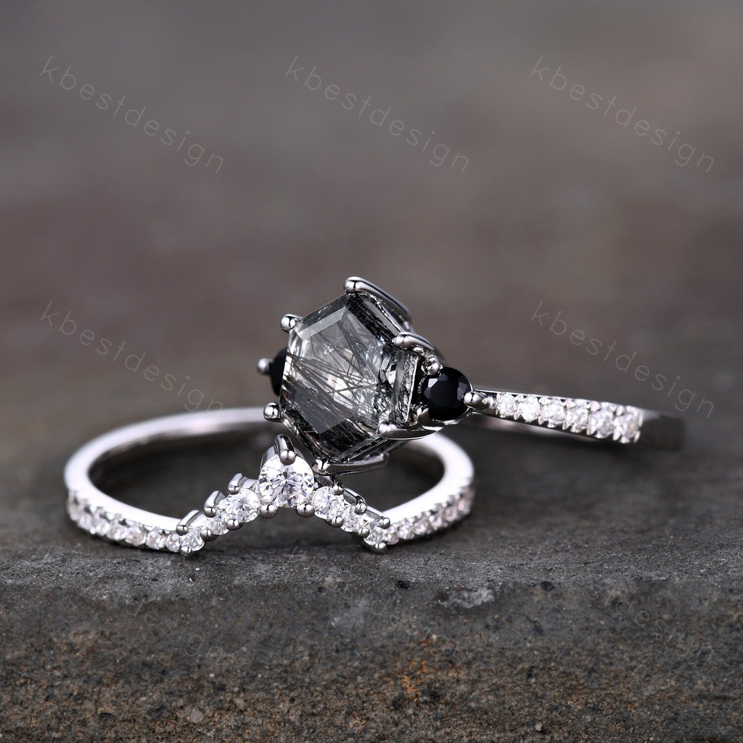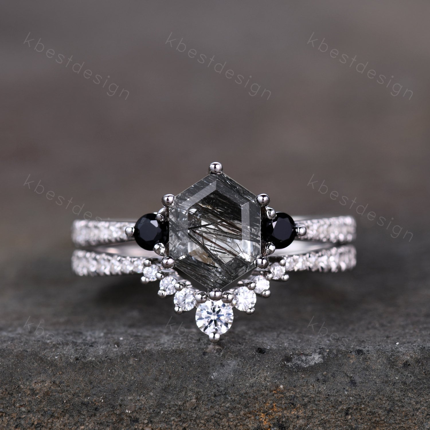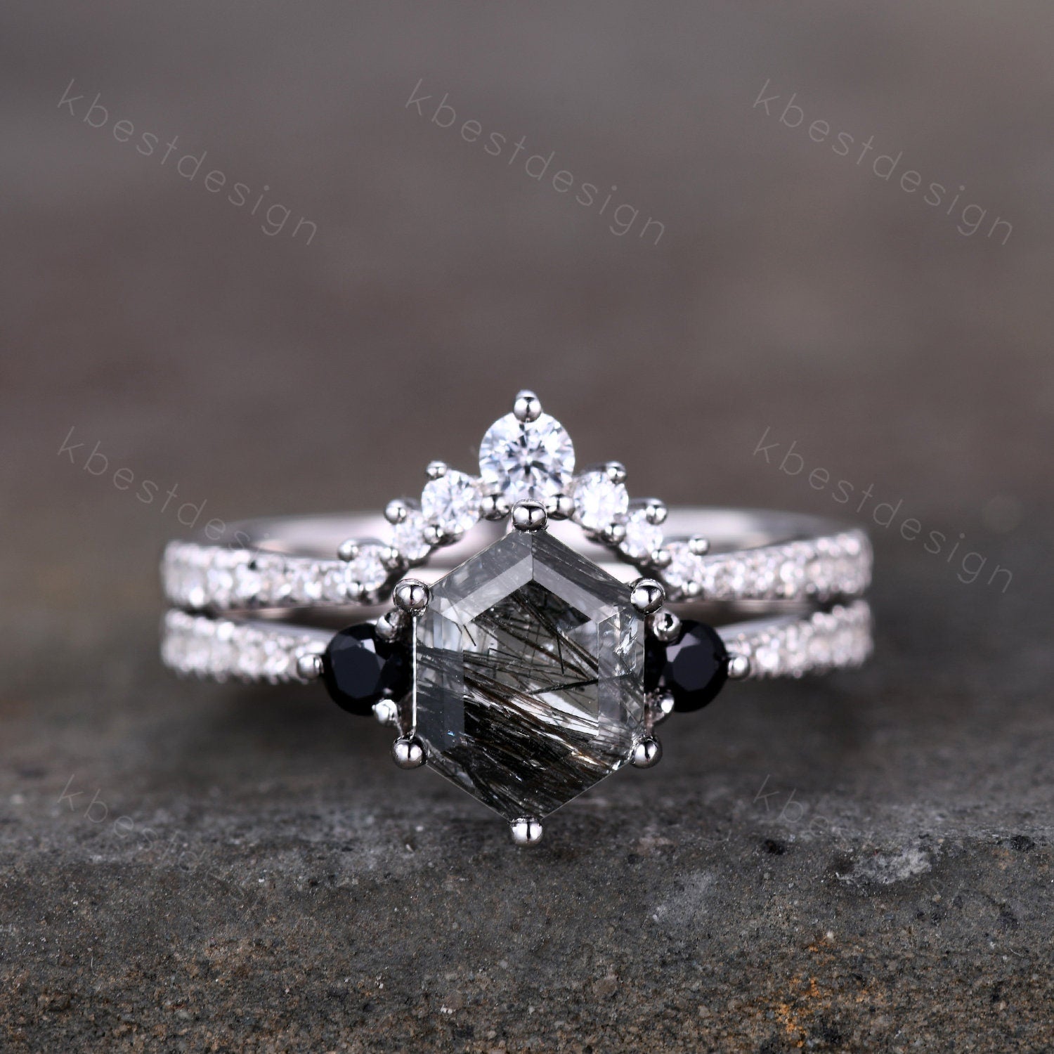 This is a beautiful hexagon black rutilated quartz and CZ diamond engagement ring SET in 925 sterling silver.