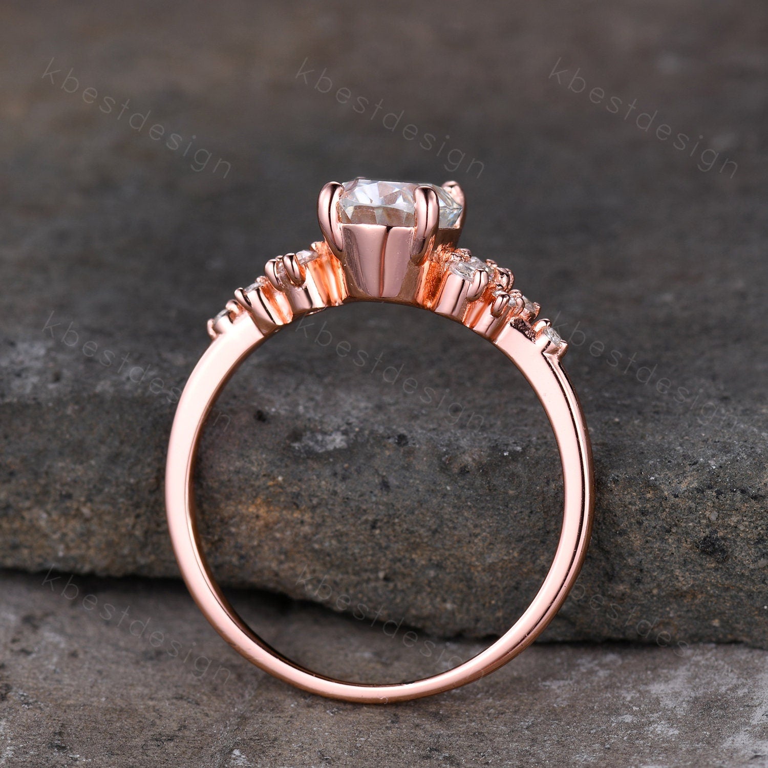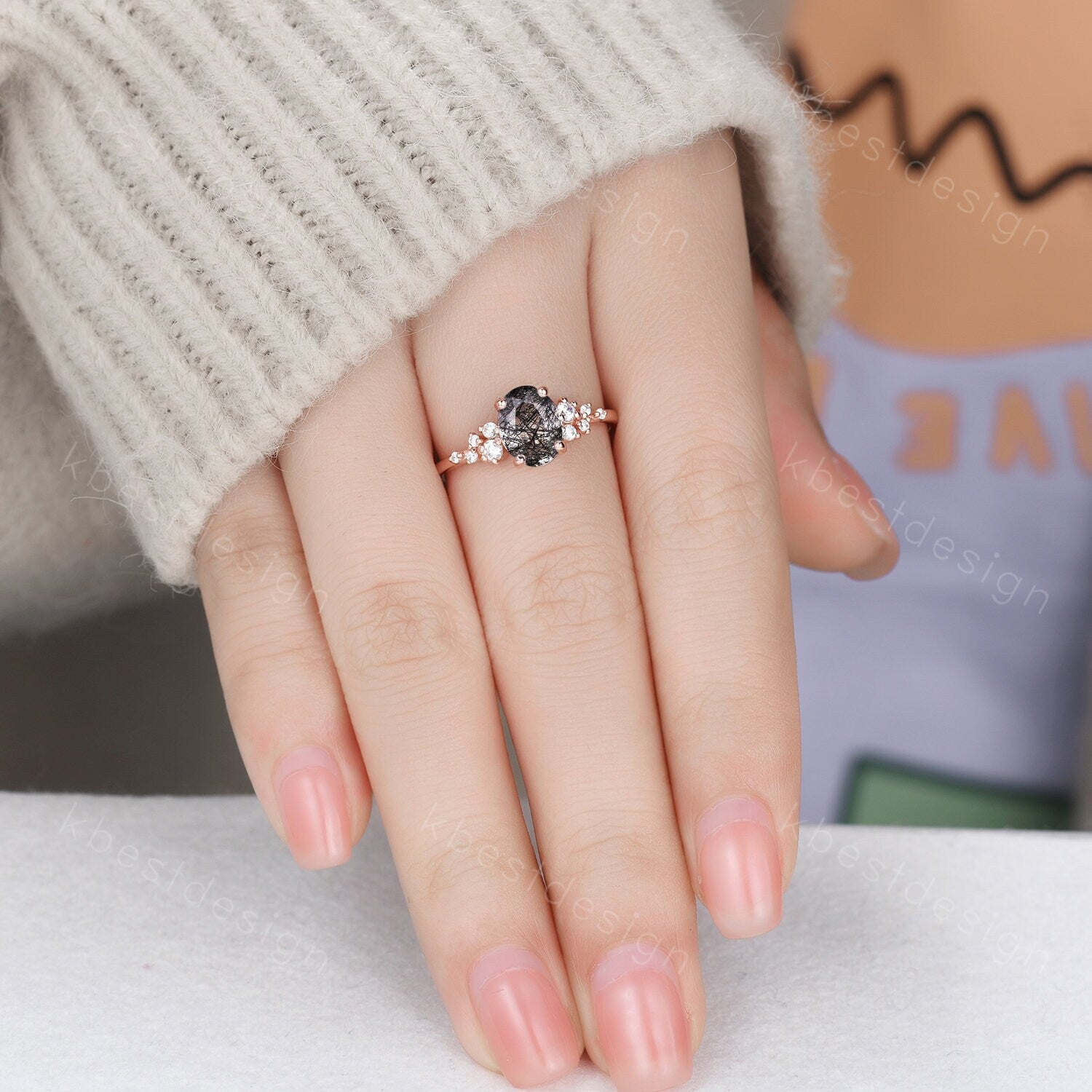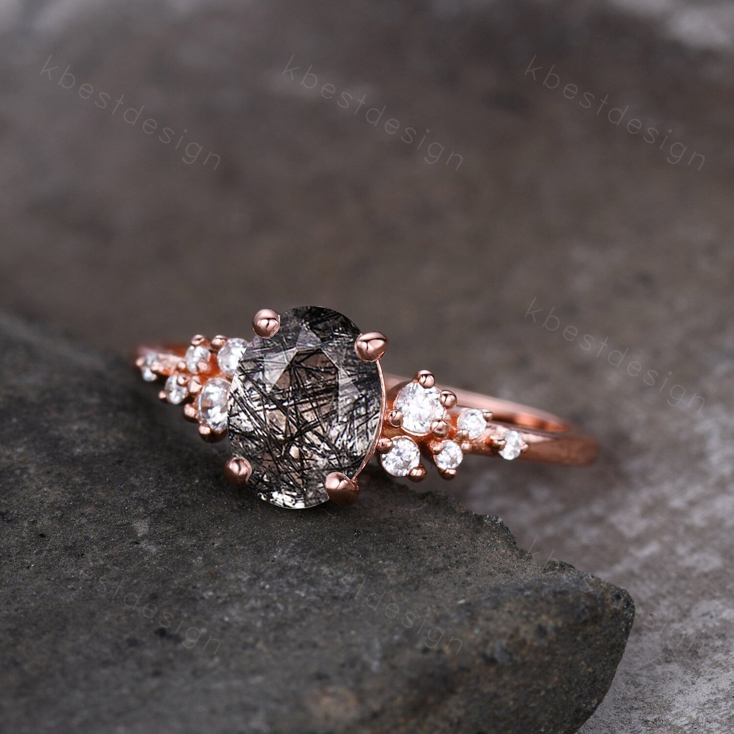 Vintage black rutilated quartz engagement ring unique cluster moissnaite ring women rose gold ring oval cut black stone bridal Promise ring
