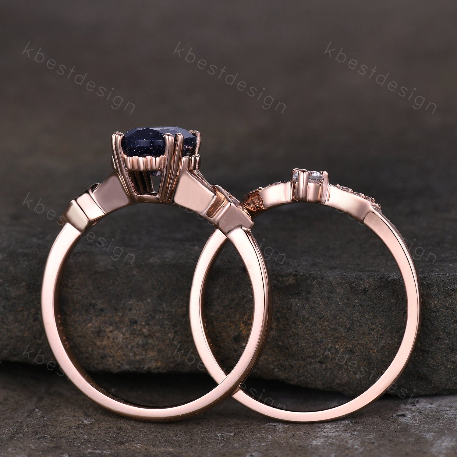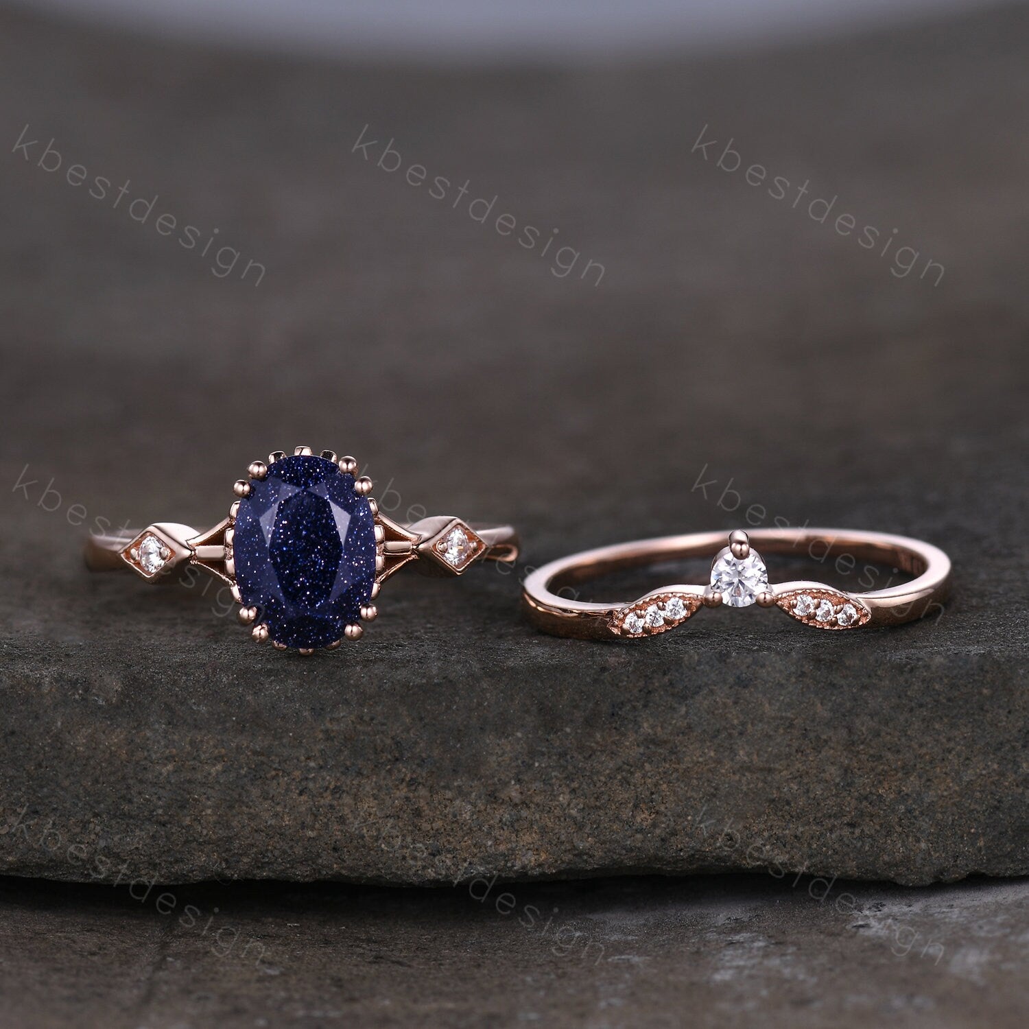 This is a Vintage Blue Sandstone Engagement Ring Set Oval cut Engagement Ring Unique Art Deco Moissanite Stacking Matching Band Bridal Promise Set A Modern oval cut meets an intricate nature inspired design in this unique galaxy sandstone stone engagement ring.