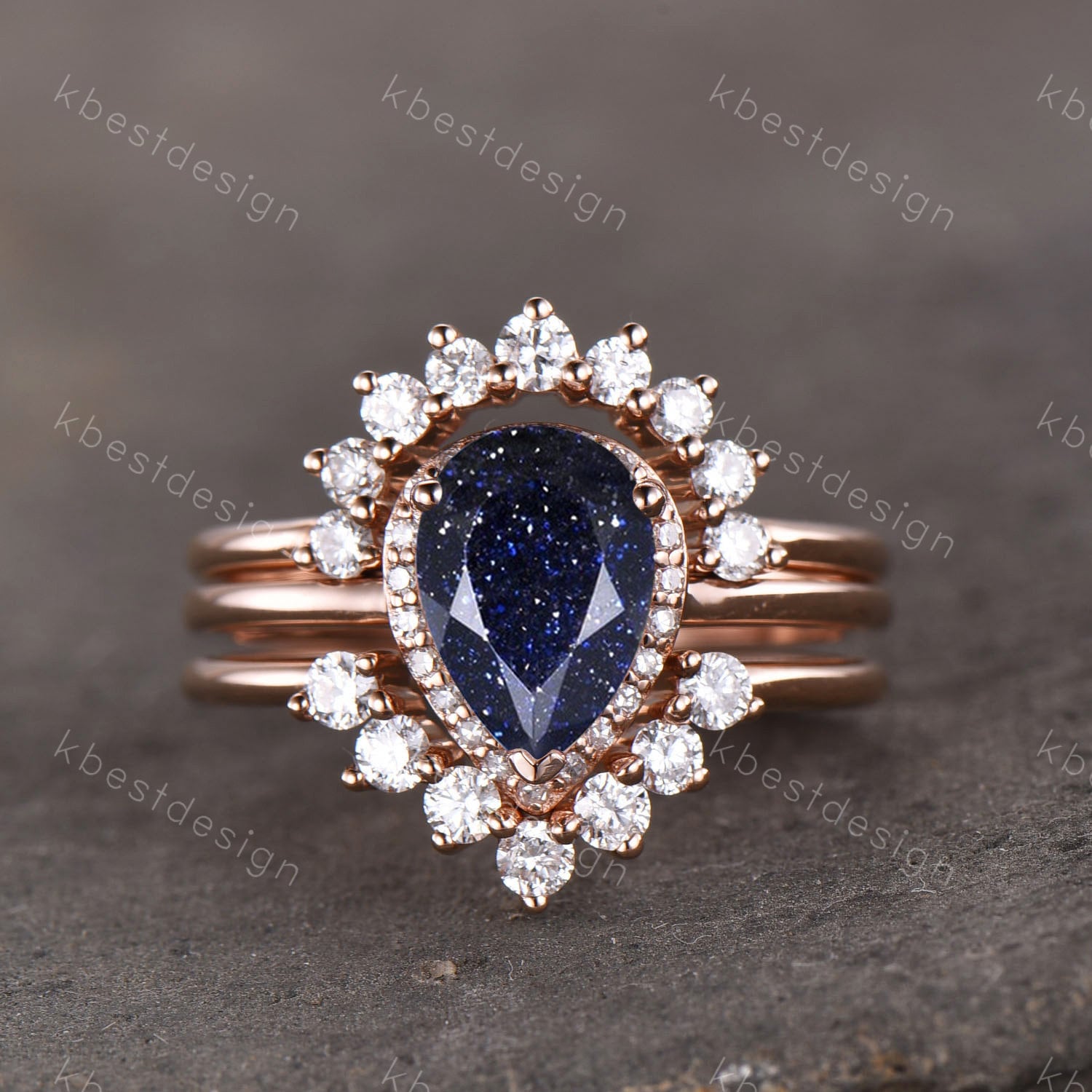 Vintage Blue Sandstone Wedding Ring Set Pear cut Blue Sandstone Engagement Ring Unique Curved Stacking Bands Bridal Promise Set Rose Gold
