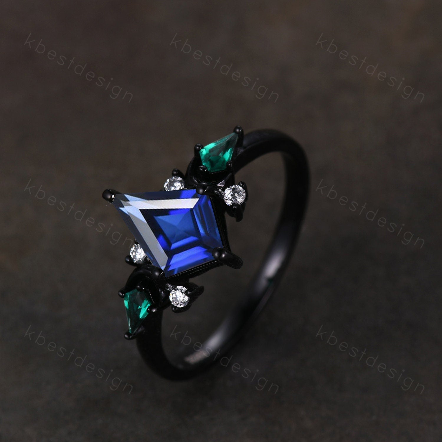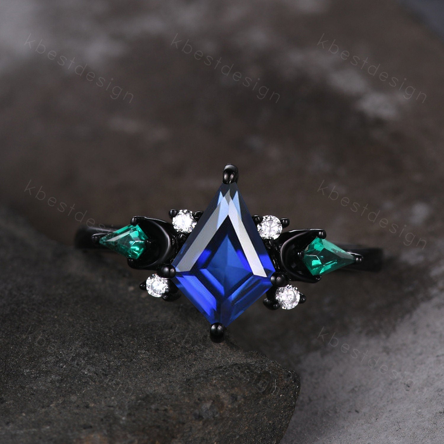 Vintage blue sapphire engagement ring Black gold ring Art deco moon design emerald wedding ring unique cluster bridal promise ring