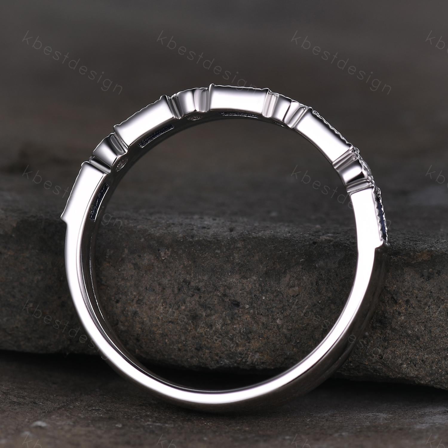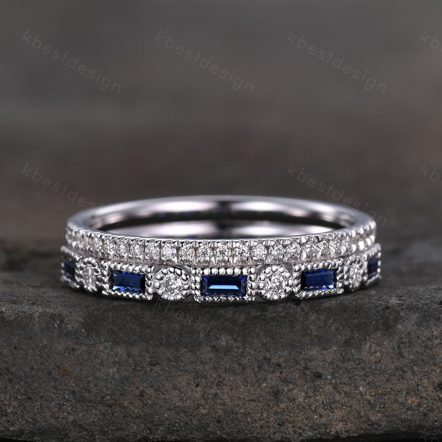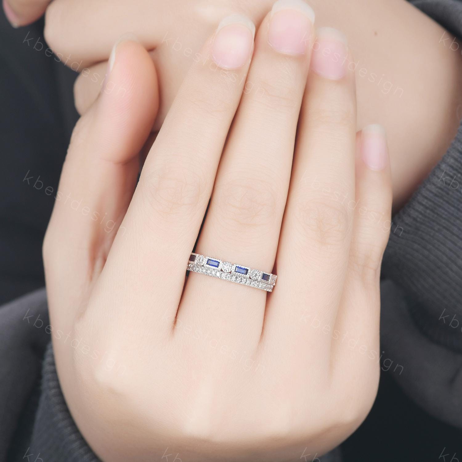 Vintage Blue Sapphire wedding band women Baguette cut Half eternity band White gold band Unique Moissanite Stacking bridal promise ring