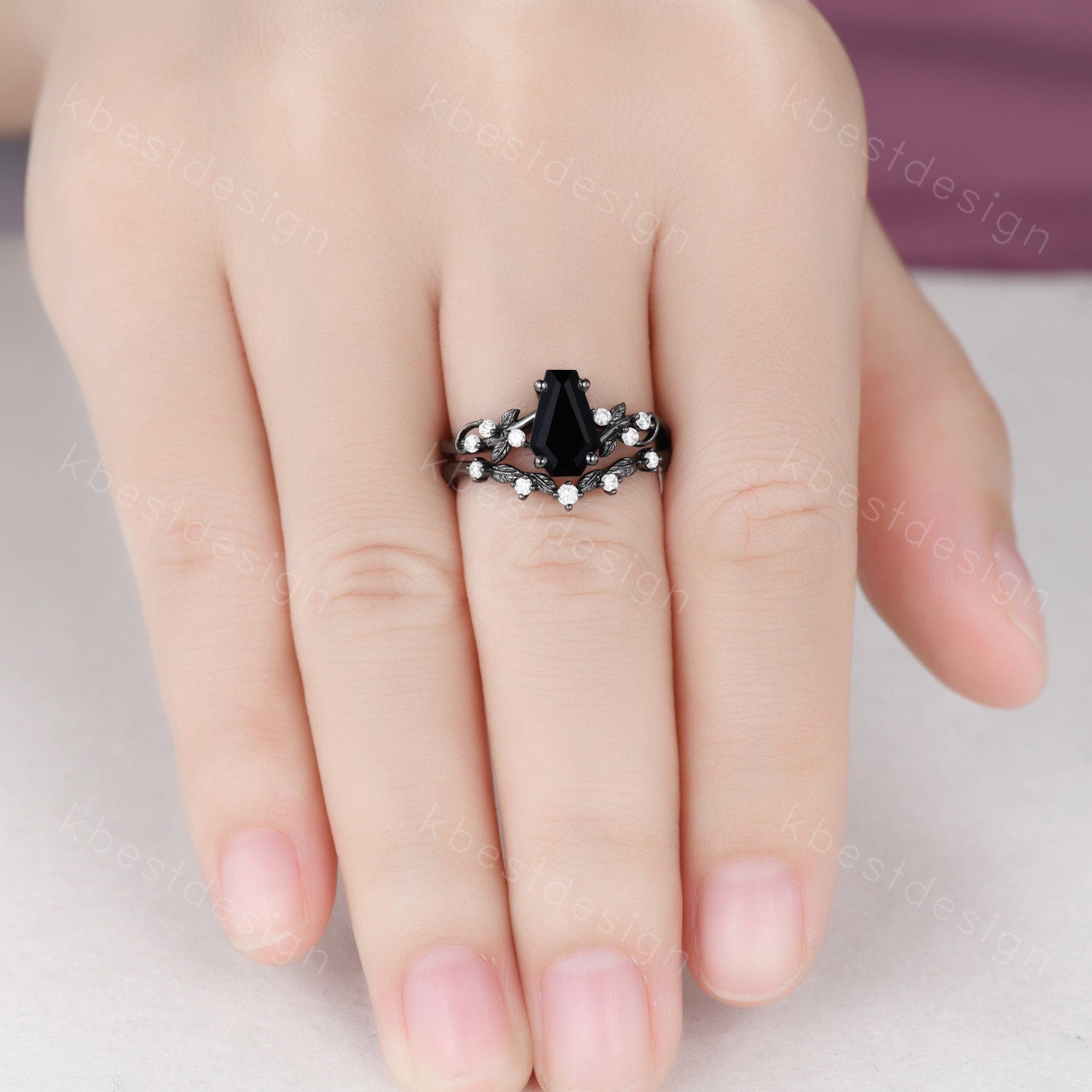 Vintage coffin cut black onyx engagement ring set black gold twig leaf moissanite ring nature branch ring unique bridal wedding ring set