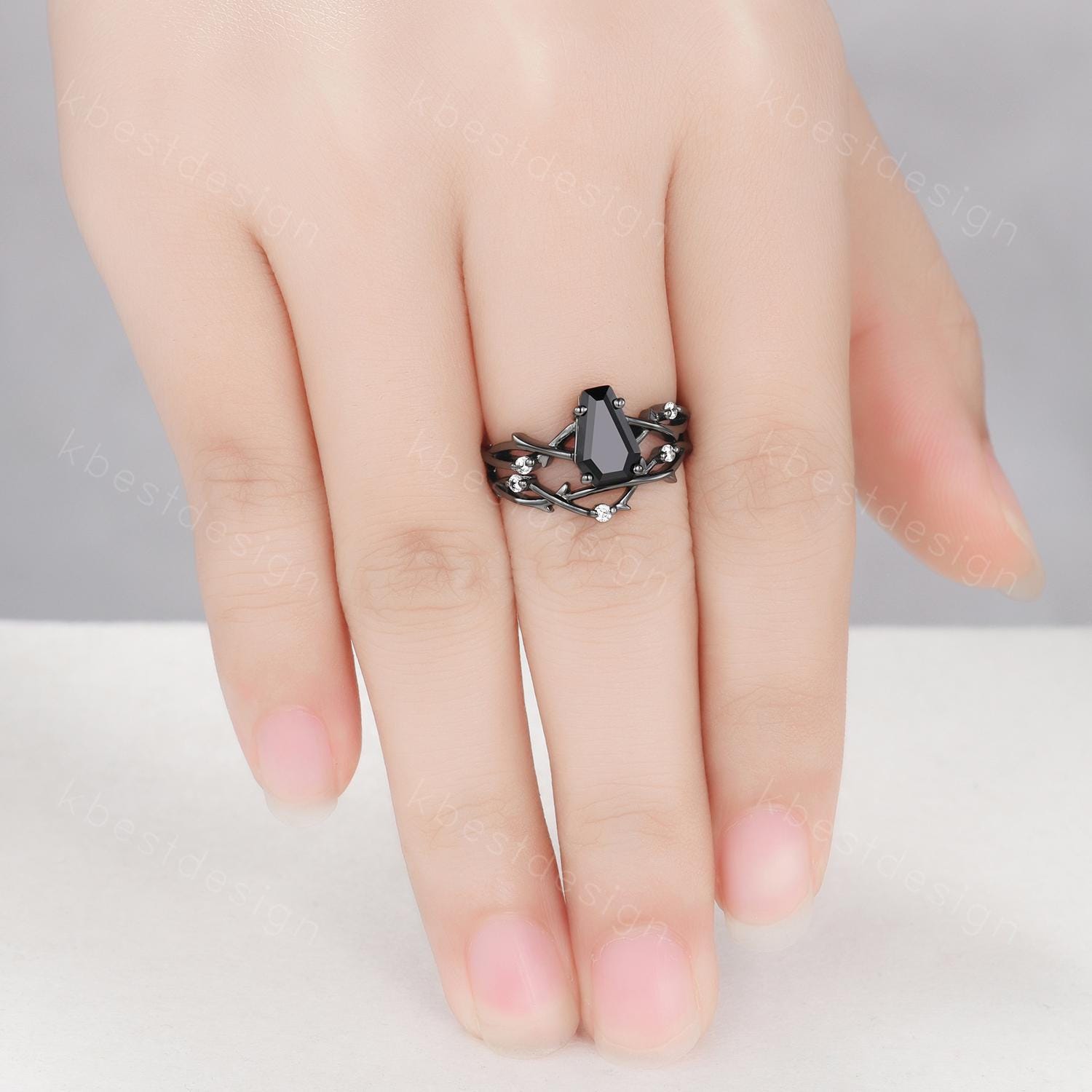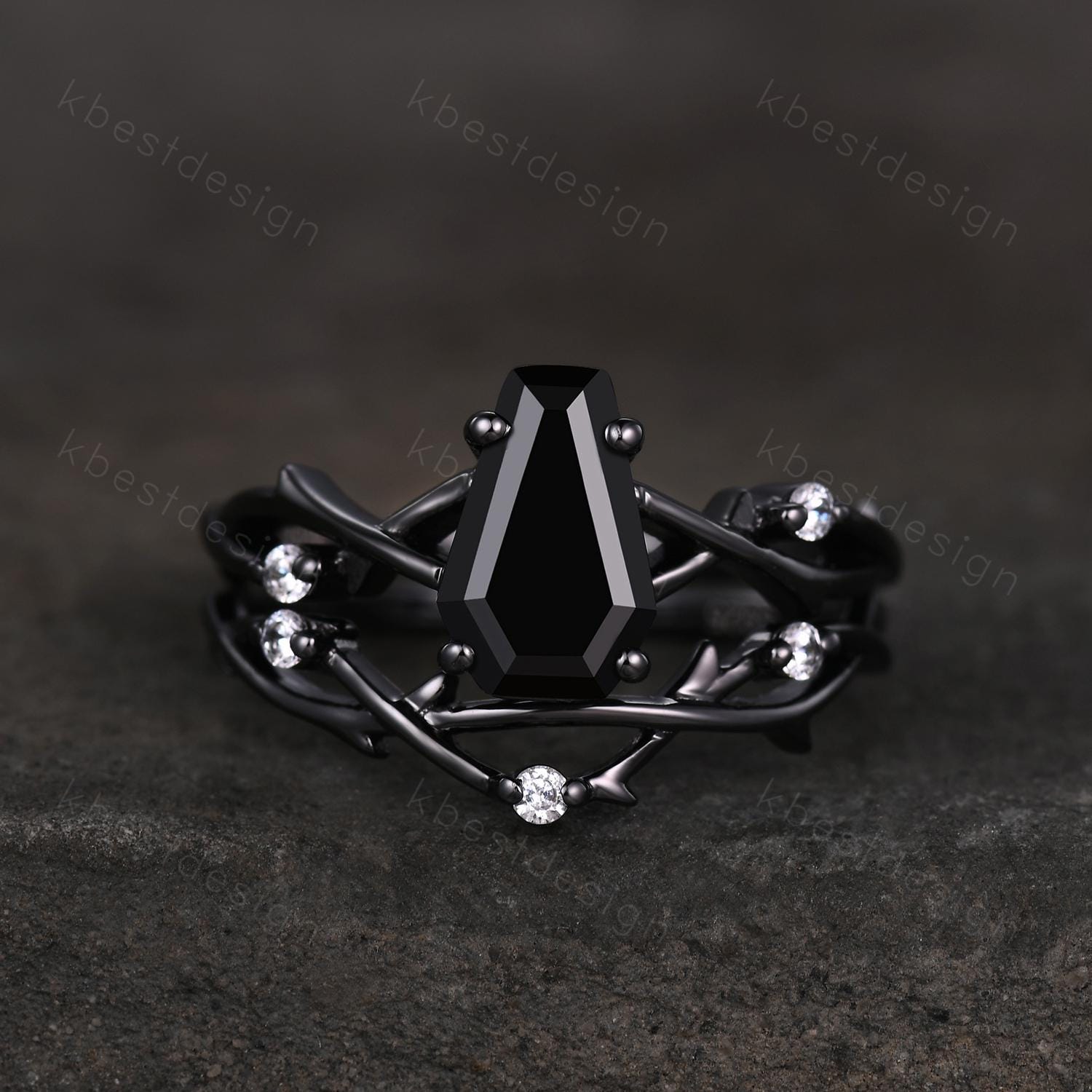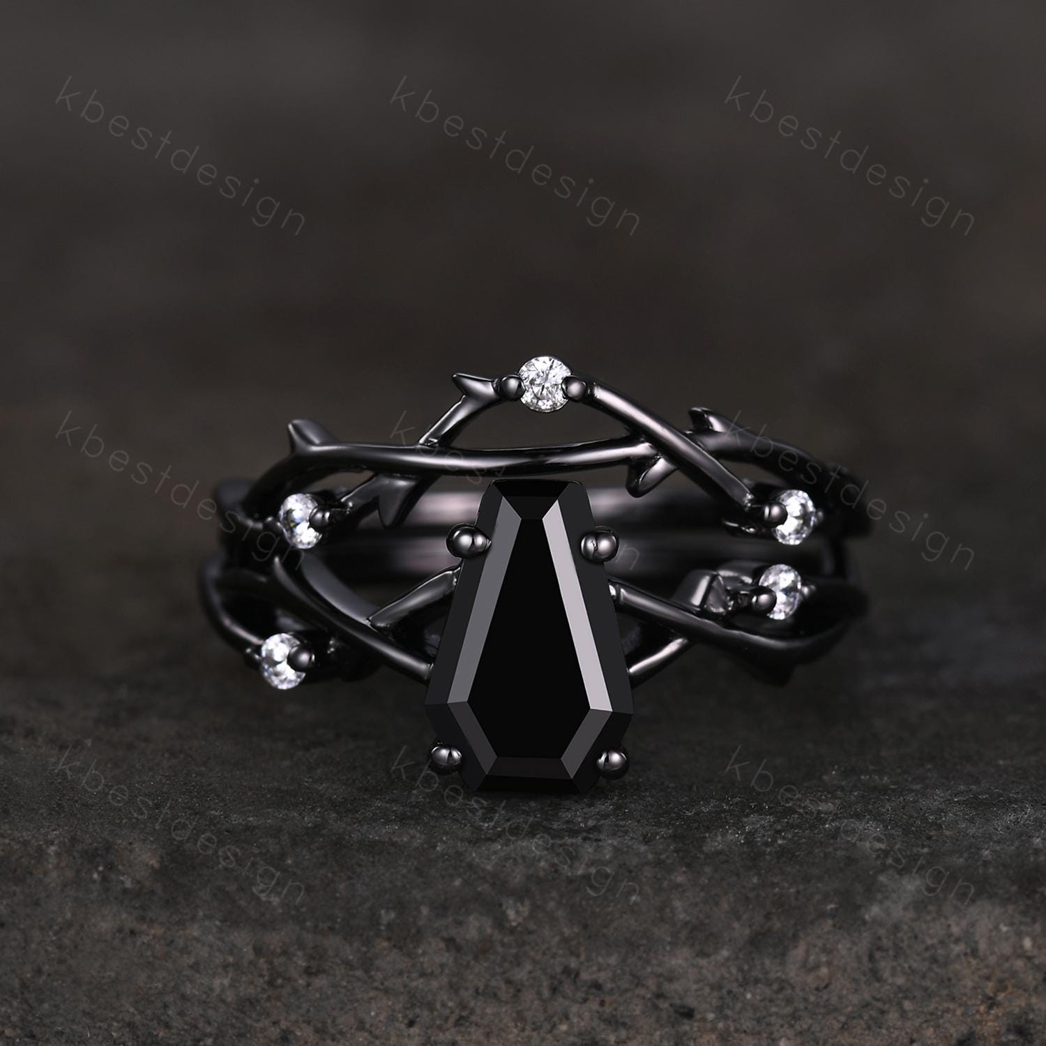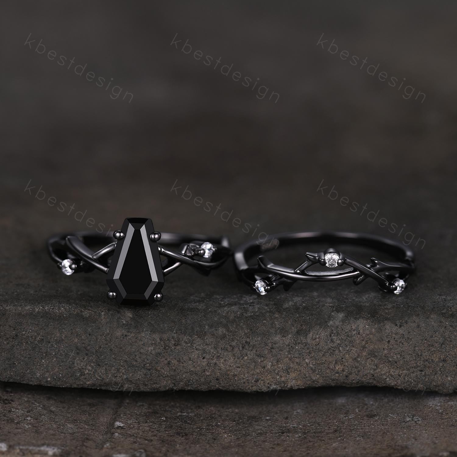 Vintage coffin cut black onyx engagement ring set black gold twig twisted moissanite ring nature branch ring unique bridal wedding ring set
