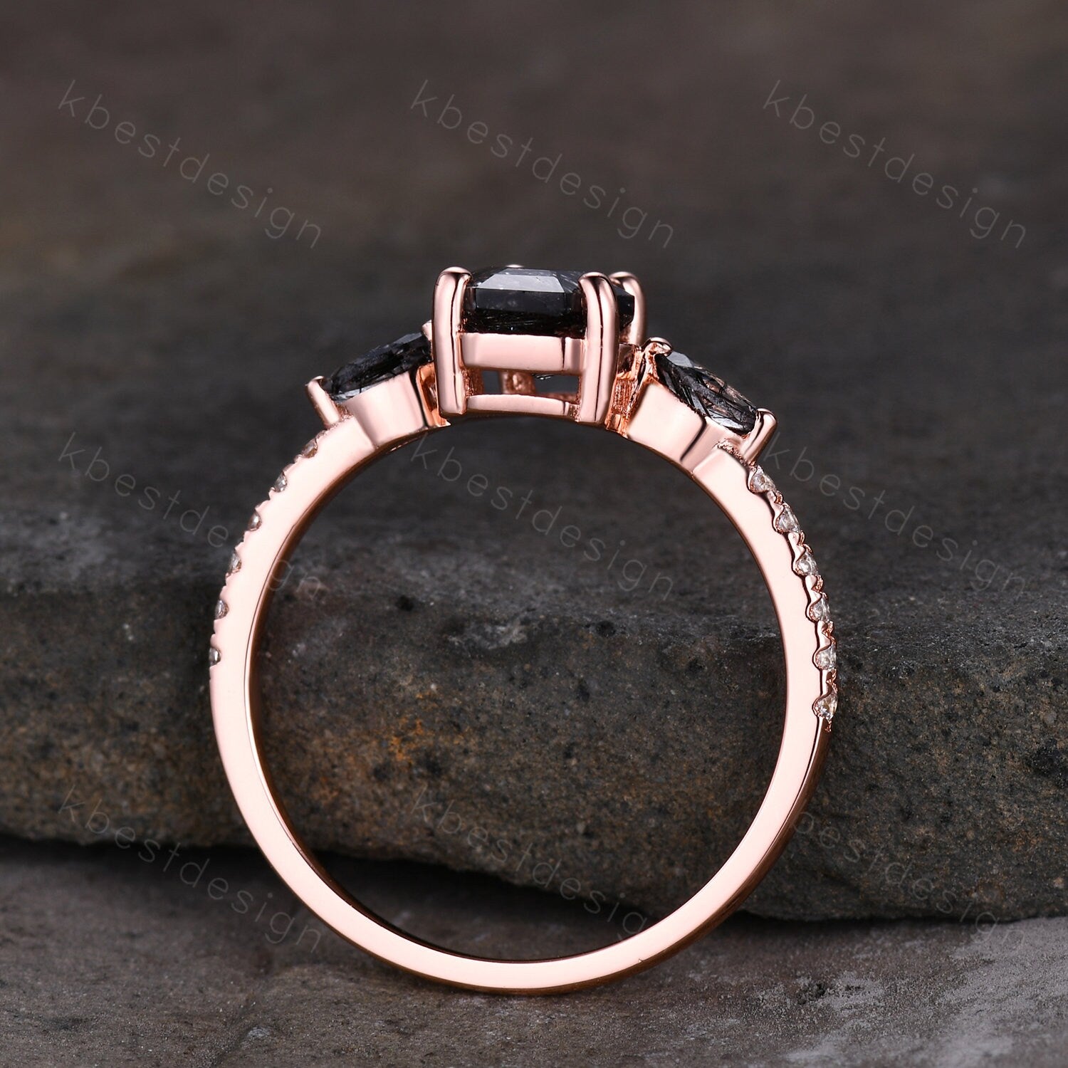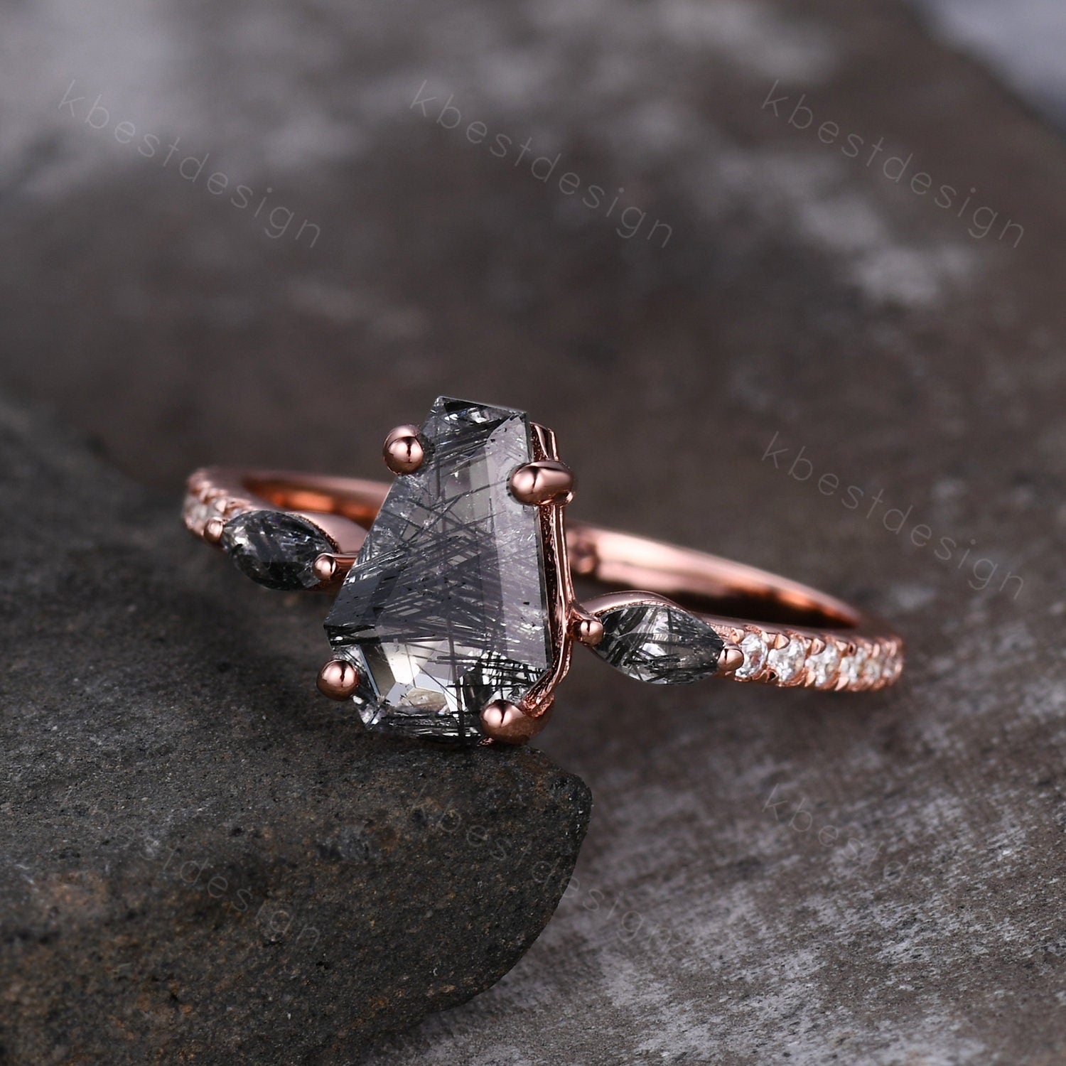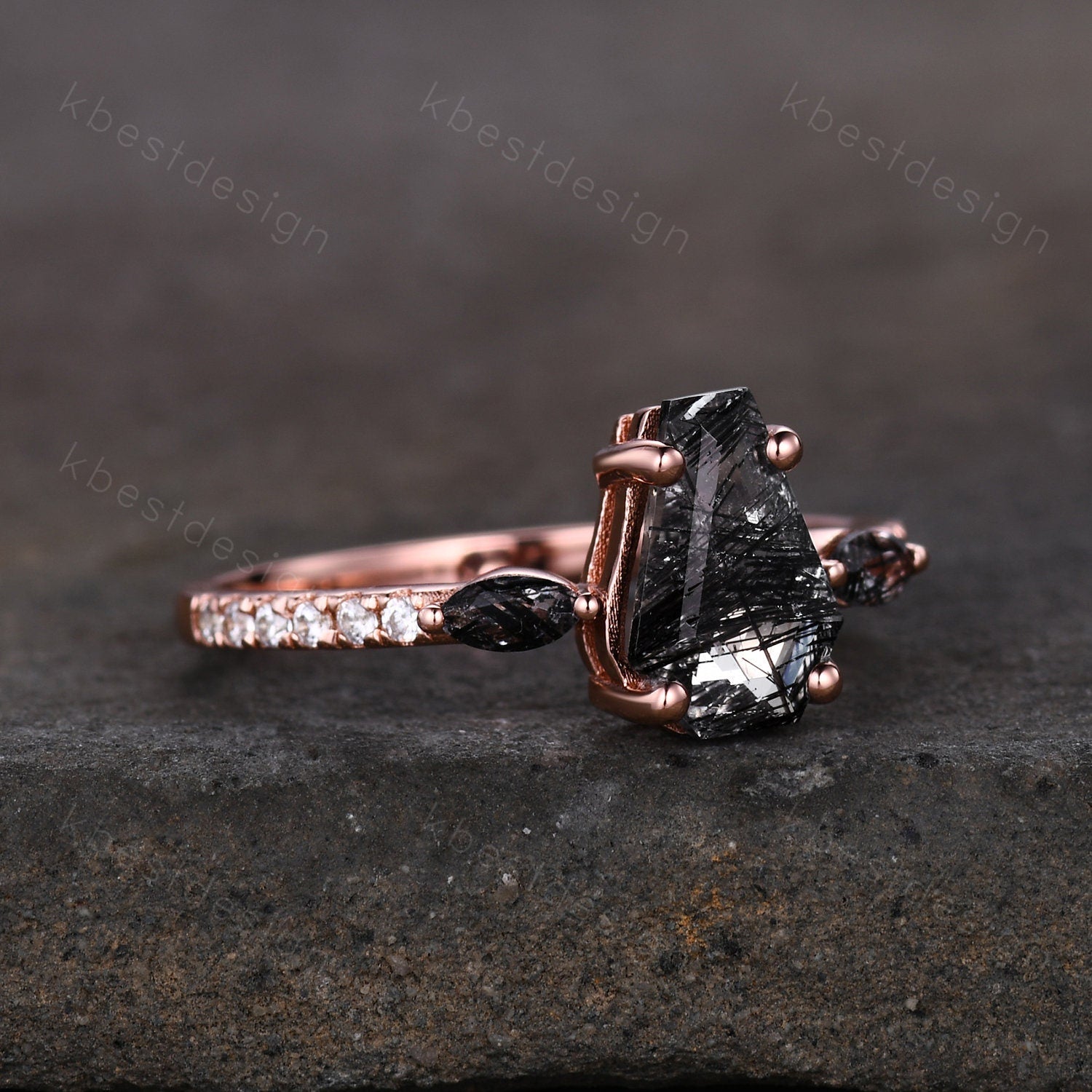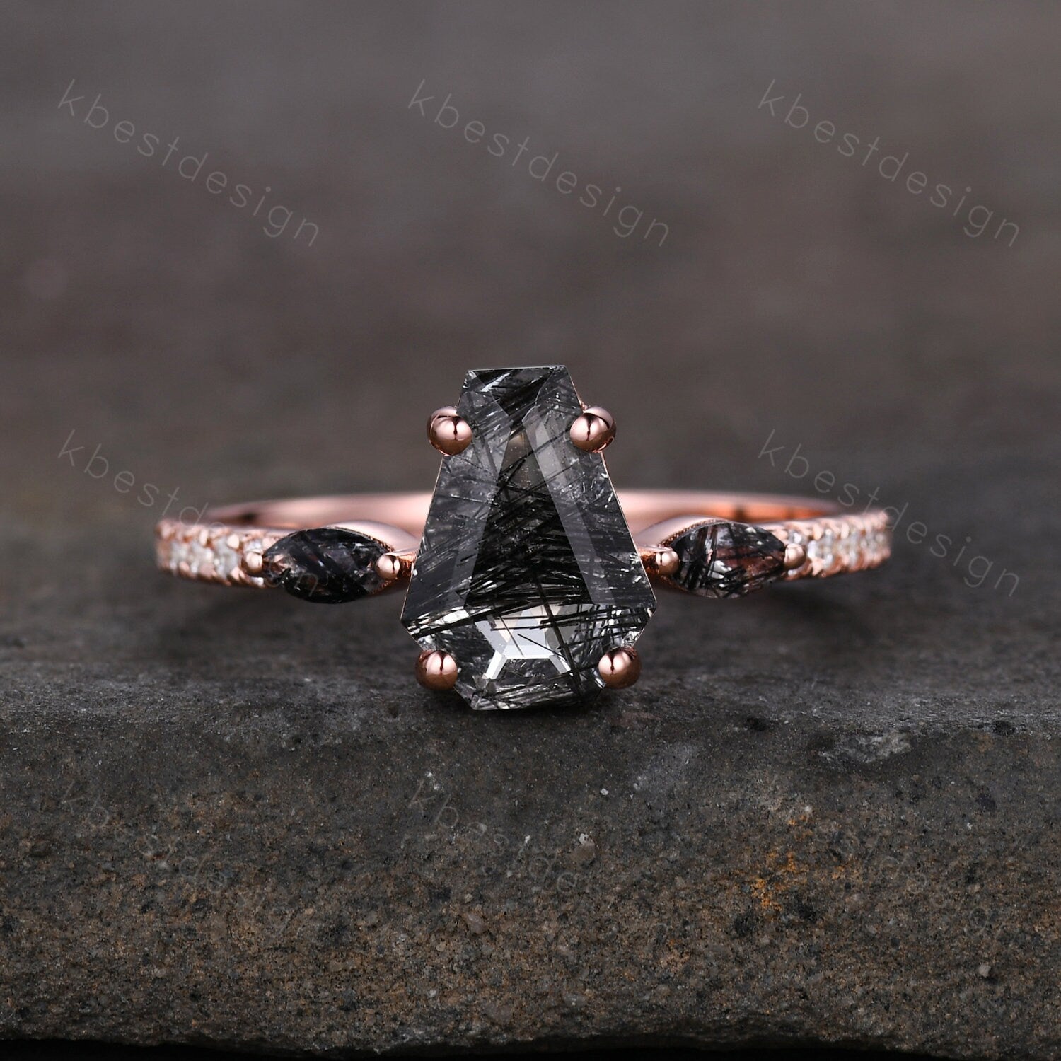 Vintage coffin cut black rutilated quartz engagement ring Marquise cut ring 14k Rose gold unique ring Moissanite pave band Anniversary ring