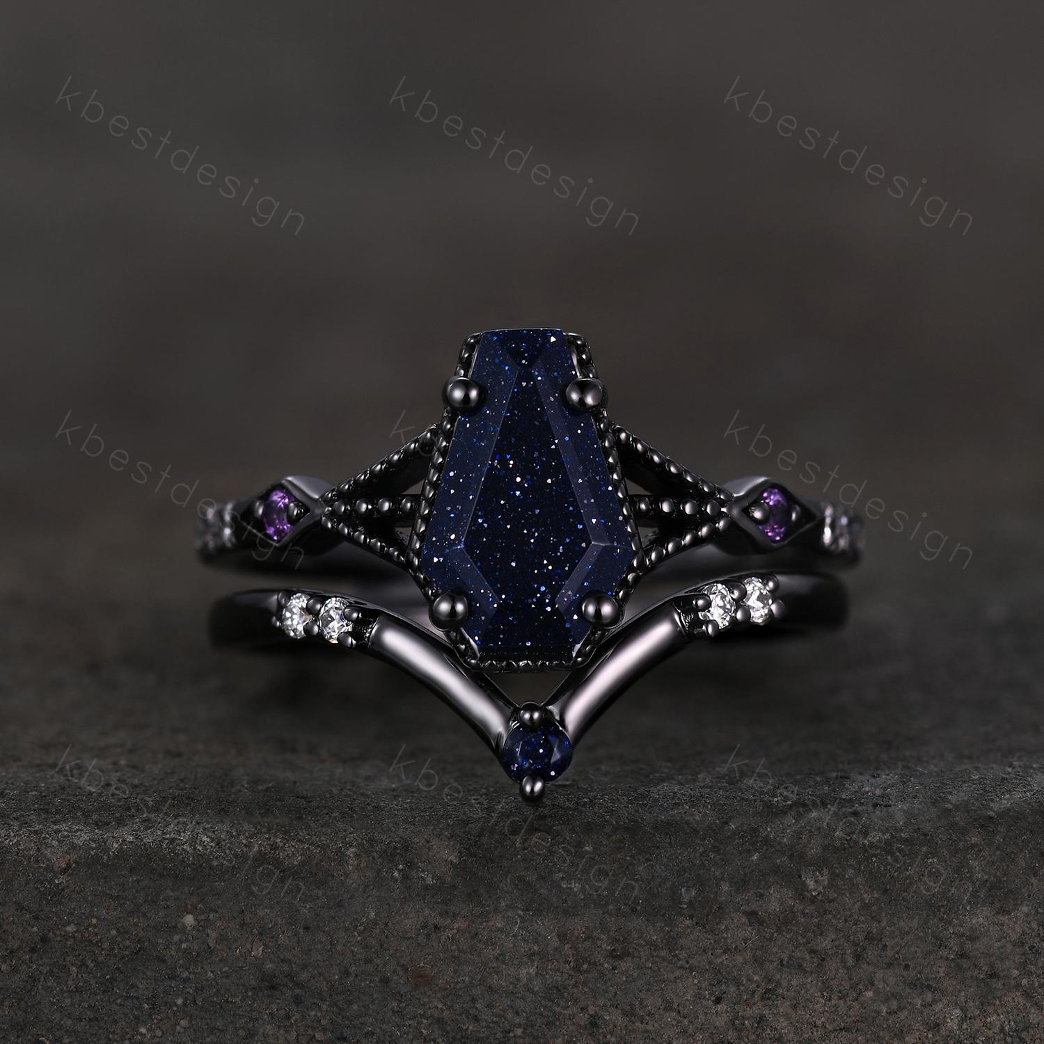 Vintage Coffin cut Blue Sandstone Engagement Ring Art Deco Galaxy Wedding Ring Gothic Black Gold Ring Unique Bridal Promise Set