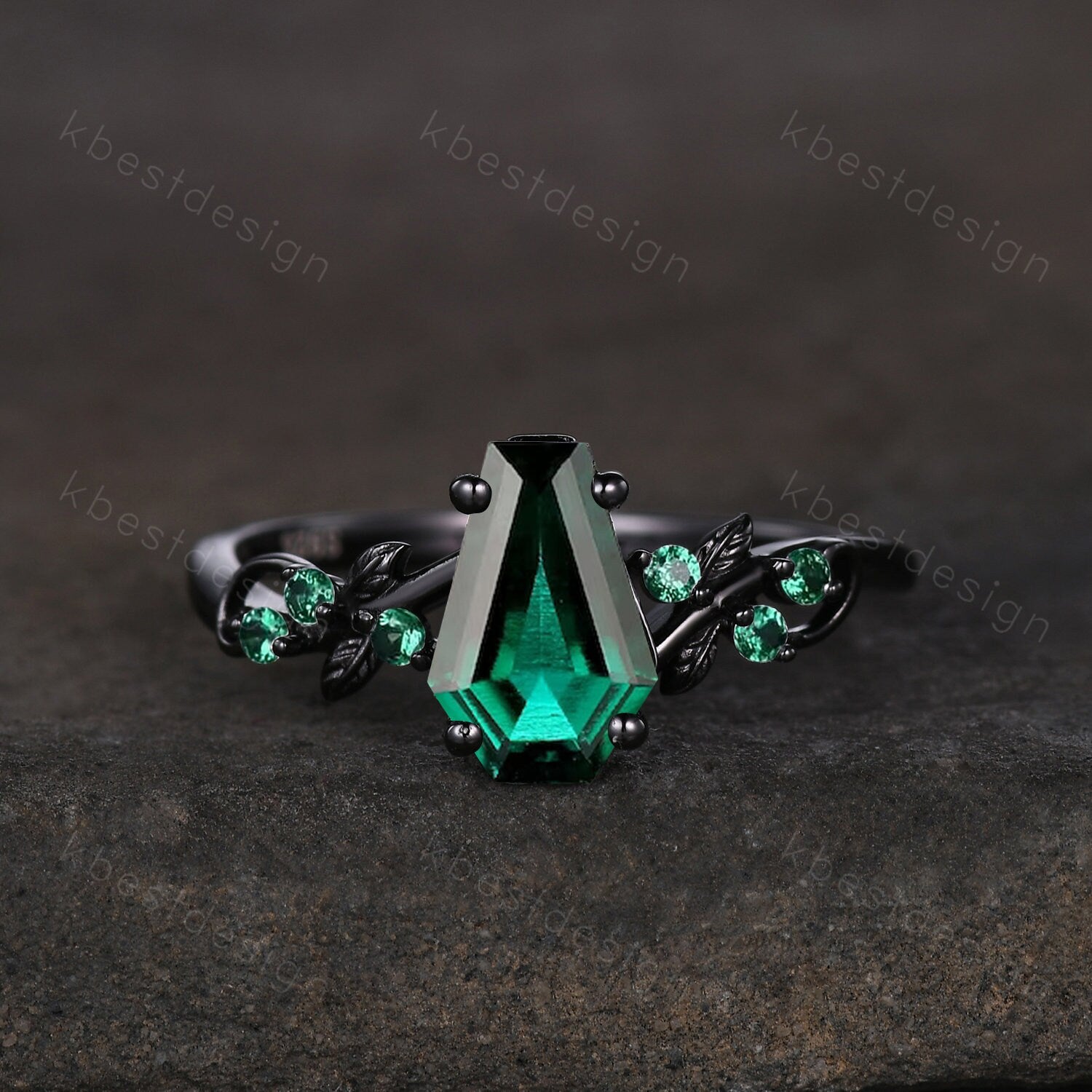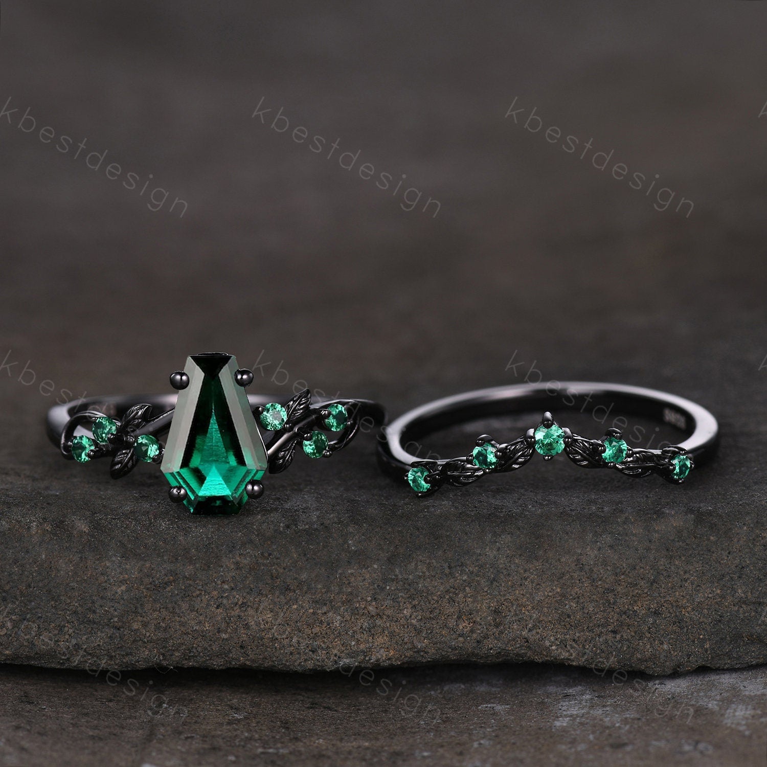 Vintage Coffin cut Emerald Engagement Ring Art Deco Branch Design Leaf Emerald Wedding Ring Gothic Black Gold Ring Unique Bridal Promise Set