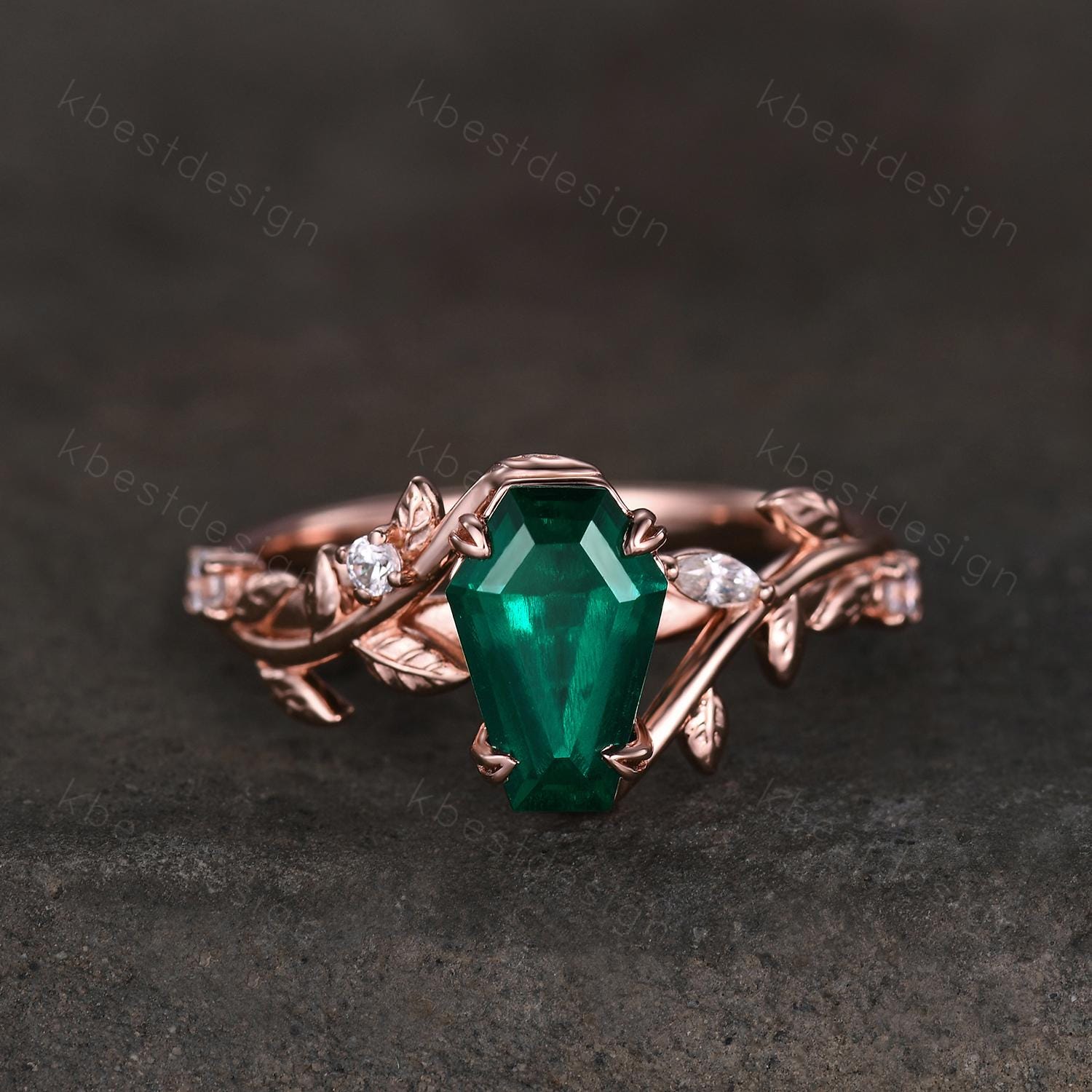 Vintage coffin green emerald engagement ring rose gold twig leaf moissanite wedding ring nature inspired ring Emerald bridal promise ring