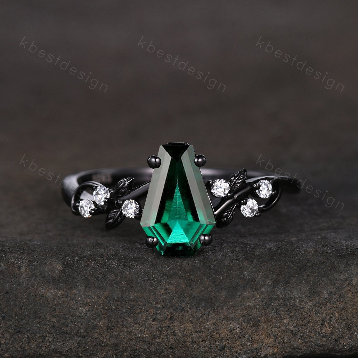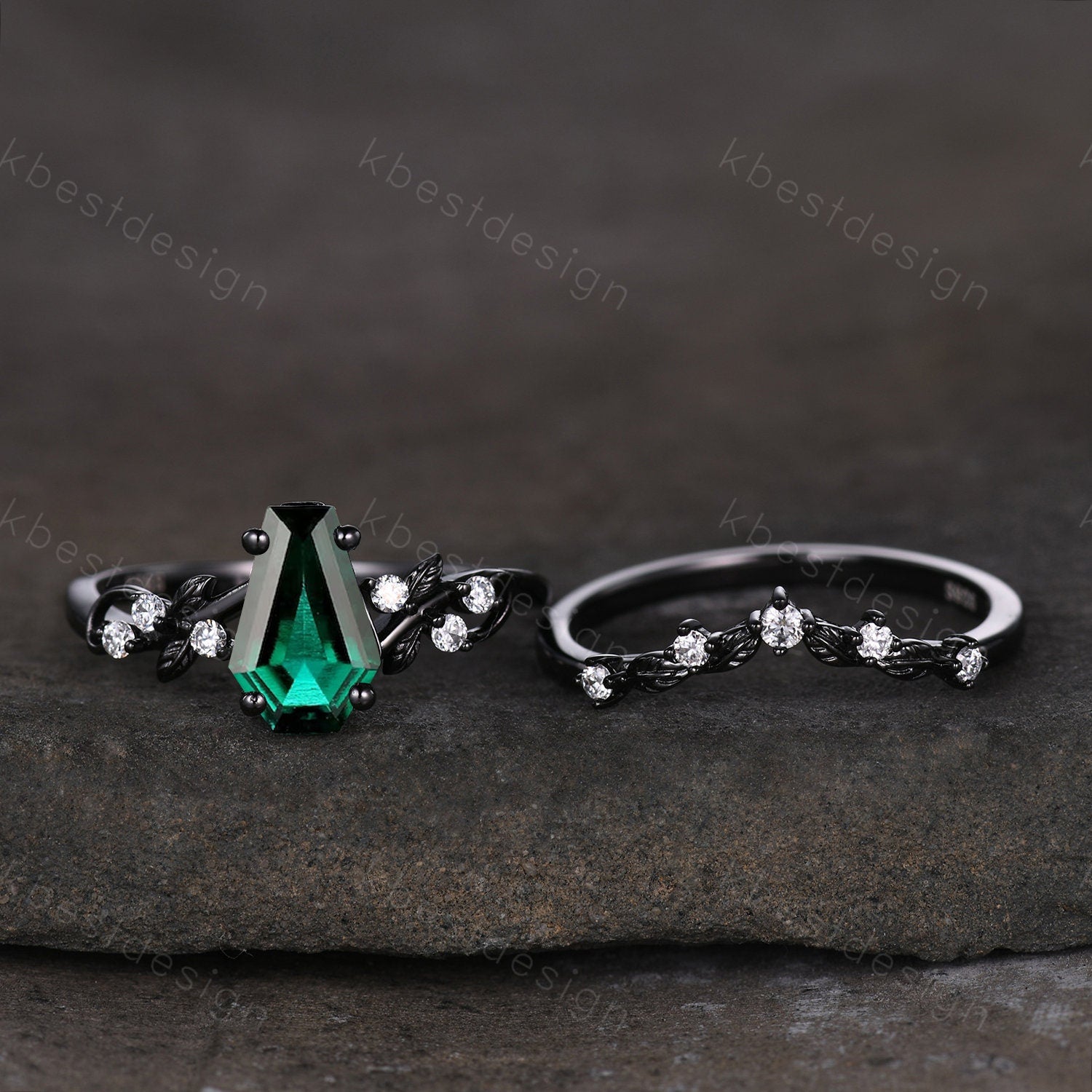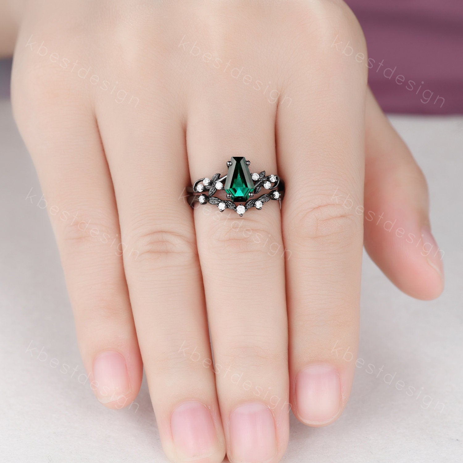 Vintage coffin green emerald engagement ring set black gold twig leaf moissanite ring May birthstone ring unique bridal wedding ring set