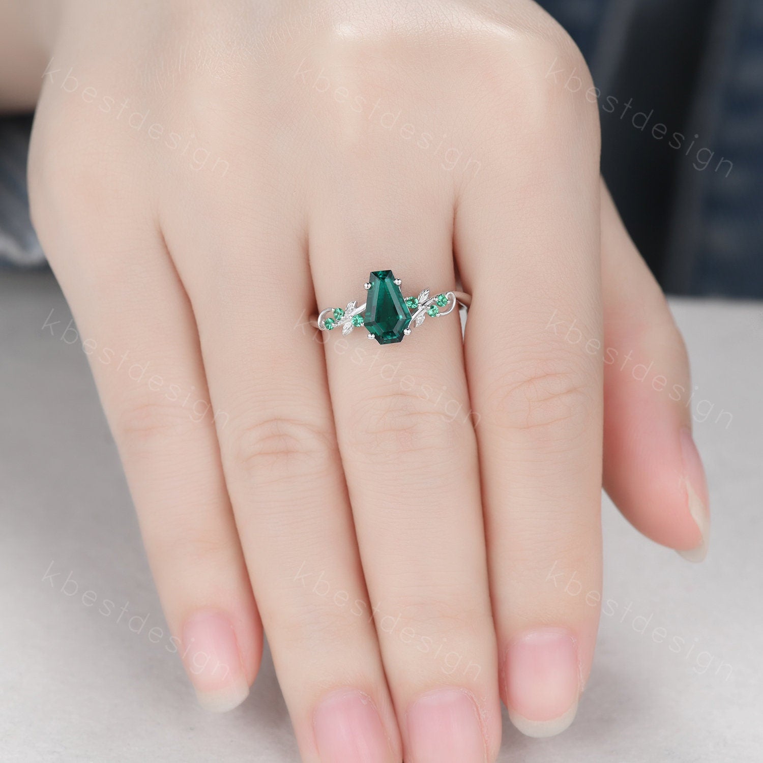 Vintage coffin green emerald engagement ring silver twig leaf emerald wedding ring nature inspired ring art deco bridal promise ring
