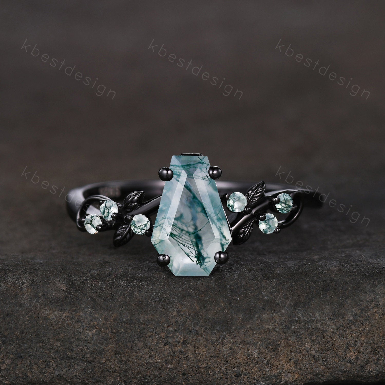 Vintage coffin moss agate engagement ring set black gold twig leaf ring natural green agate ring unique bridal wedding ring set promise ring