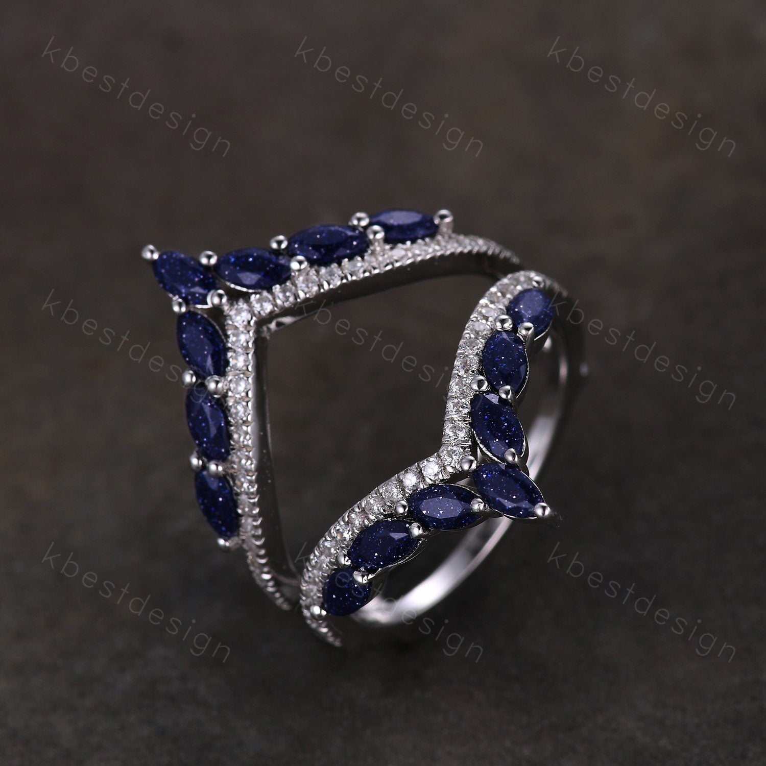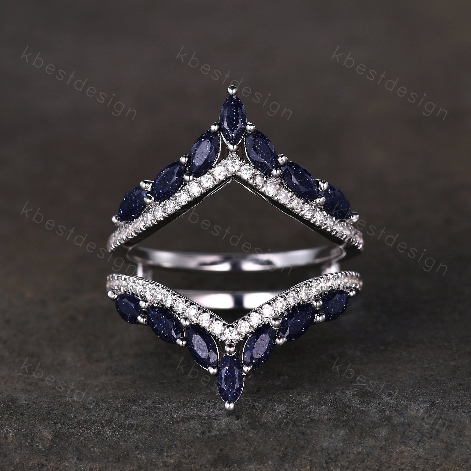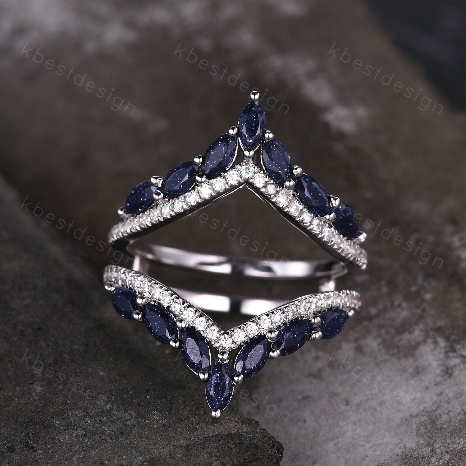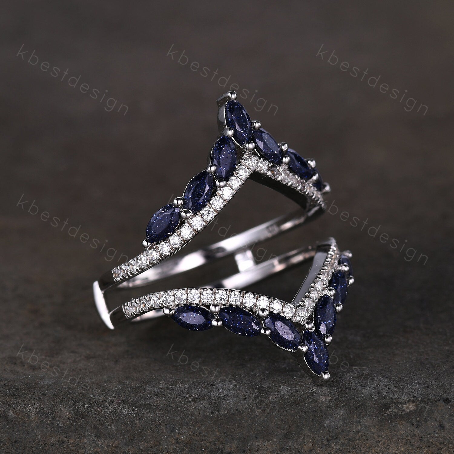 Vintage curved Blue Sandstone wedding band unique double curve stacking band marquise cut enhancer matching band Unique bridal promise gift