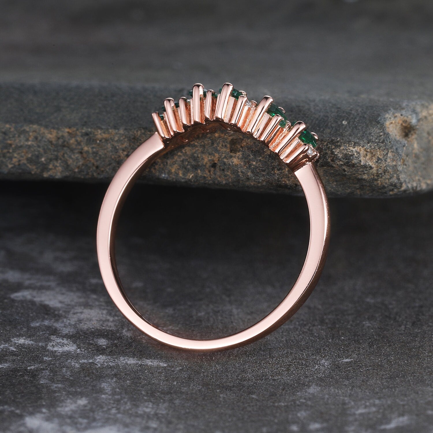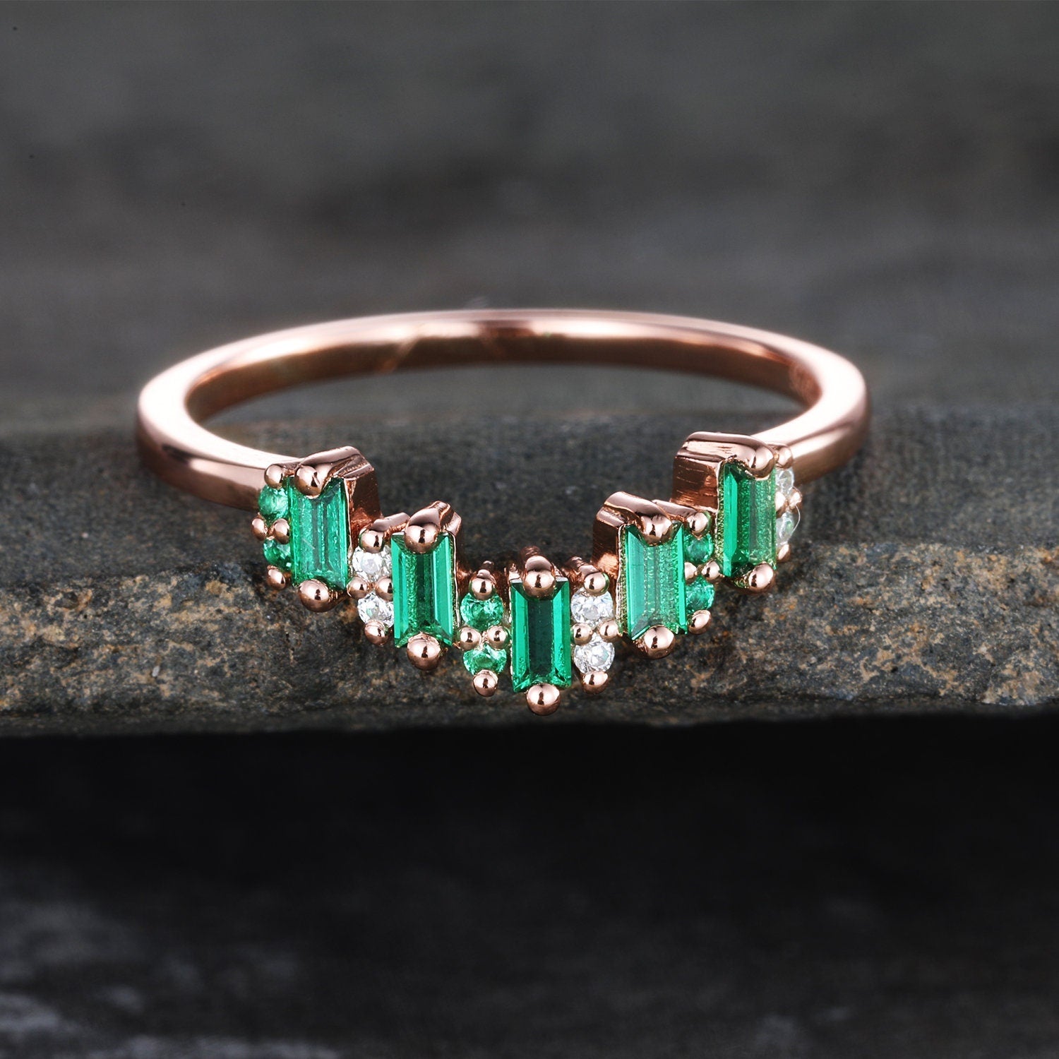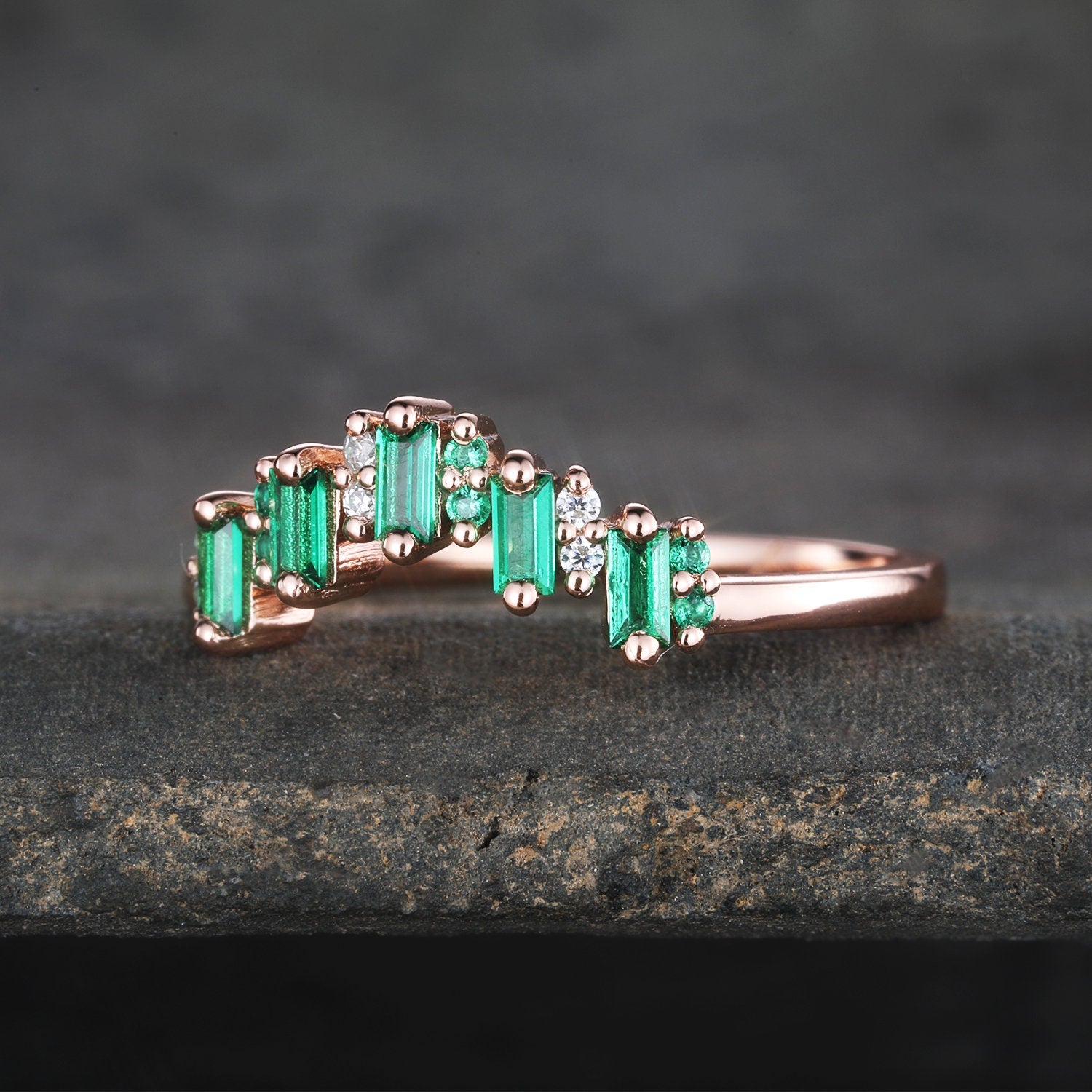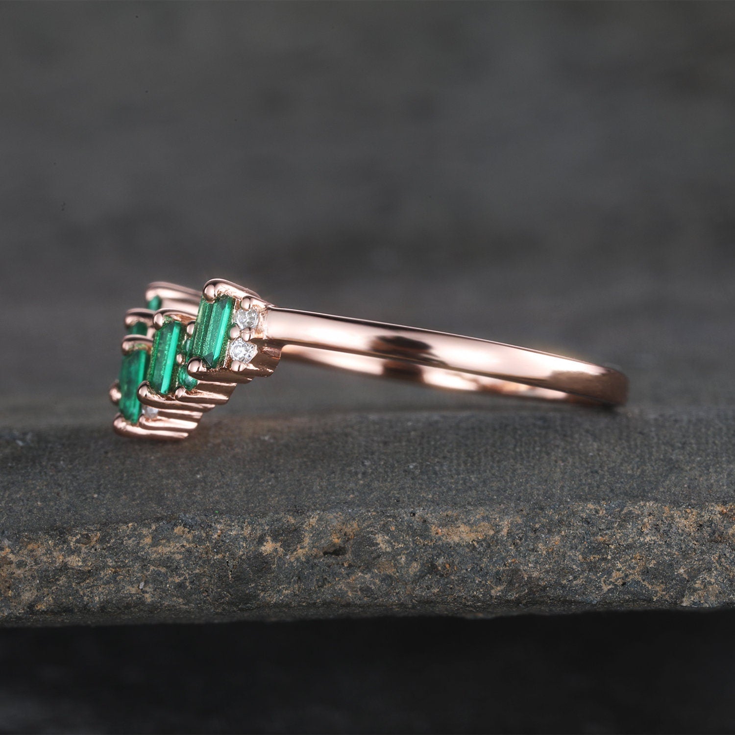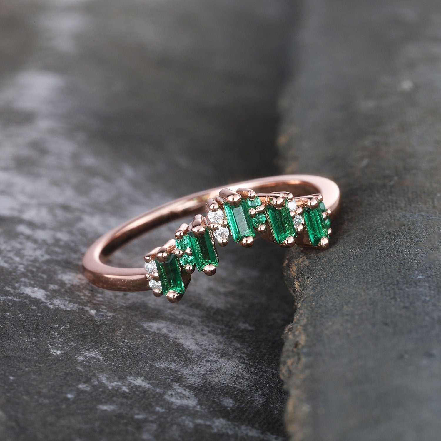 Vintage Curved Emerald Band Baguette Cut Emerald Wedding Ring Rose Gold Ring Green Stone Ring Stacking Matching Band May Birthstone