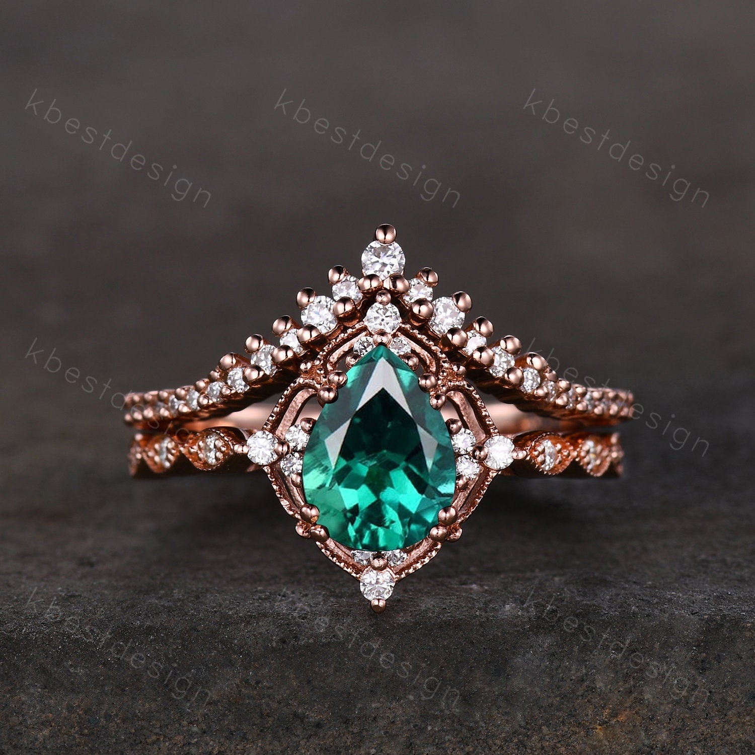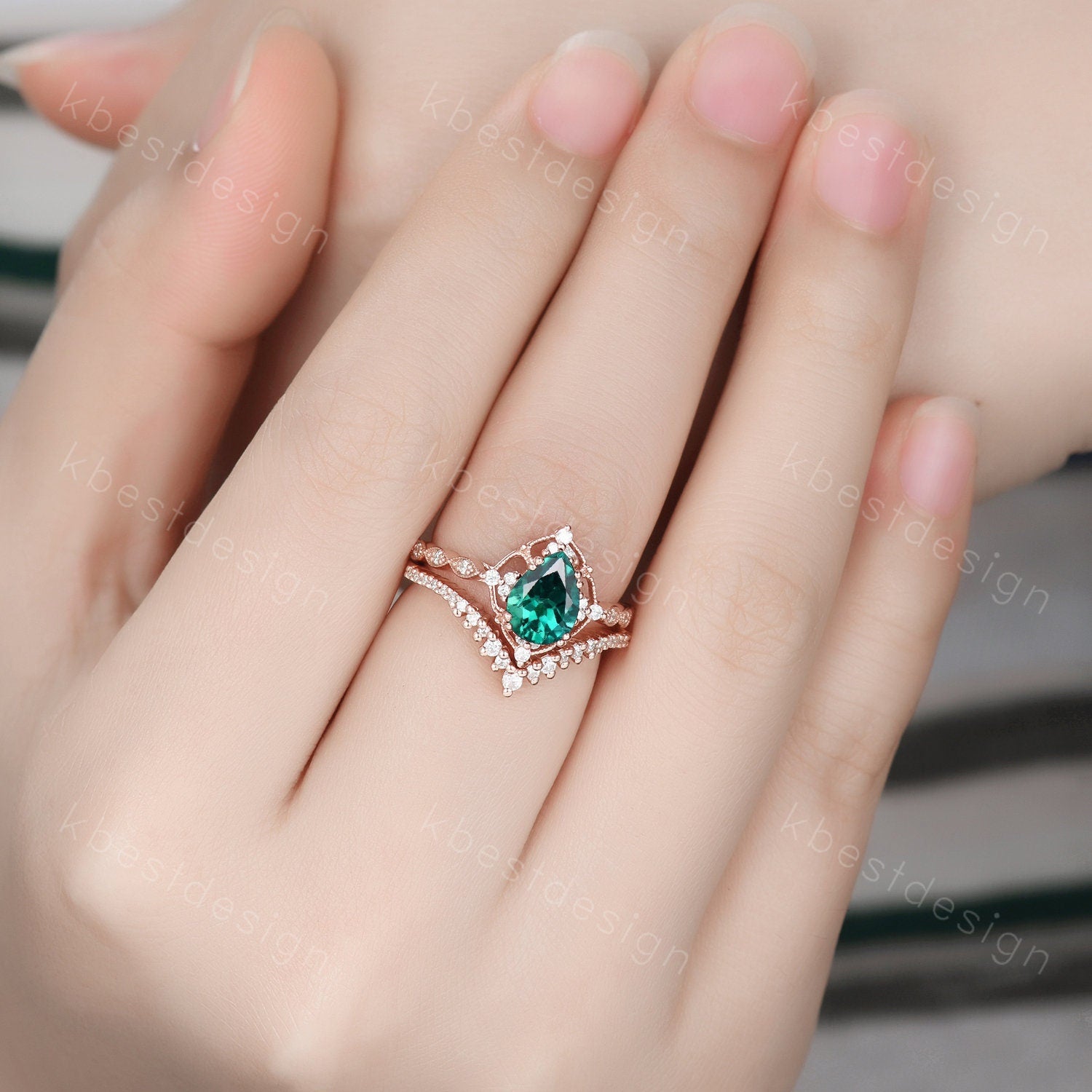 Vintage emerald engagement ring set rose gold emerald ring unique curved Moissanite stacking band pear shaped bridal set Promise ring