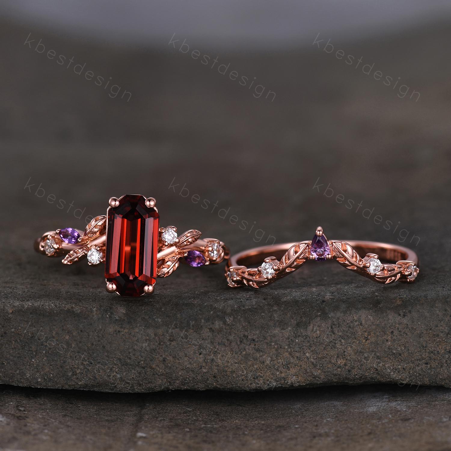 This is a beautiful Vintage emerald garnet engagement ring set rose gold twig leaf amethyst ring nature branch ring unique art deco bridal wedding ring set.