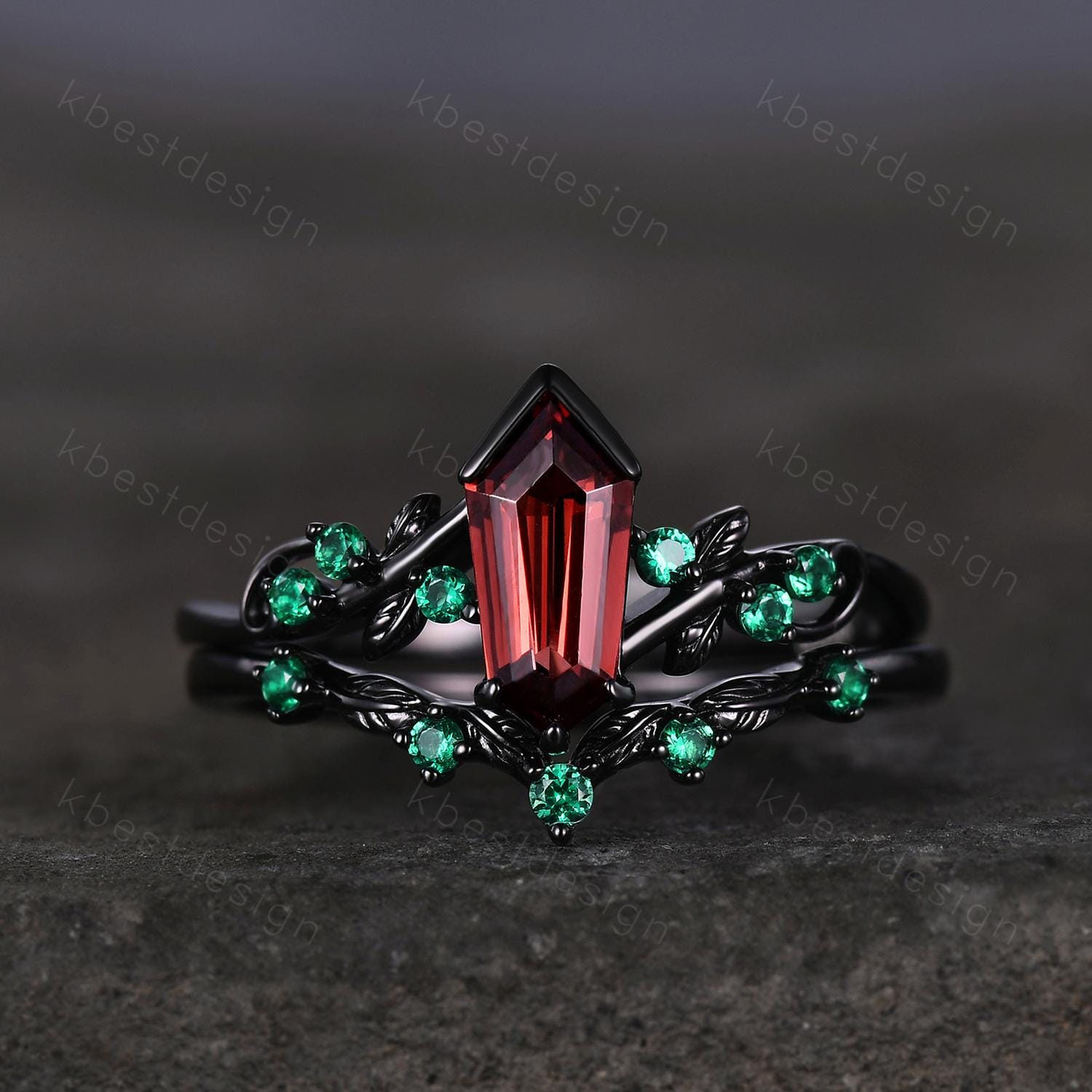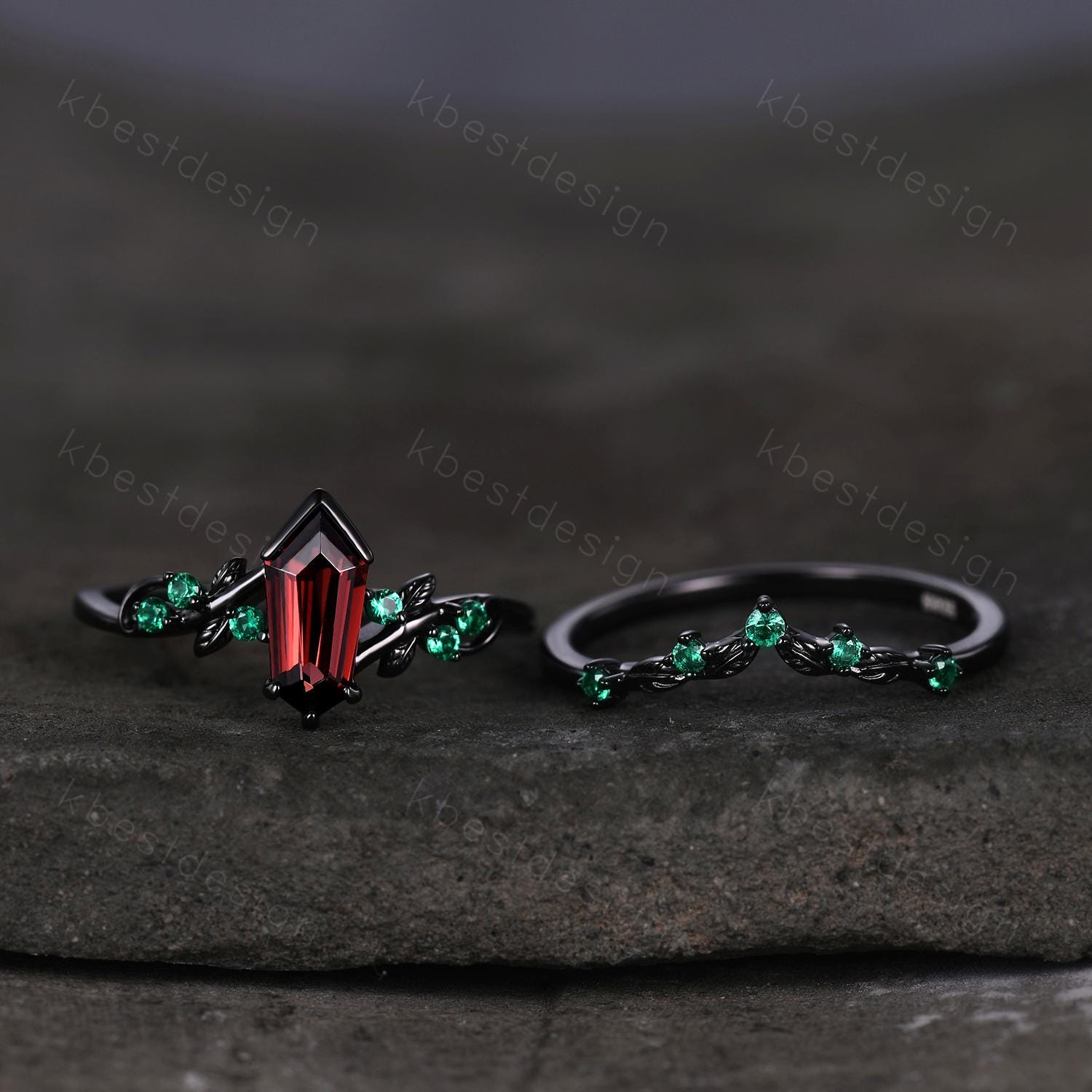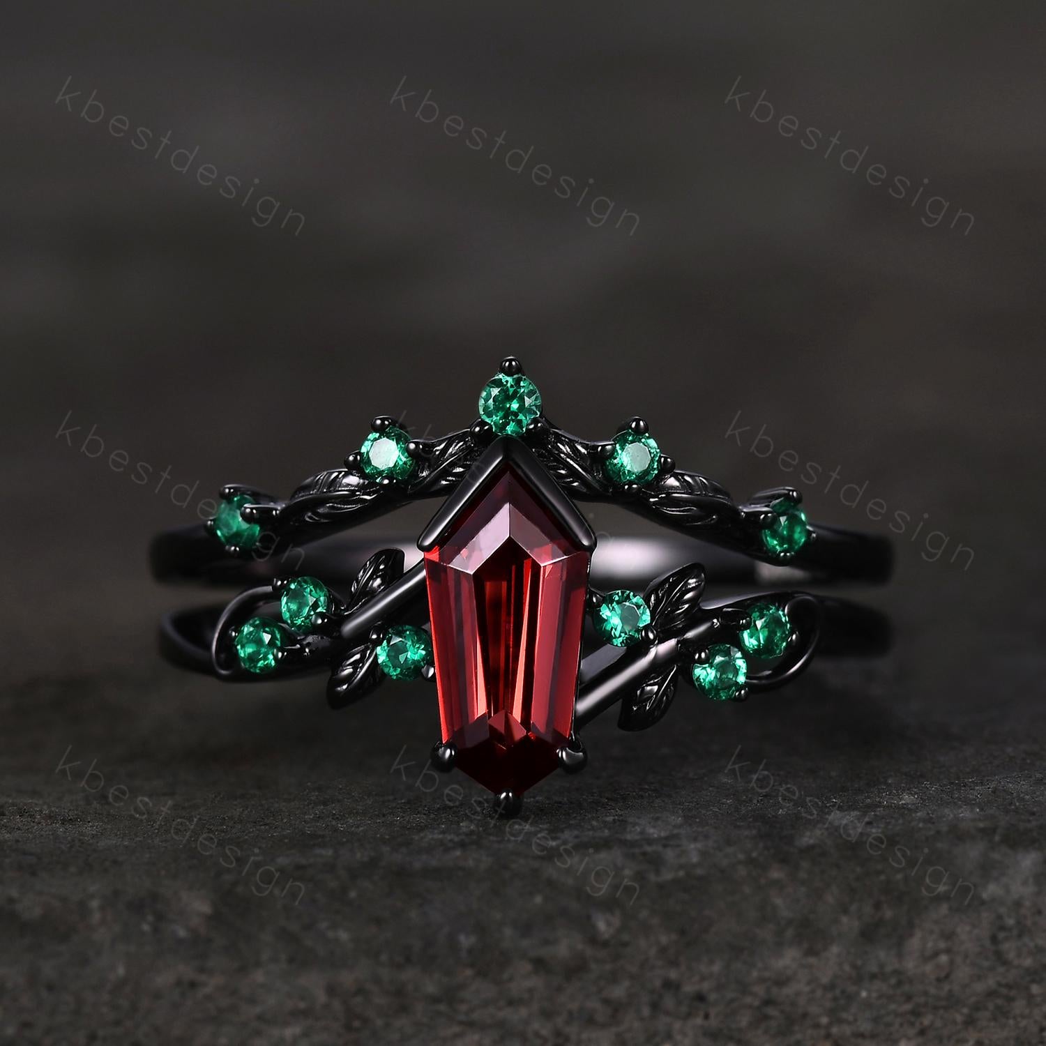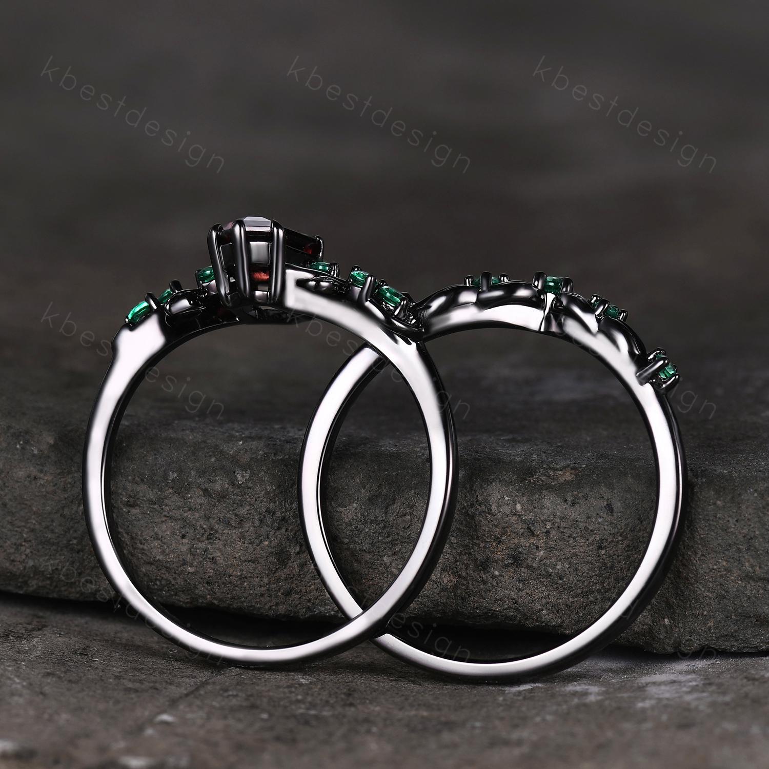 Vintage garnet engagement ring set black gold twig leaf emerald ring shield cut ring for women unique art deco bridal wedding ring set