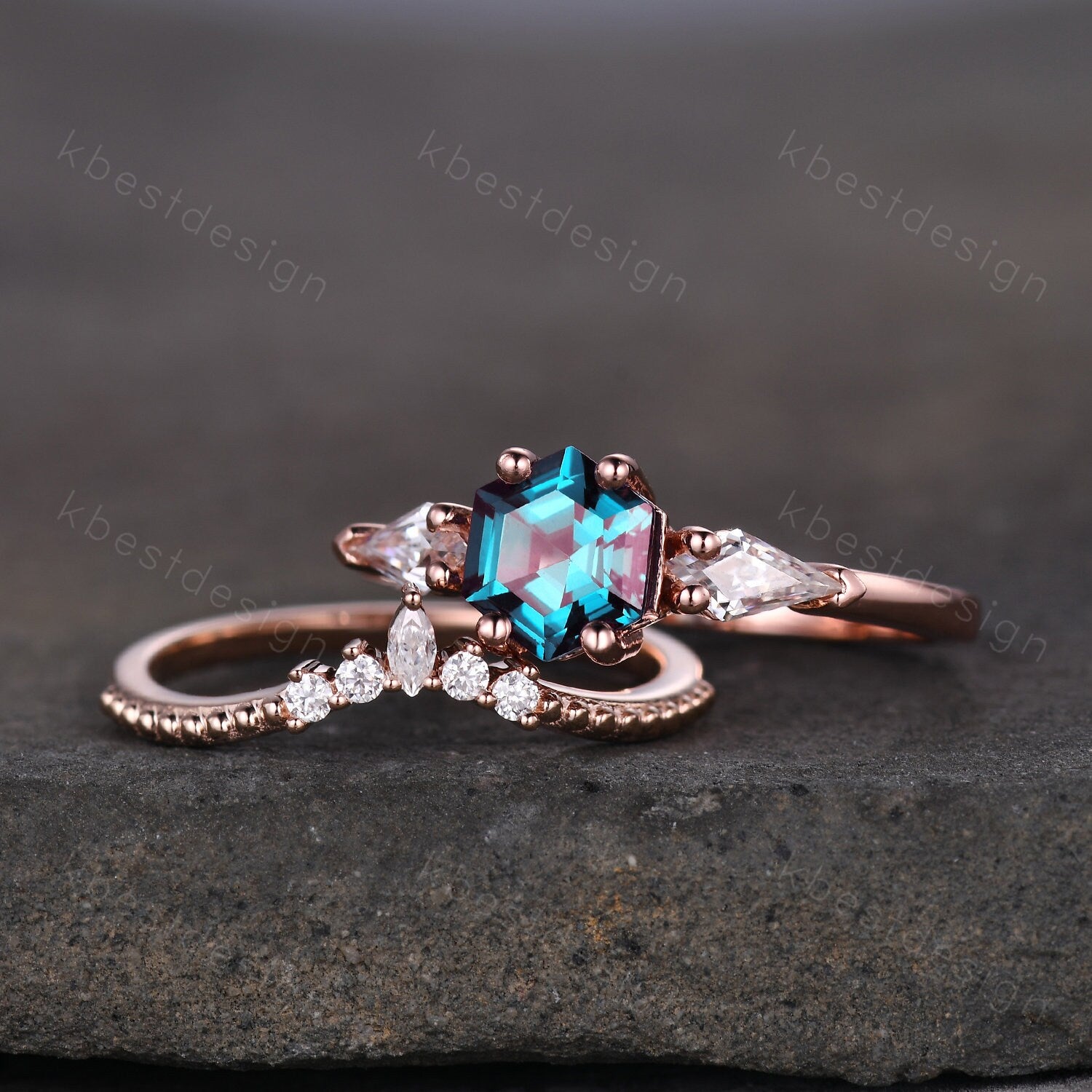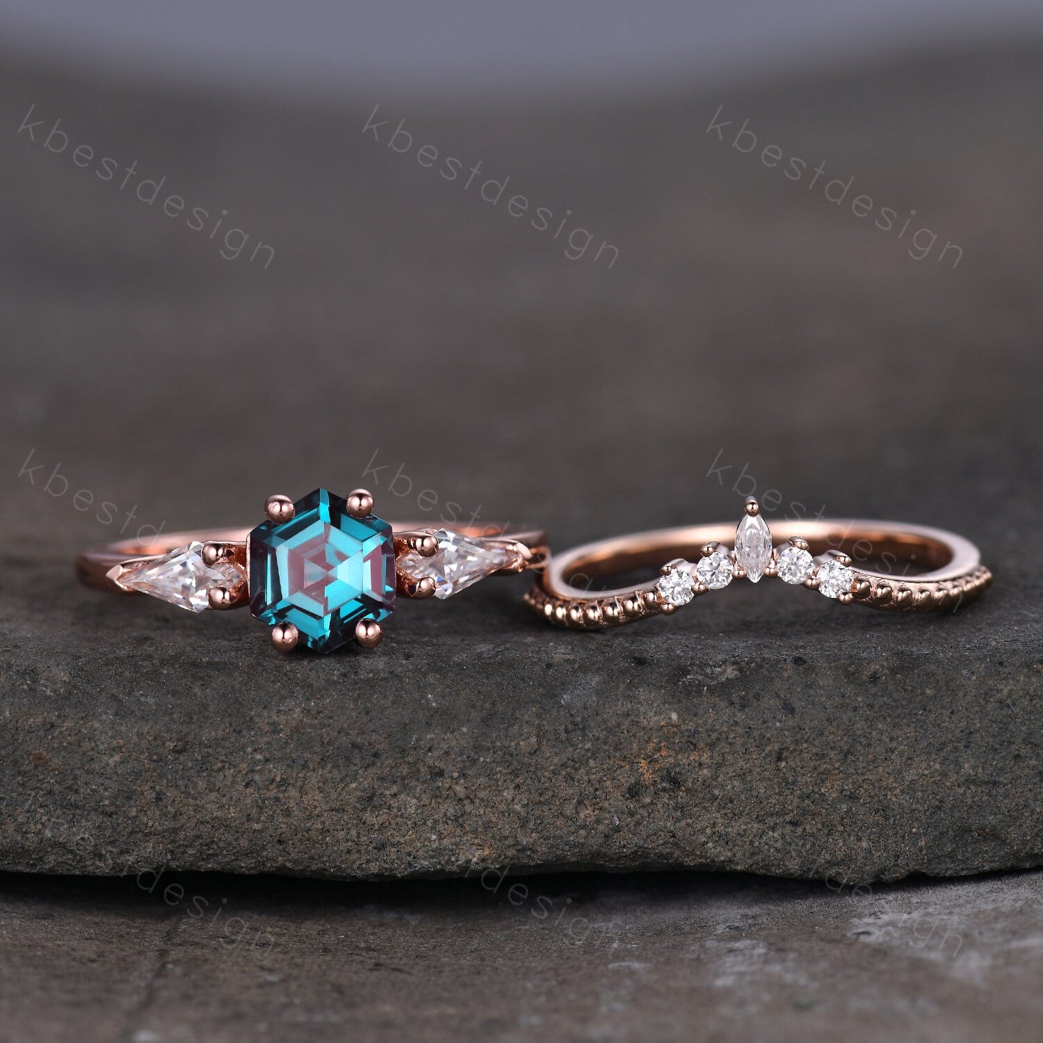 This is a Vintage Hexagon Alexandrite engagement ring set women rose gold ring kite cut Moissanite ring unique Personalized wedding bridal ring set.