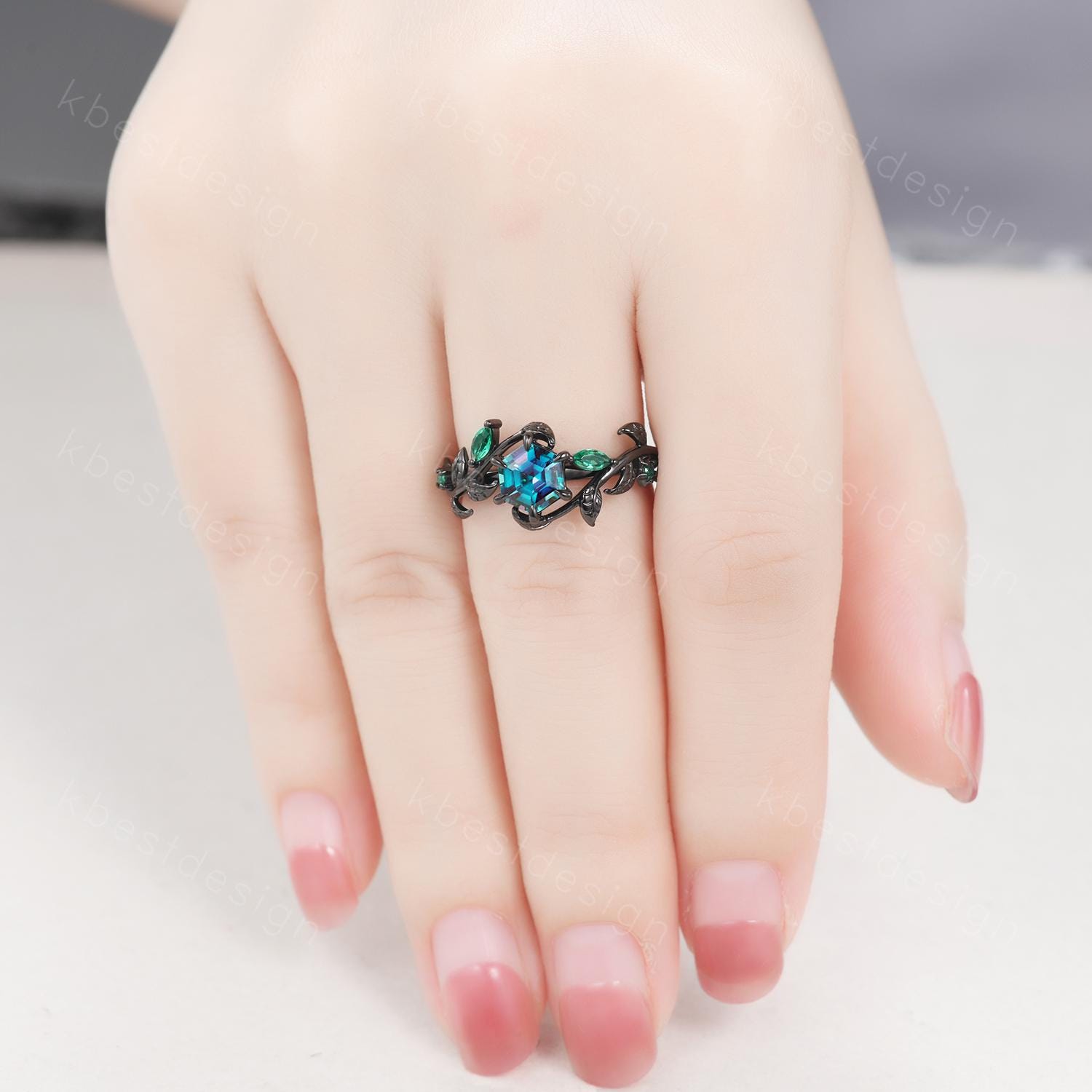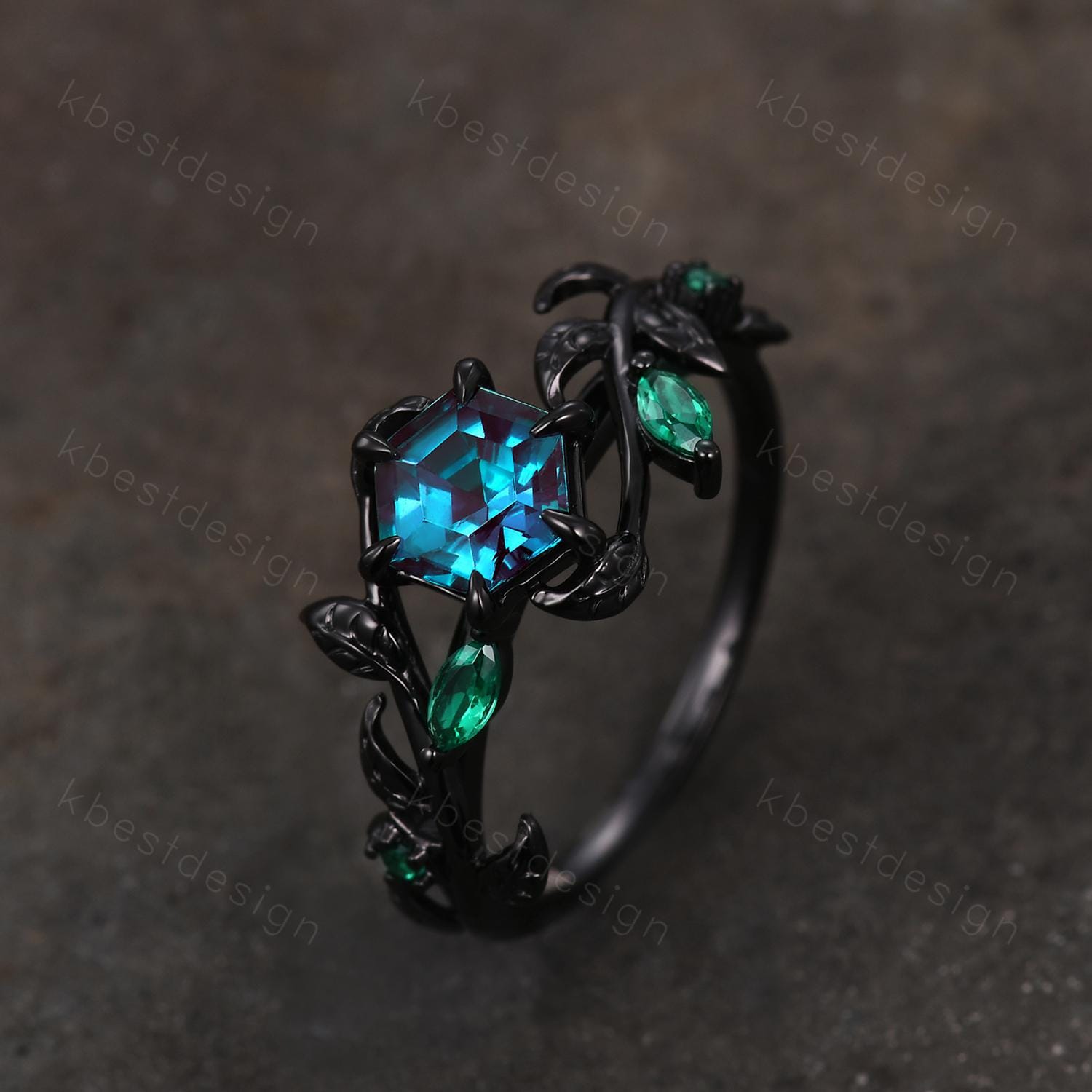 Vintage hexagon cut alexandrite engagement ring gothic black gold art deco emerald leaf ring nature inspired bridal promise ring for her