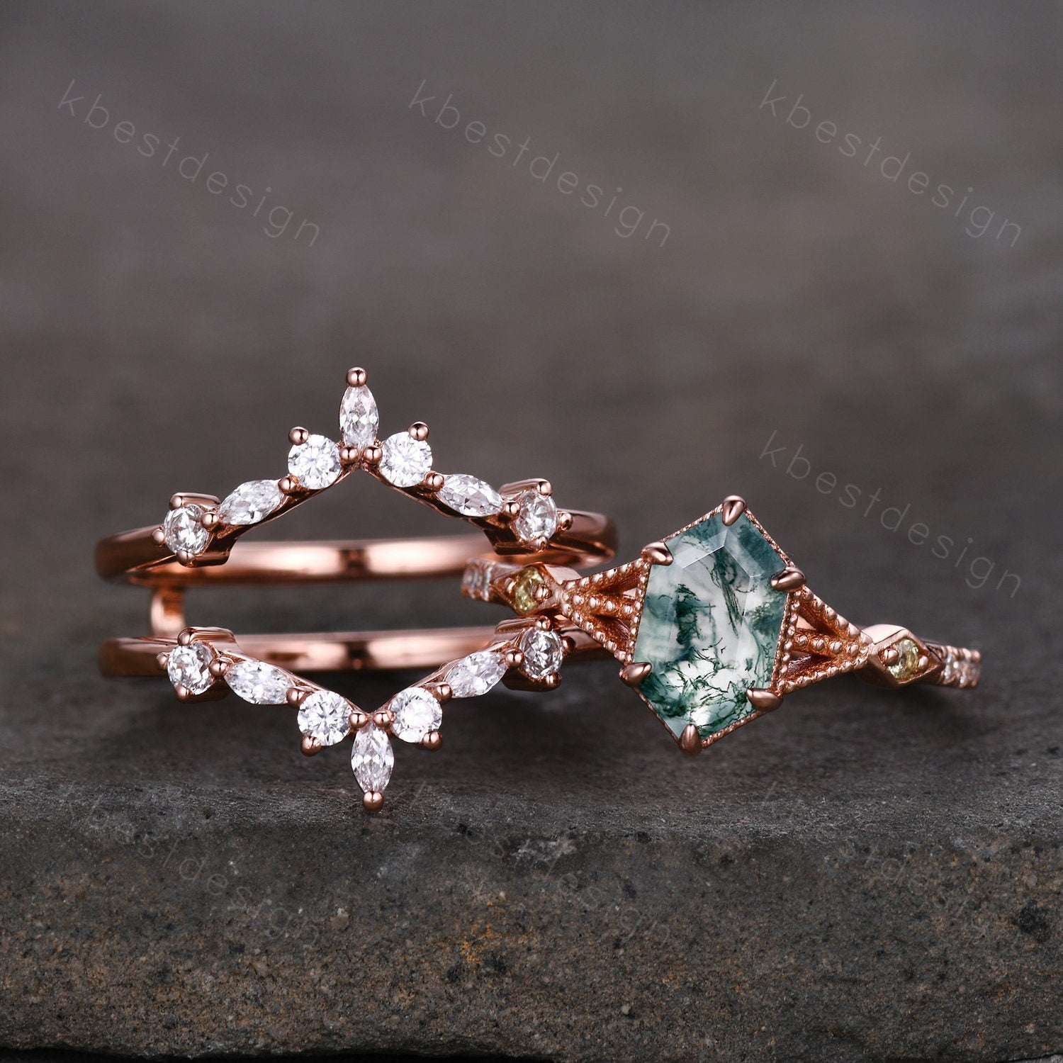 Vintage Hexagon cut Moss Agate Ring Rose Gold Engagement Ring Set Unique Double Curved Moissanite Band Art Deco Wedding Bridal Ring Set