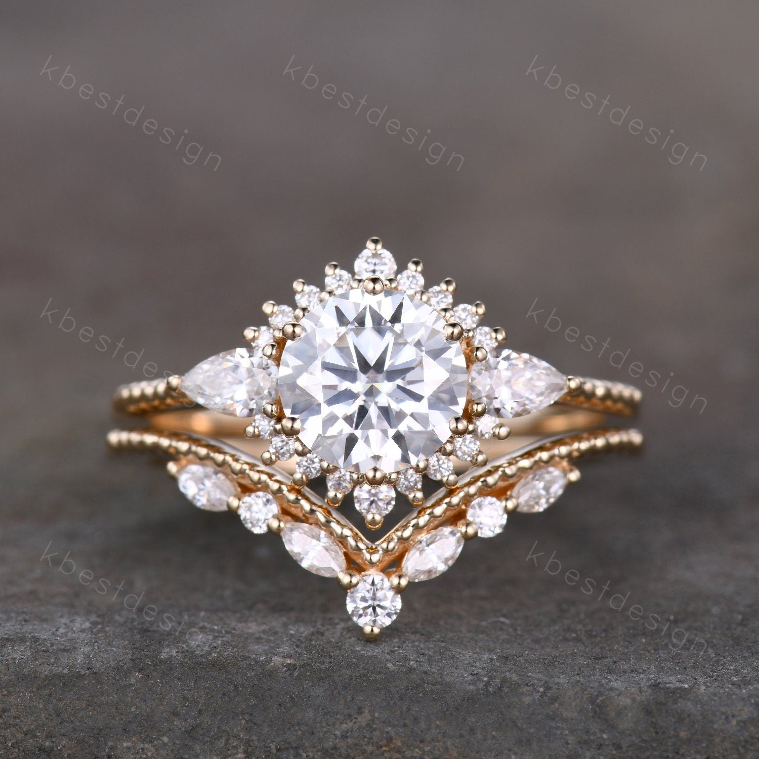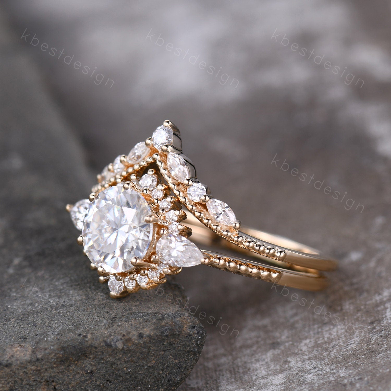 Vintage moissanite engagement ring set unique art deco moissanite bridal set solid gold ring for women moissanite stacking band Gift for her