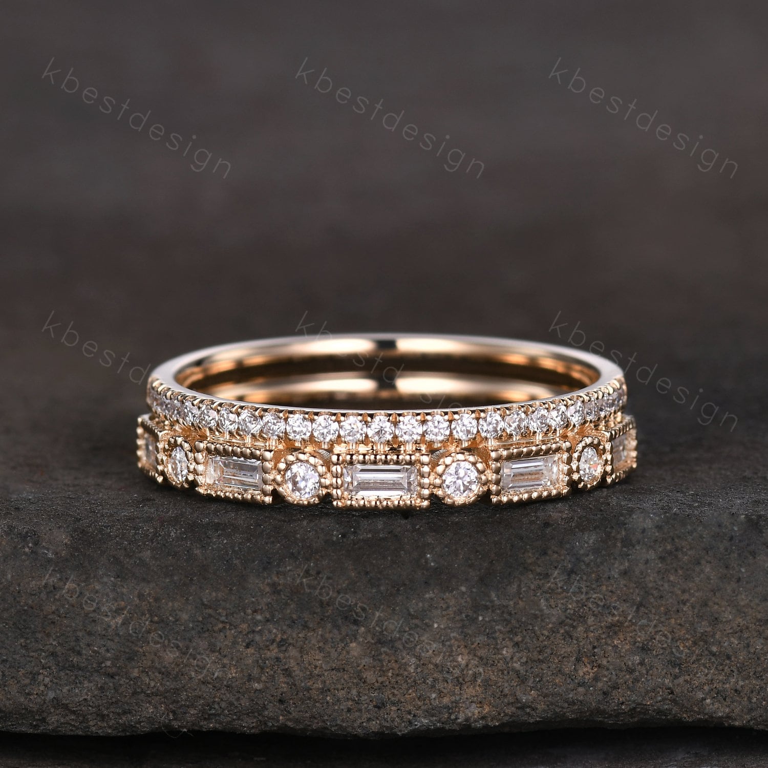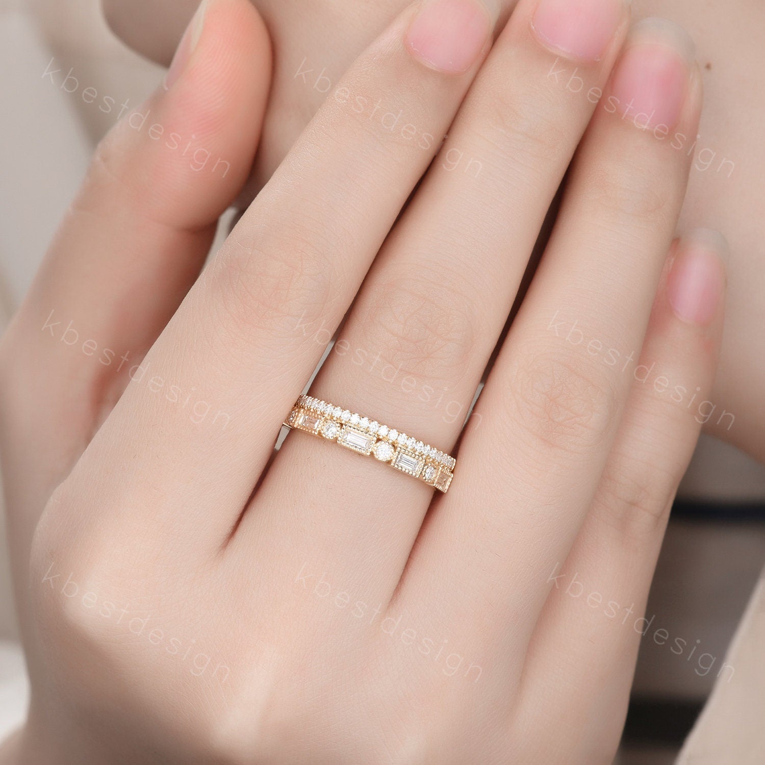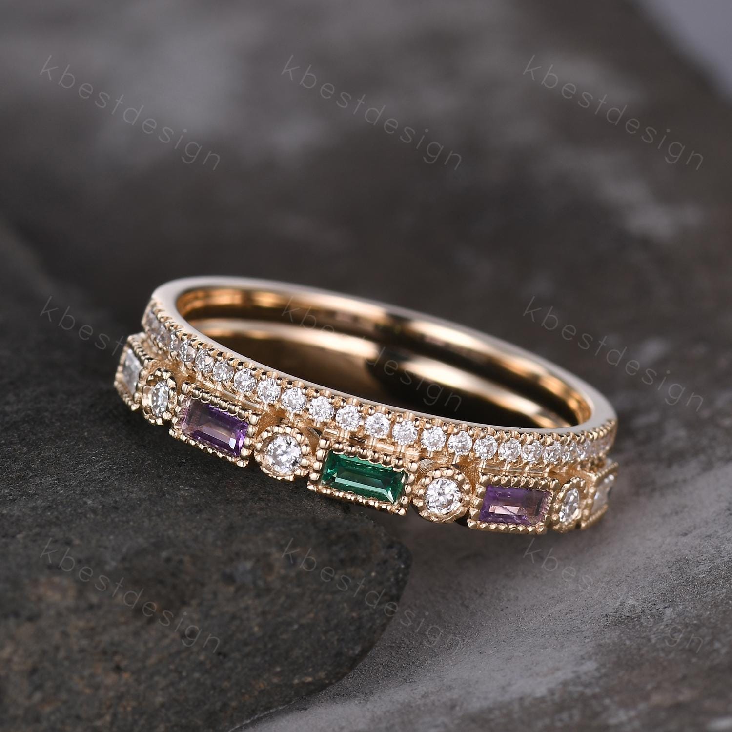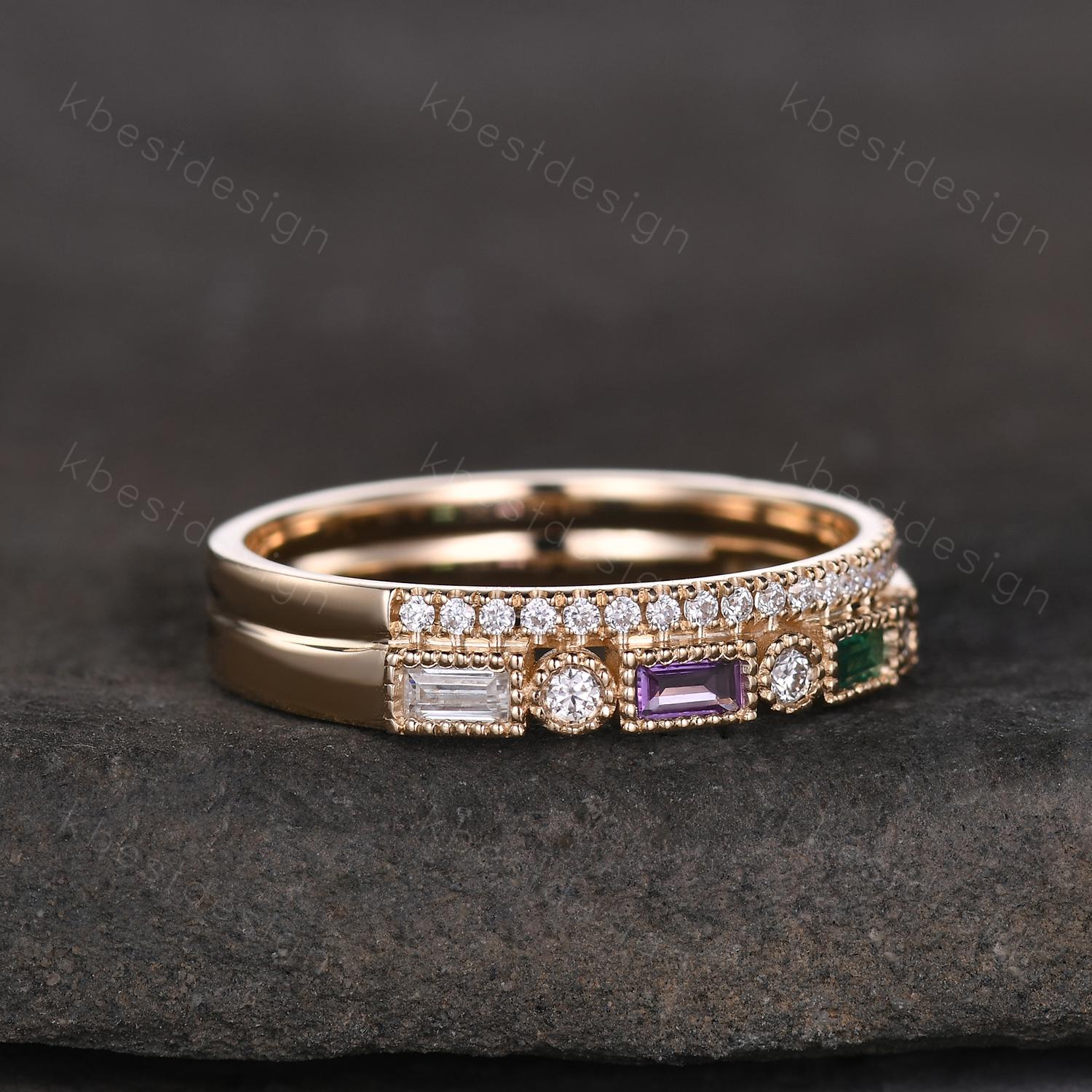 Vintage Moissanite wedding band women Baguette cut Emerald and Amethyst band Yellow gold band Unique Stacking Matching bridal promise ring
