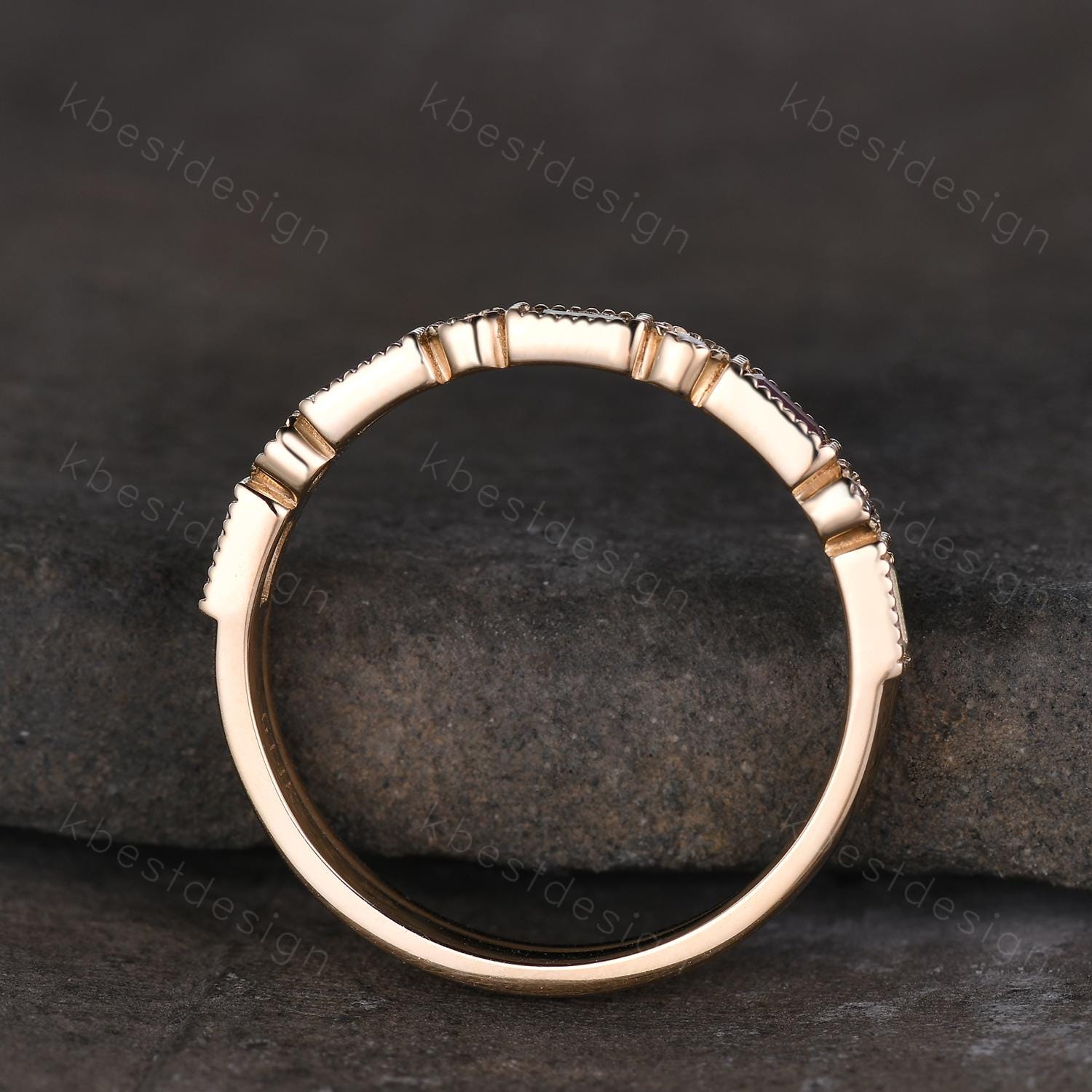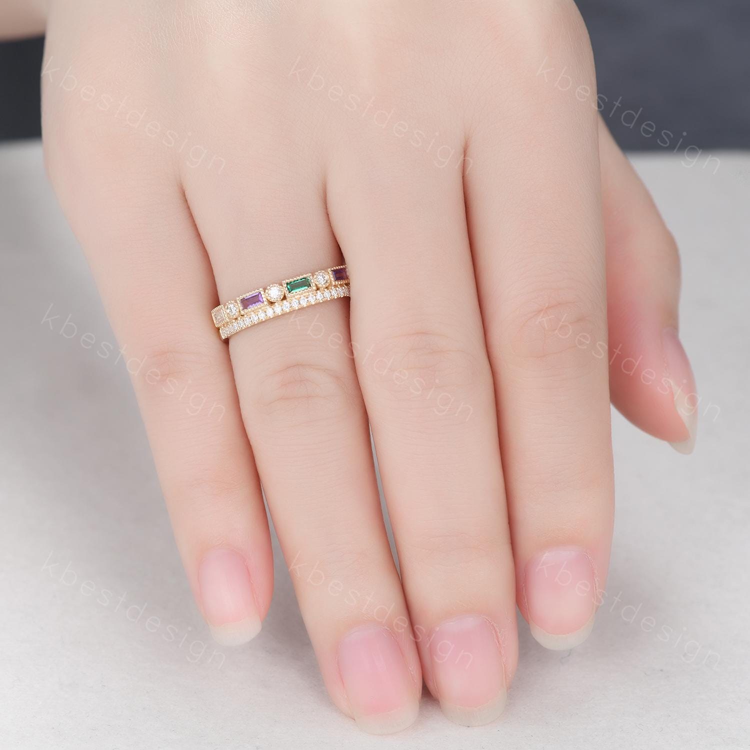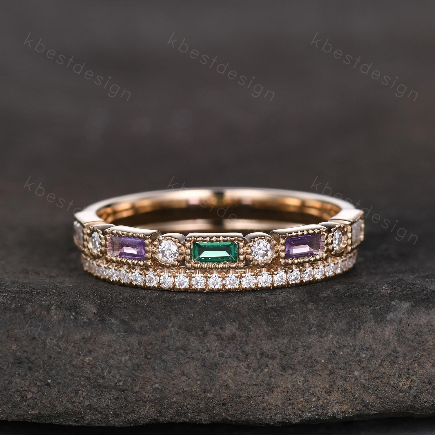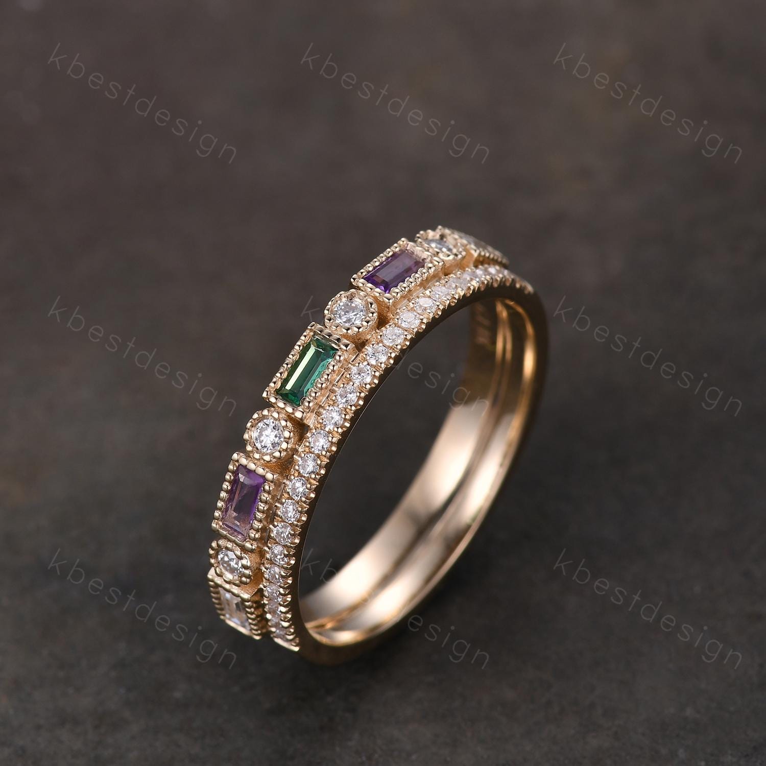 This is a baguette cut moissanite/amethyst/emerald wedding band in yellow gold. Vintage Moissanite wedding band women Baguette cut Emerald and Amethyst band Yellow gold band Unique Stacking Matching bridal promise ring