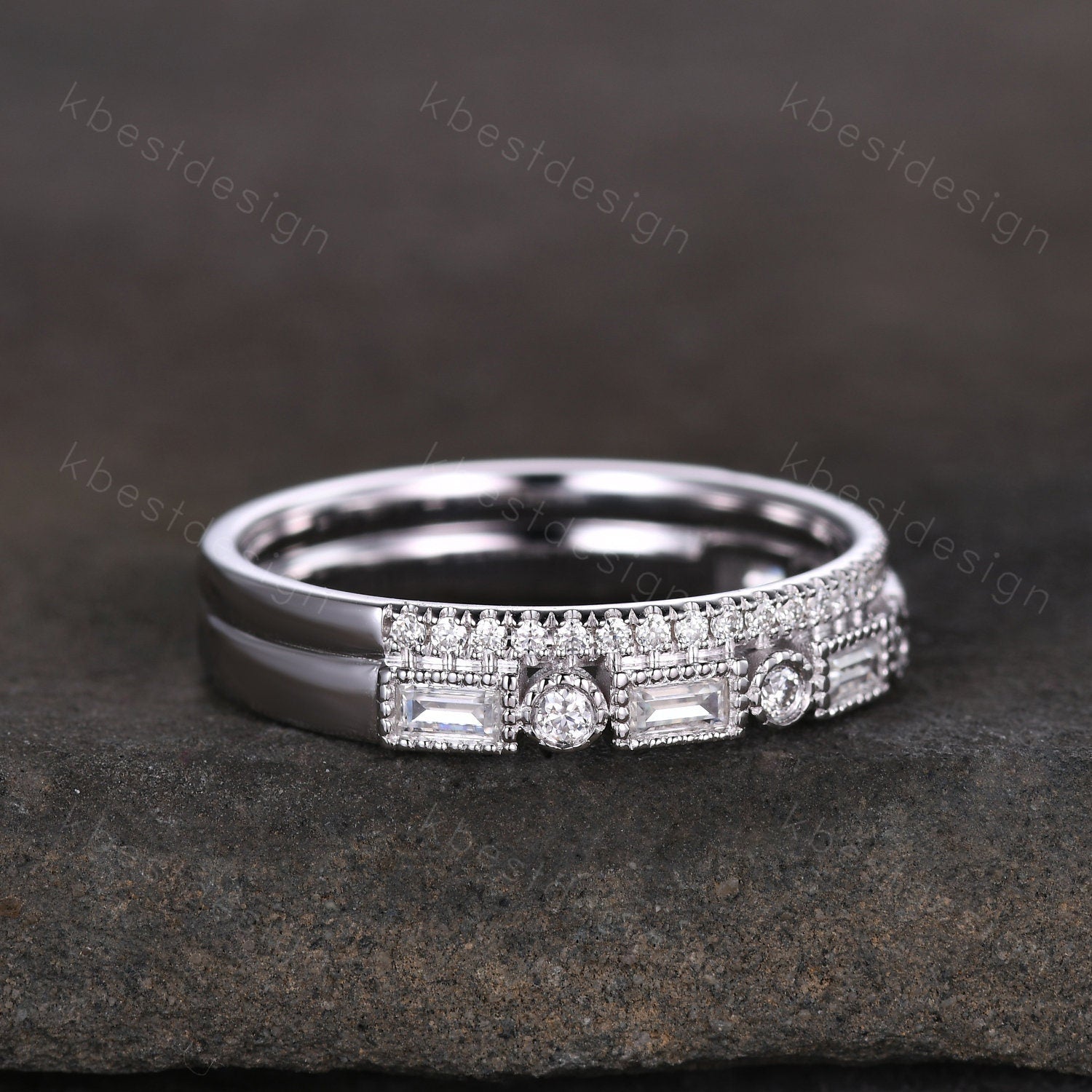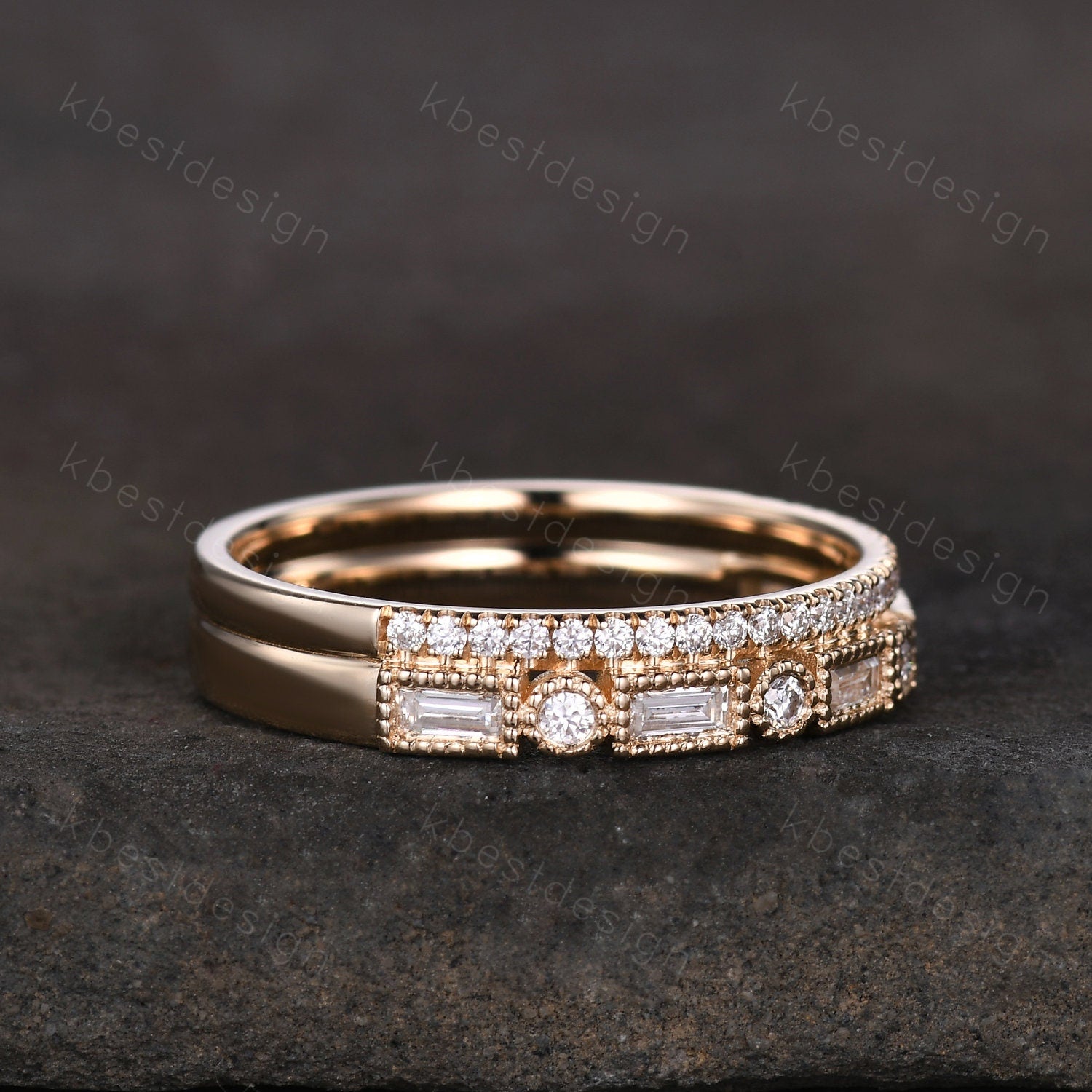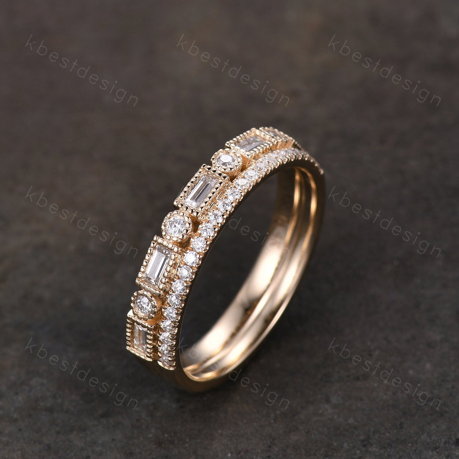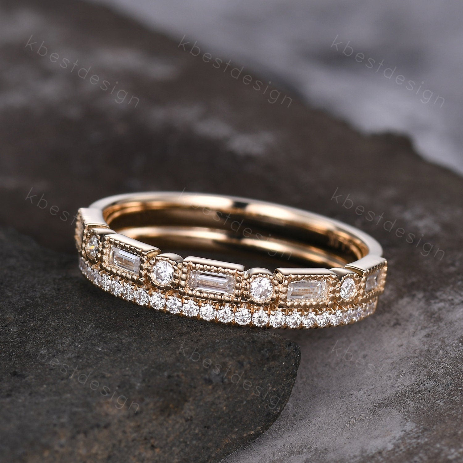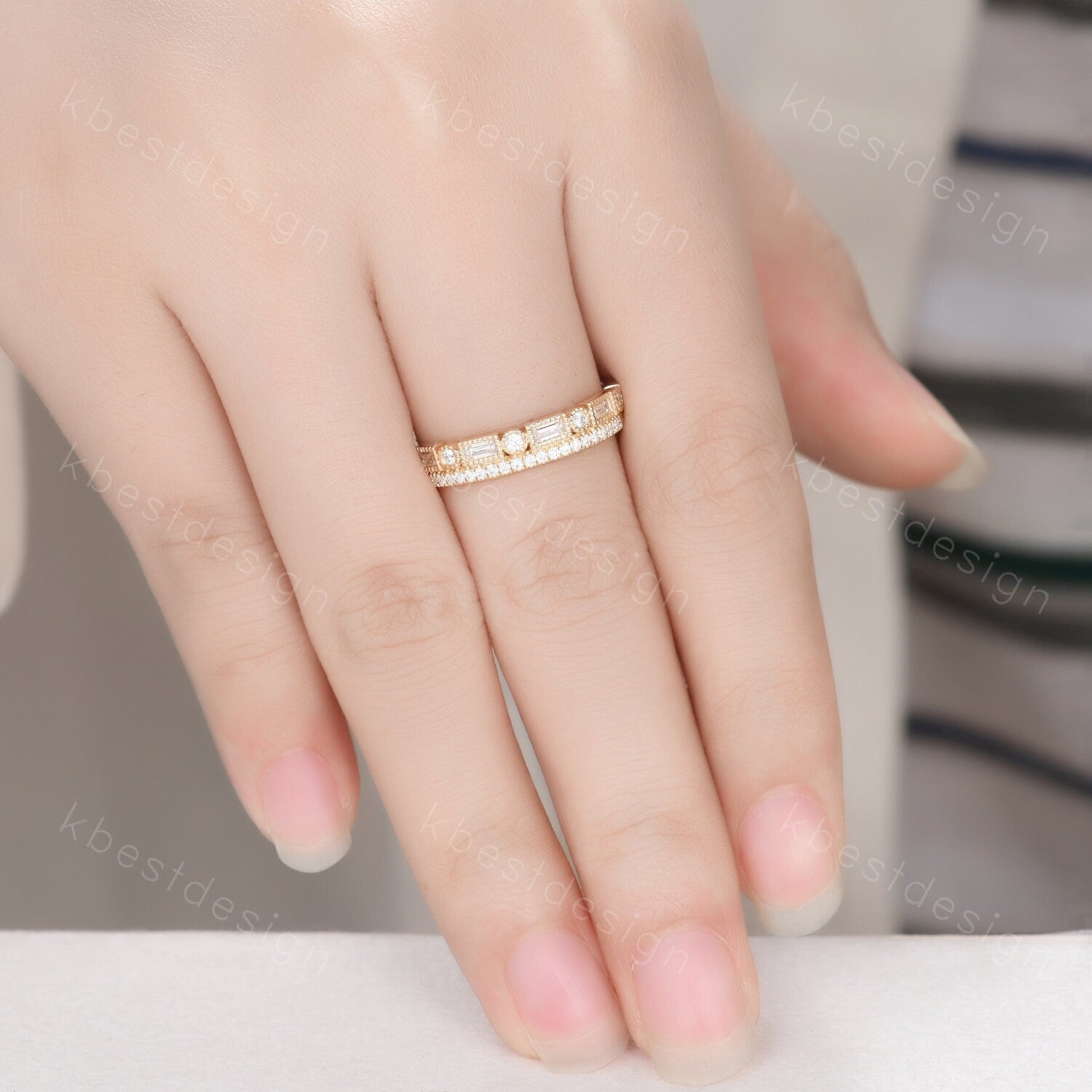 Vintage Moissanite wedding band women Baguette cut Half eternity band Yellow gold wedding band Unique Stacking Matching bridal promise ring